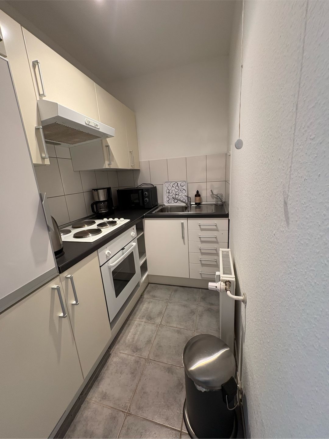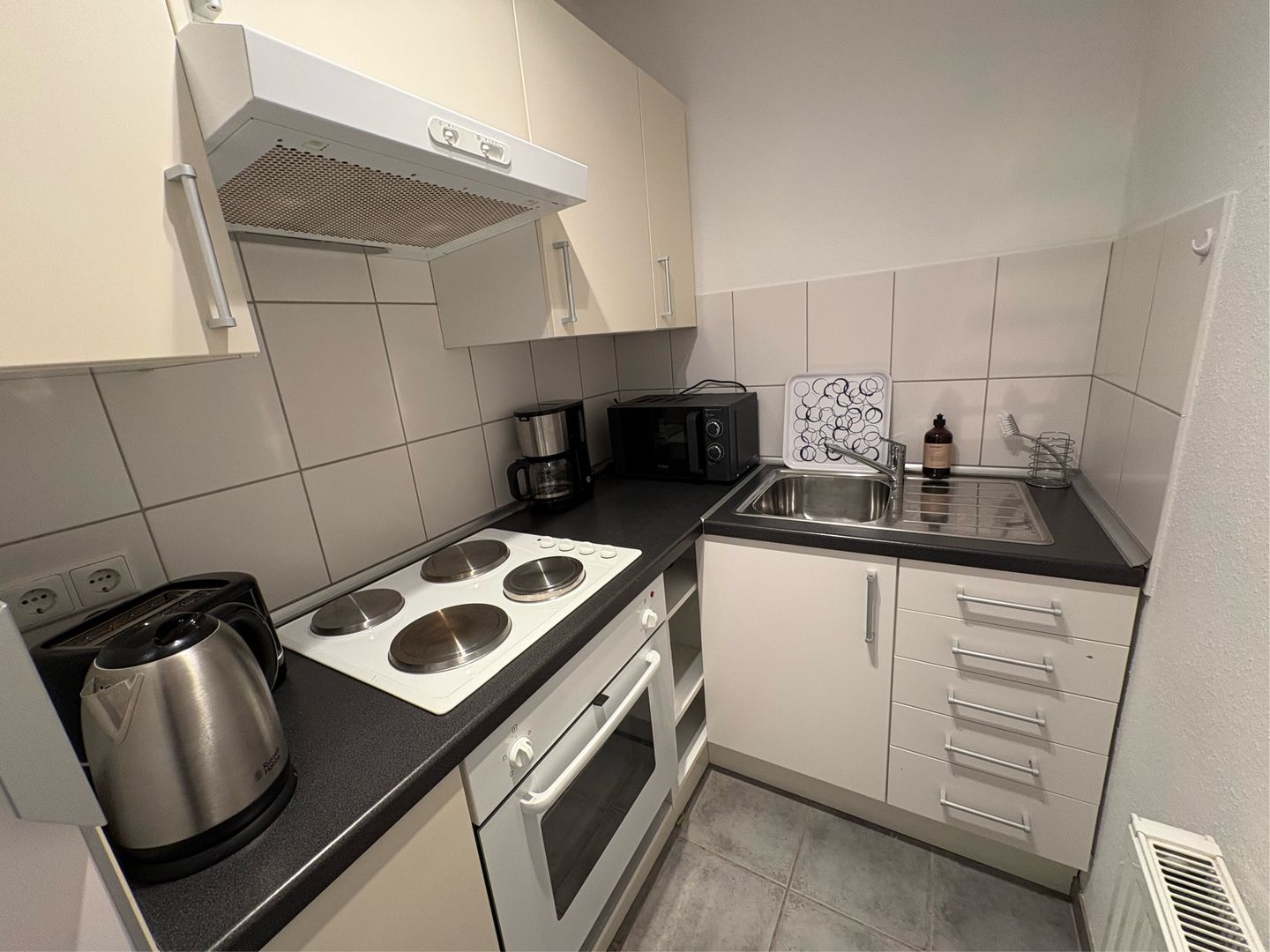 Die separate Küche ist bestens ausgestattet: Kaffeemaschine, Wasserkocher, Kühlschrank, Backofen, Mikrowelle und ein 4-Platten-Herd stehen für dich bereit. Geschirr, Besteck und alle wichtigen Küchenutensilien sind natürlich auch vorhanden. Für den Alltag findest du außerdem Bügeleisen, Bügelbrett, Staubsauger, Wäscheständer und Haartrockner.