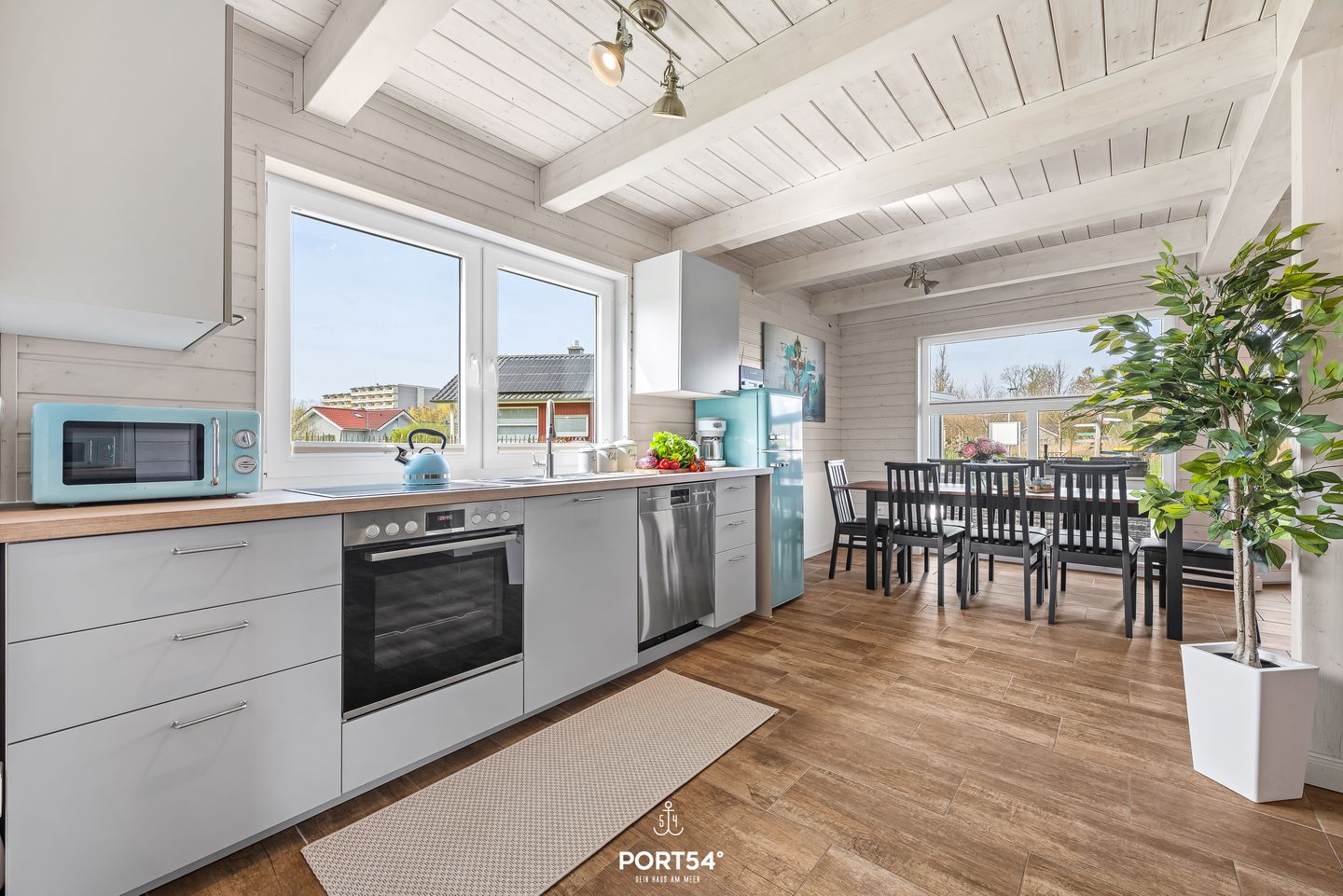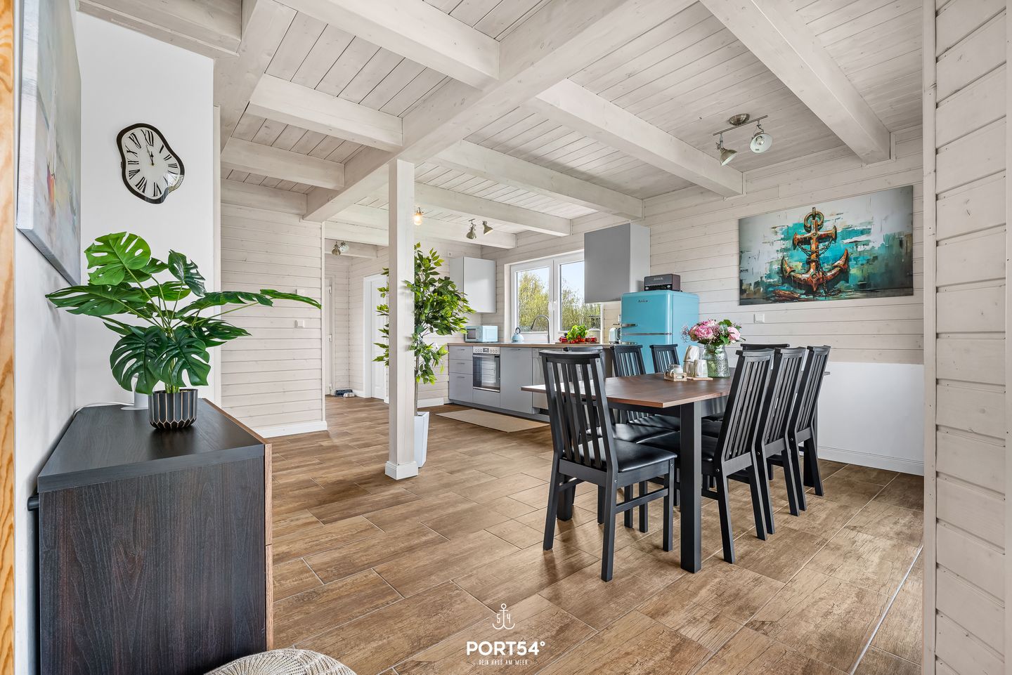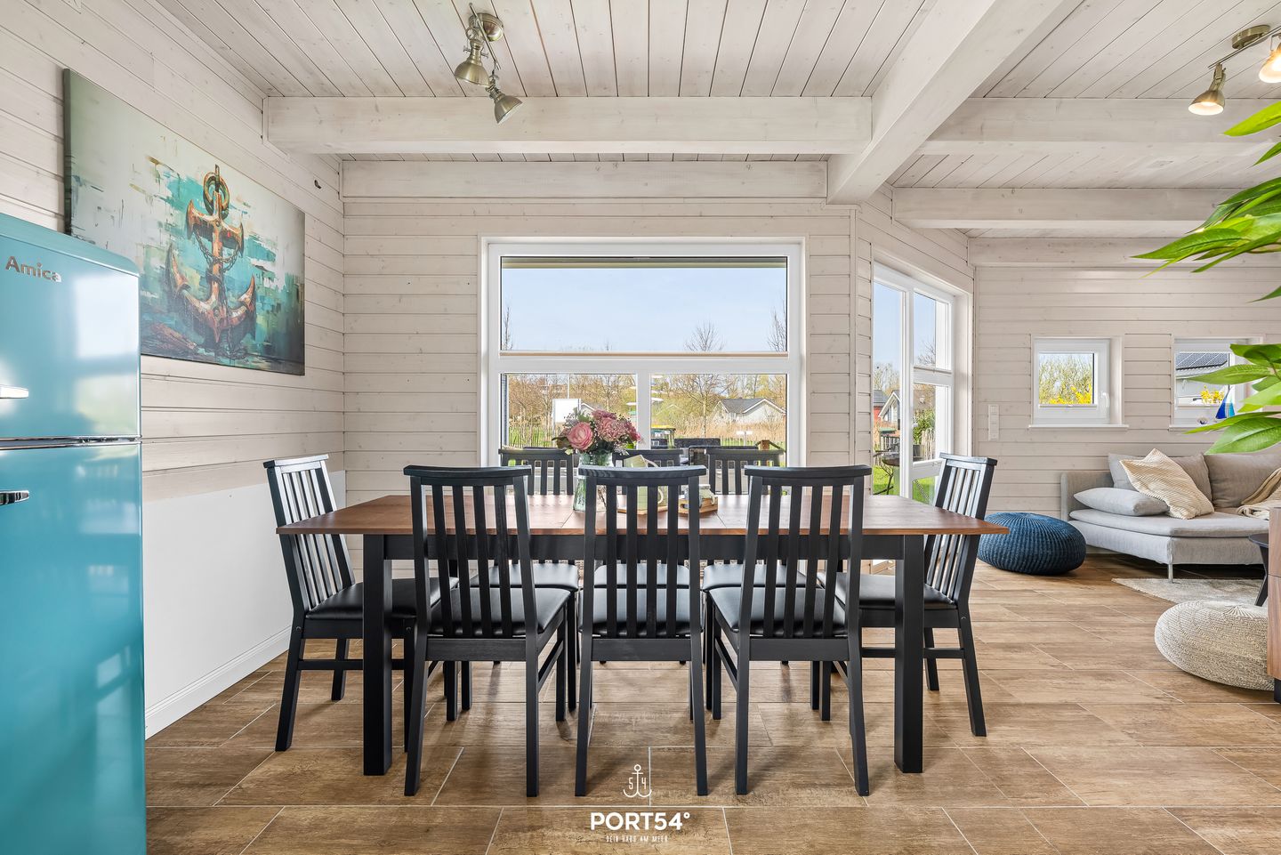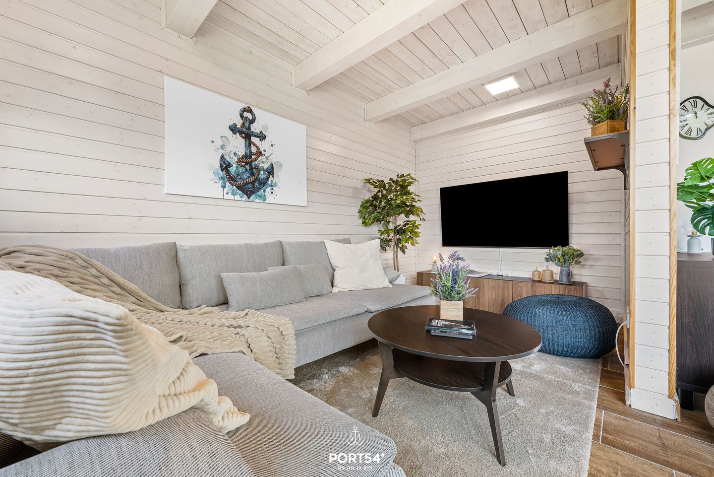 Im Innenbereich erwartet Sie eine wohnliche und komfortable Ausstattung. Das Wohnzimmer mit Ecksofa, 65-Zoll-TV und HiFi-Anlage schafft einen angenehmen Rahmen für gemeinsame Stunden. WLAN mit einer Internetgeschwindigkeit bis zu 100 Mbit/s ermöglicht auch während des Urlaubs komfortable Online-Nutzung. Der kontaktlose Check-in und Check-out sorgt für zusätzliche Flexibilität bei der An- und Abreise.