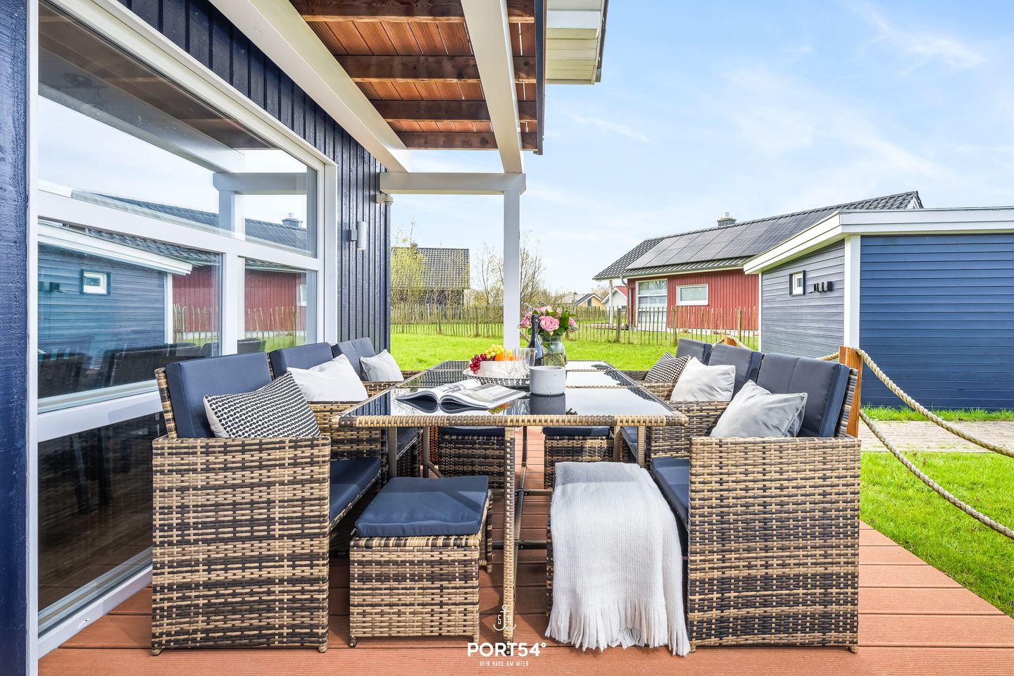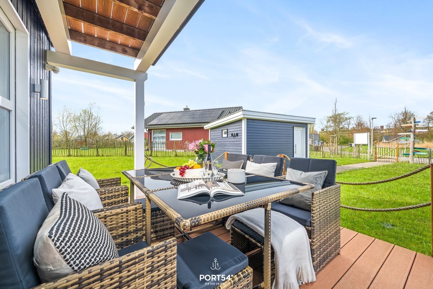 Auch der Außenbereich ist auf erholsame Urlaubstage ausgelegt. Auf dem 500 m² großen Grundstück finden Sie Garten, Liegewiese, Gartenmöbel, eine Terrasse, einen überdachten Balkon sowie ein Gartenhaus, in dem sich sicher Ihre Fahrräder abstellen und verschließen können. Ein Kohlegrill steht ebenfalls bereit. Sichtschutz an allen Fenstern unterstützt Ihre Privatsphäre zusätzlich.