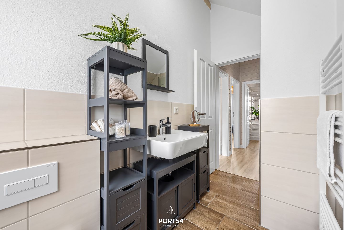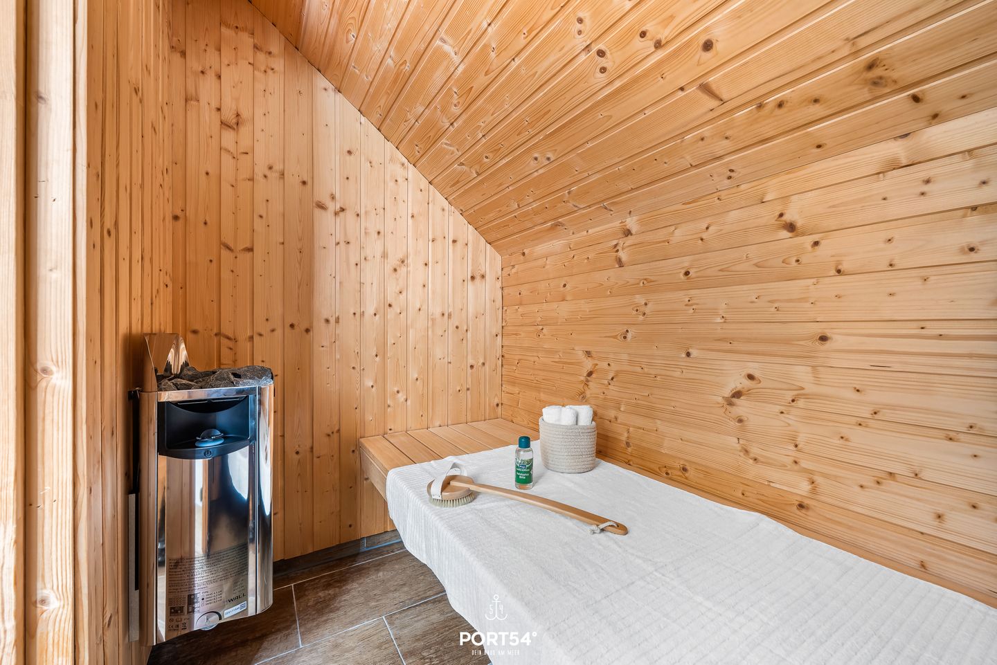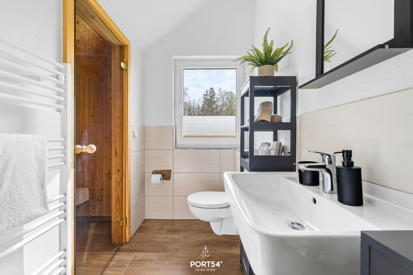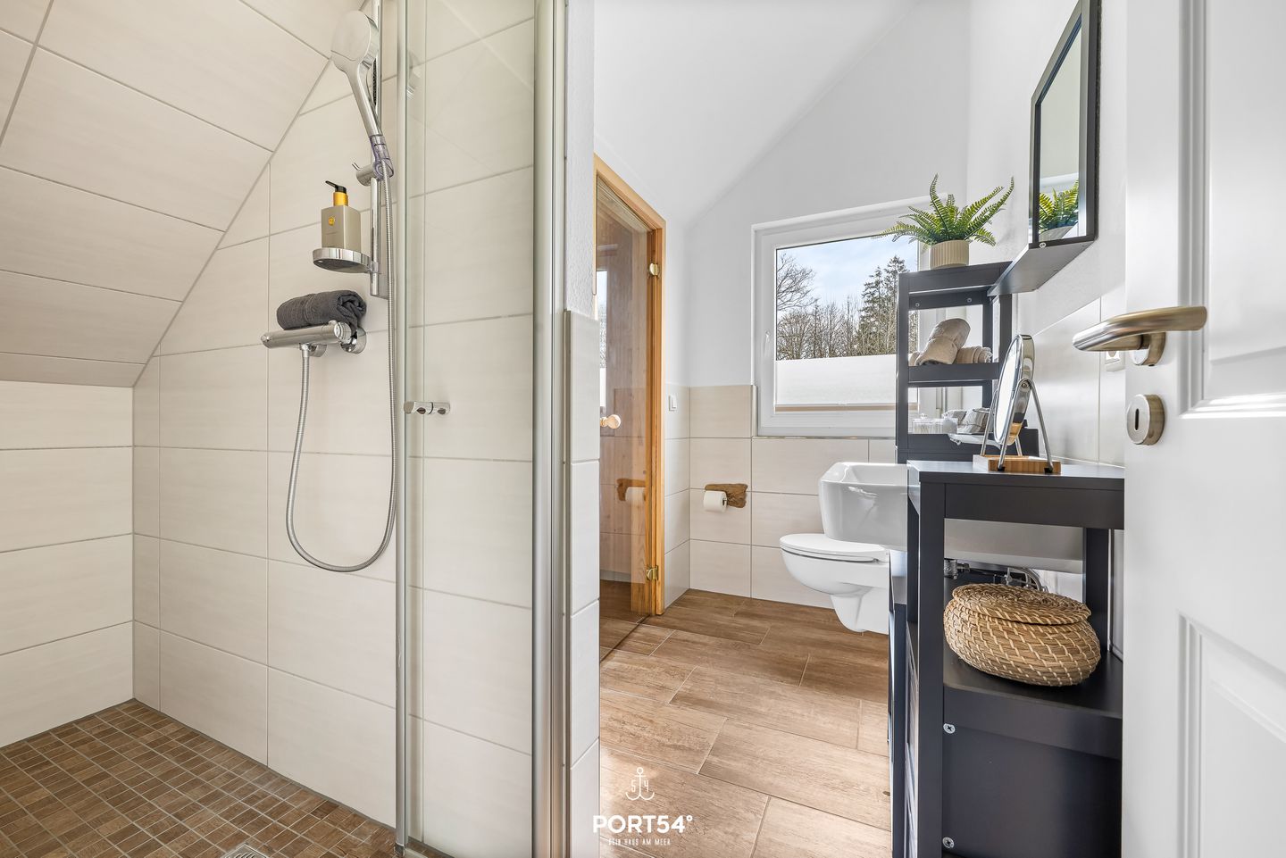 Das Ferienhaus verfügt über ein Badezimmer mit Fenster, bodengleicher Dusche, WC, Kosmetikspiegel und Haartrockner. Zusätzlich steht ein Gäste-WC zur Verfügung. Die Fußbodenheizung sorgt in allen Jahreszeiten für ein angenehmes Wohnklima. Eine Sauna zur Eigennutzung ergänzt den Aufenthalt um einen privaten Wellnessbereich.