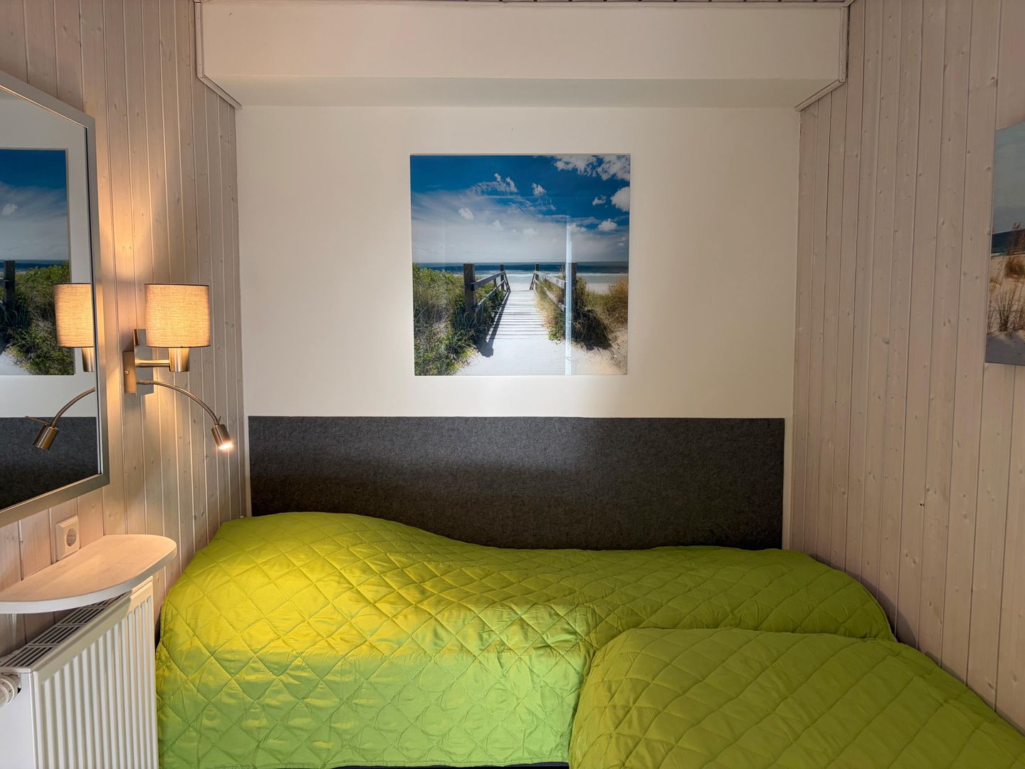 Über die Treppe erreichst du das Erdgeschoß. Das Herzstück im Erdgeschoß ist das kleine aber feine Wellness-Bad mit einer Trockensauna. Freu dich auf die bodentiefe Regendusche. Ein Badschrank mit Schubladen für Ihre Kosmetikartikel befindet sich unter dem Waschbecken. Ebenfalls im Erdgeschoss befinden sich zwei Schlafzimmer: Das Erste liegt zur Seeseite. Es verfügt über bodentiefe Fenster, einen wunderschönen Blick in den Strandgarten und eine geräumige Terrasse. Du schläfst in zwei nebeneinander stehenden, bequemen Einzel-Boxspringbetten (zusammen 180x200cm). Im diesem Schlafzimmer befindet sich ein Fernseher, die Fenster verfügen über Verdunkelungsvorhänge für einen ungestörten Schlaf. Das andere Schlafzimmer verfügt ebenfalls über zwei Einzel- Boxspringbetten (je 90x200cm), sie stehen über Eck. Ein Verdunkelungsrollo sorgt für erholsamen Schlaf. Dieses Zimmer hat eine große Tür, die nach draußen auf die Holzdielen führt. Im Außenbereich befinden sich mehrere Sitzmöglichkeiten mit und ohne Tisch, ein Sonnenschirm, Sonnenliegen sowie ein hochwertiger Holzkohlegrill.