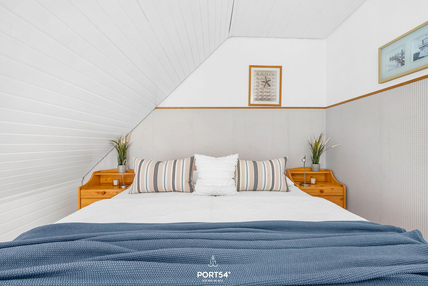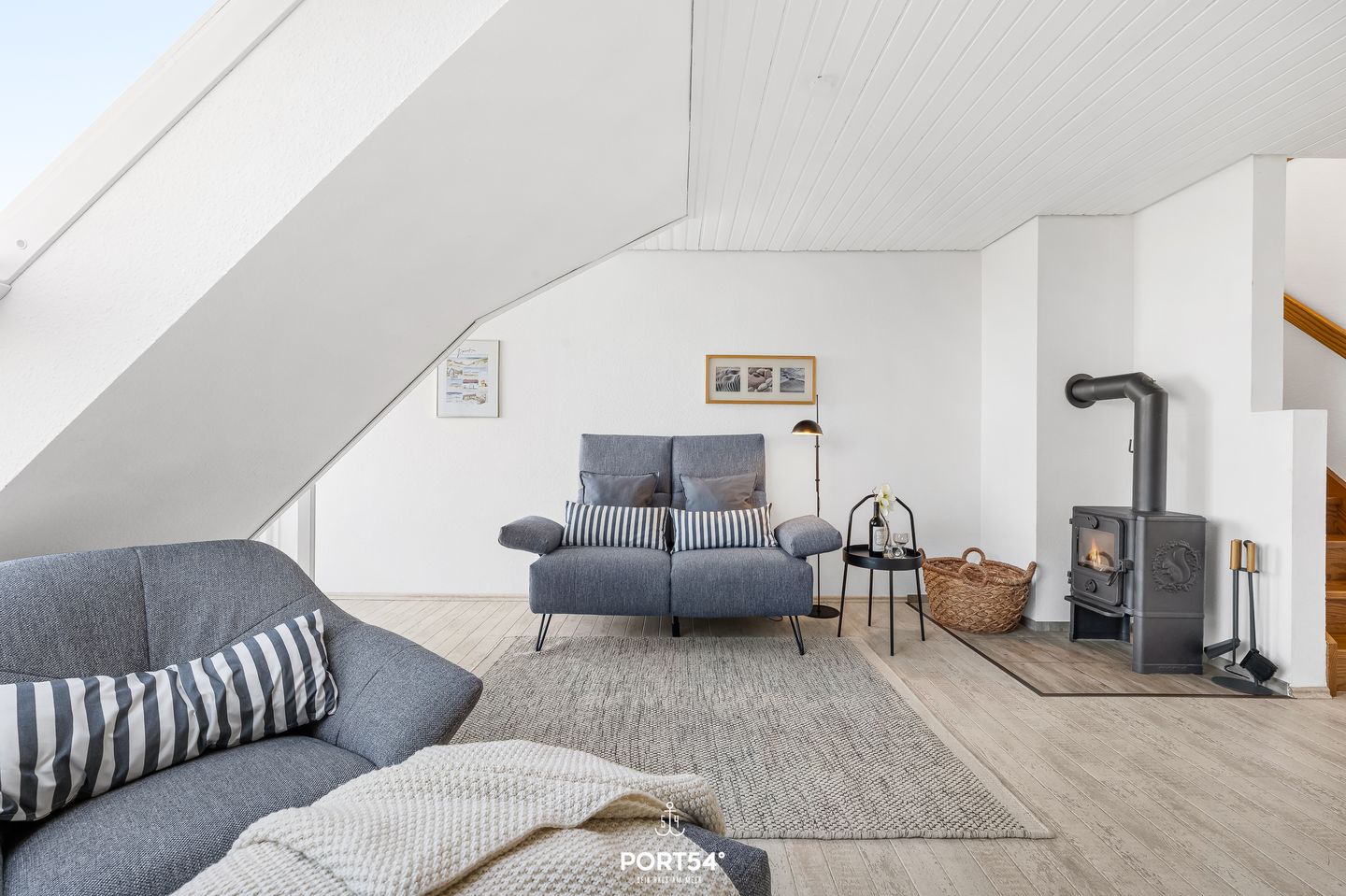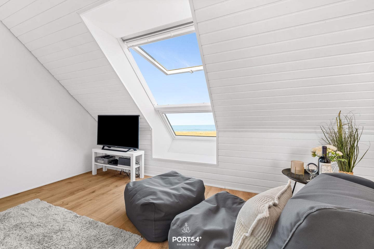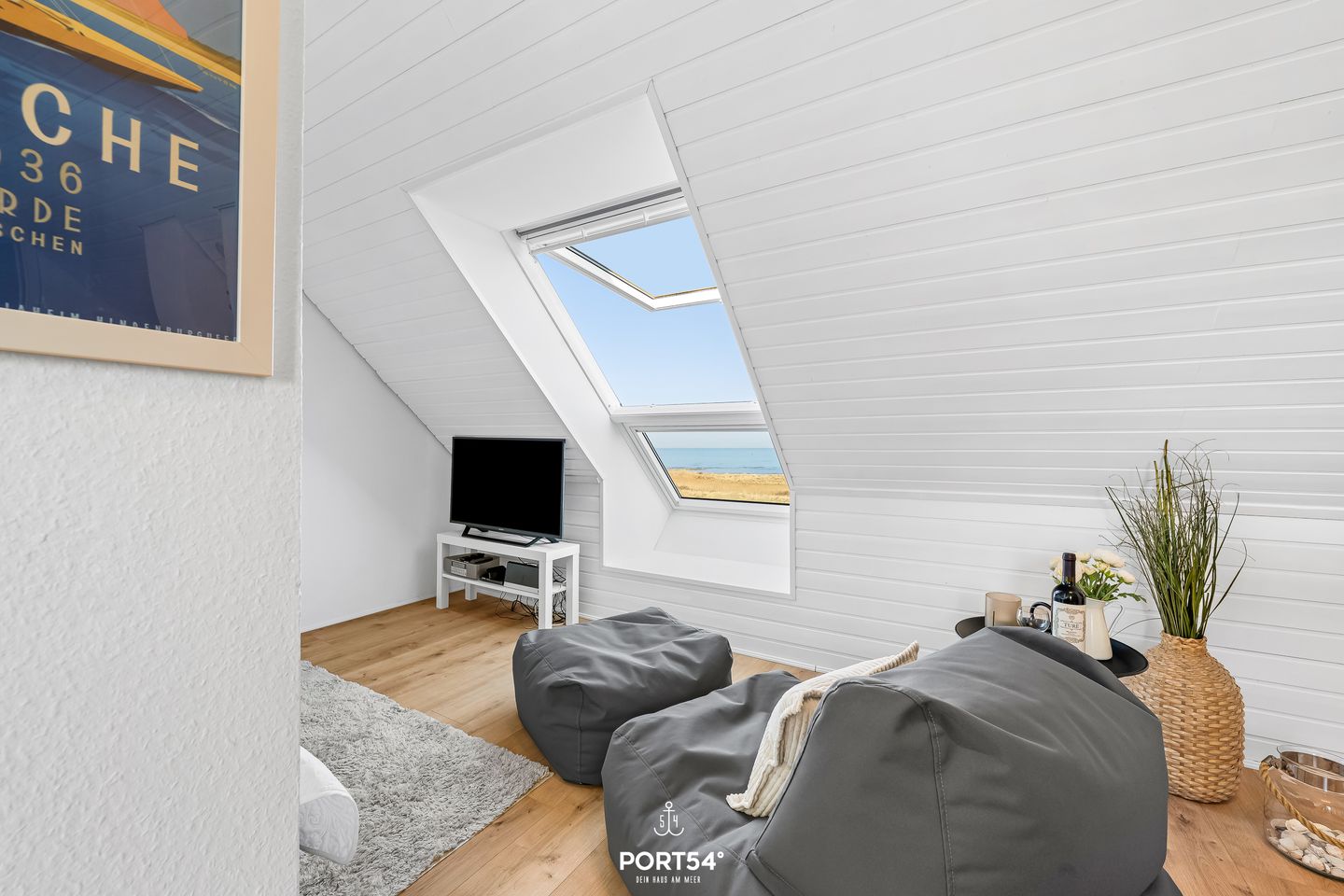 Die Wohnung ist mit schnellem WLAN-Internet ausgestattet und verfügt über zwei Schlafzimmer, jeweils mit Doppelbett, ein im Dezember 2023 vollständig renoviertes modernes Duschbad und ein Wohnzimmer mit Küchenzeile, die mit einem Elektroherd mit Cerankochfeld und einem Geschirrspüler ausgestattet ist. Das Schlafzimmer im Dachgeschoss ist für Kleinkinder zu nutzen; die Treppe nach unten kann mit einem Gitter gesichert werden. Oben befindet sich ein mit einem zur Ostsee ausgerichteten großen Fenster ausgestattetes Extrazimmer mit Doppelbett, Flachbildernseher mit DVB/T2-HD-Empfang/Apple-TV und einem Lounge-Sessel, so dass Sie aussuchen können, wo Sie schlafen und relaxen möchten. Vorhanden sind außerdem ein großer moderner Smart-TV mit Satellitenempfang und ein Radio. Der zur Ostsee hin ausgerichtete, mit Holzbohlen belegte Balkon kann zur Hälfte genutzt werden und ist mit einem kleinem Tisch und 2 Gartenstühlen möbliert. Münz- Waschmaschine und Münz-Trockner sind im Haus vorhanden.