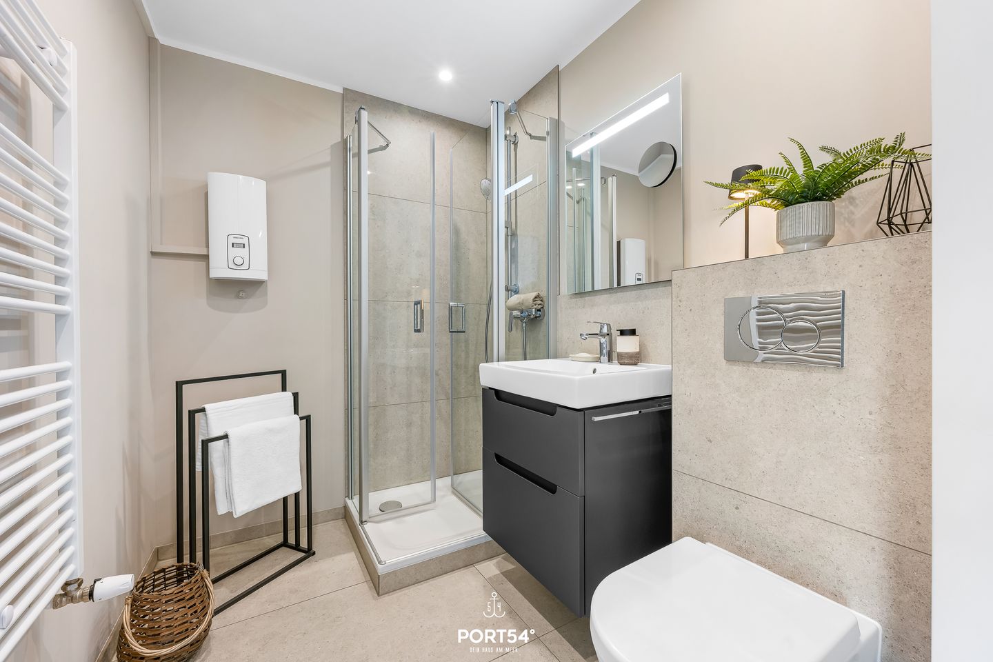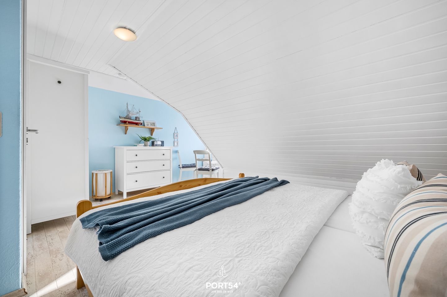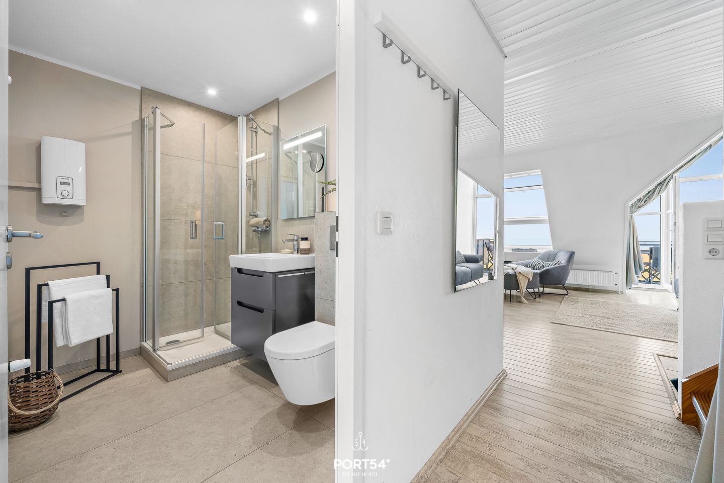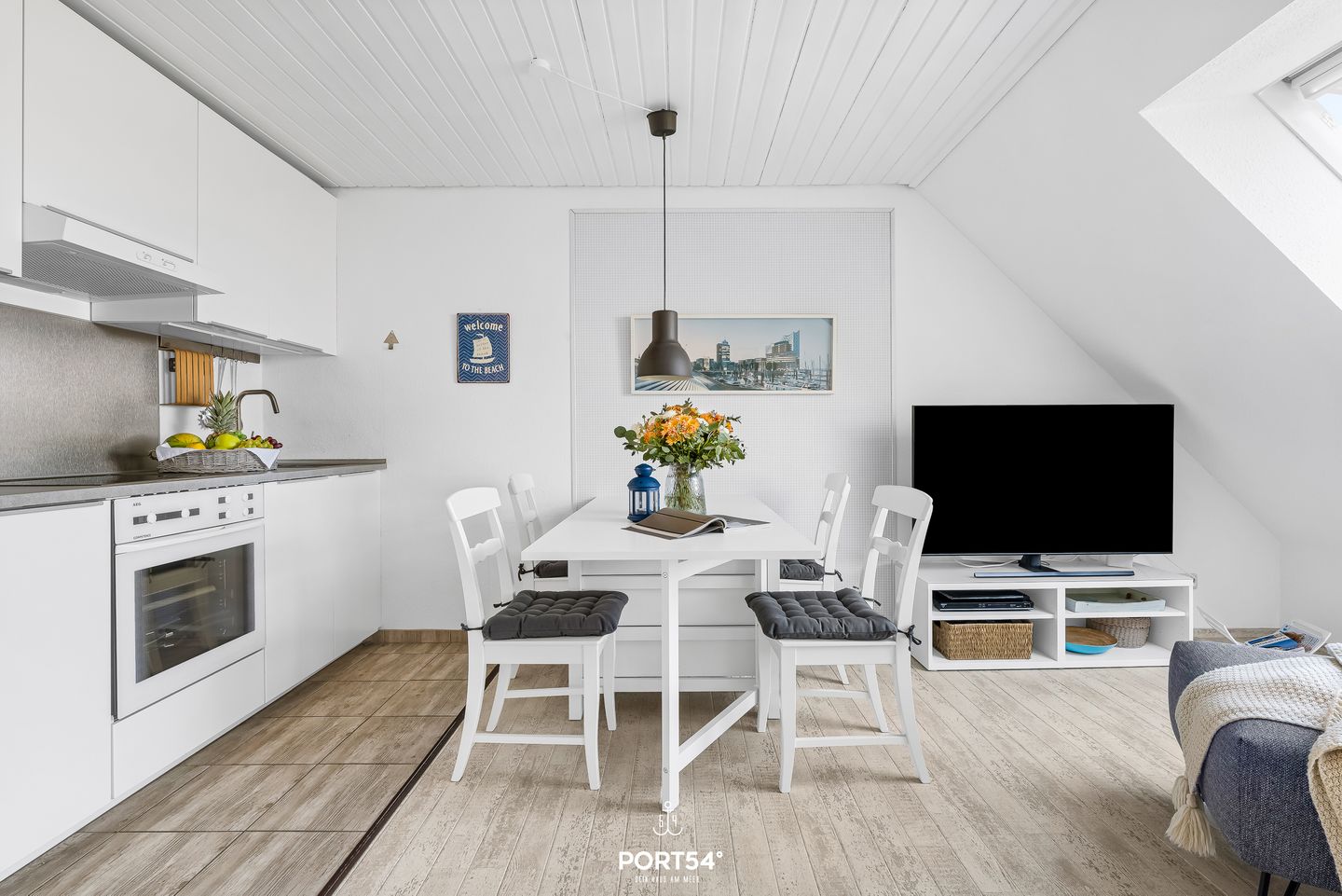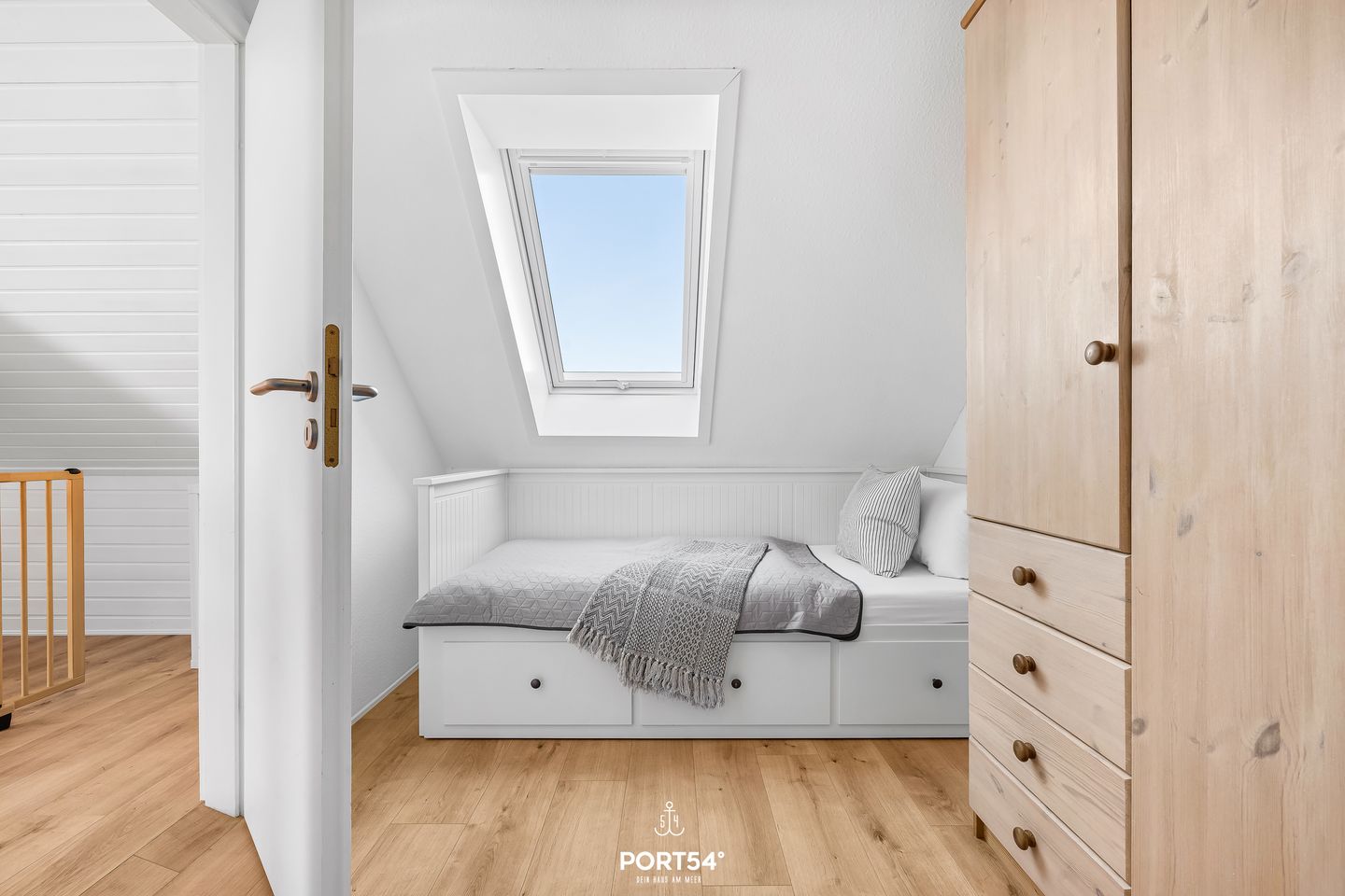 Die Wohnung ist mit schnellem WLAN-Internet ausgestattet und verfügt über zwei Schlafzimmer, jeweils mit Doppelbett, ein im Dezember 2023 vollständig renoviertes modernes Duschbad und ein Wohnzimmer mit Küchenzeile, die mit einem Elektroherd mit Cerankochfeld und einem Geschirrspüler ausgestattet ist. Das Schlafzimmer im Dachgeschoss ist für Kleinkinder zu nutzen; die Treppe nach unten kann mit einem Gitter gesichert werden. Oben befindet sich ein mit einem zur Ostsee ausgerichteten großen Fenster ausgestattetes Extrazimmer mit Doppelbett, Flachbildernseher mit DVB/T2-HD-Empfang/Apple-TV und einem Lounge-Sessel, so dass Sie aussuchen können, wo Sie schlafen und relaxen möchten. Vorhanden sind außerdem ein großer moderner Smart-TV mit Satellitenempfang und ein Radio. Der zur Ostsee hin ausgerichtete, mit Holzbohlen belegte Balkon kann zur Hälfte genutzt werden und ist mit einem kleinem Tisch und 2 Gartenstühlen möbliert. Münz- Waschmaschine und Münz-Trockner sind im Haus vorhanden.