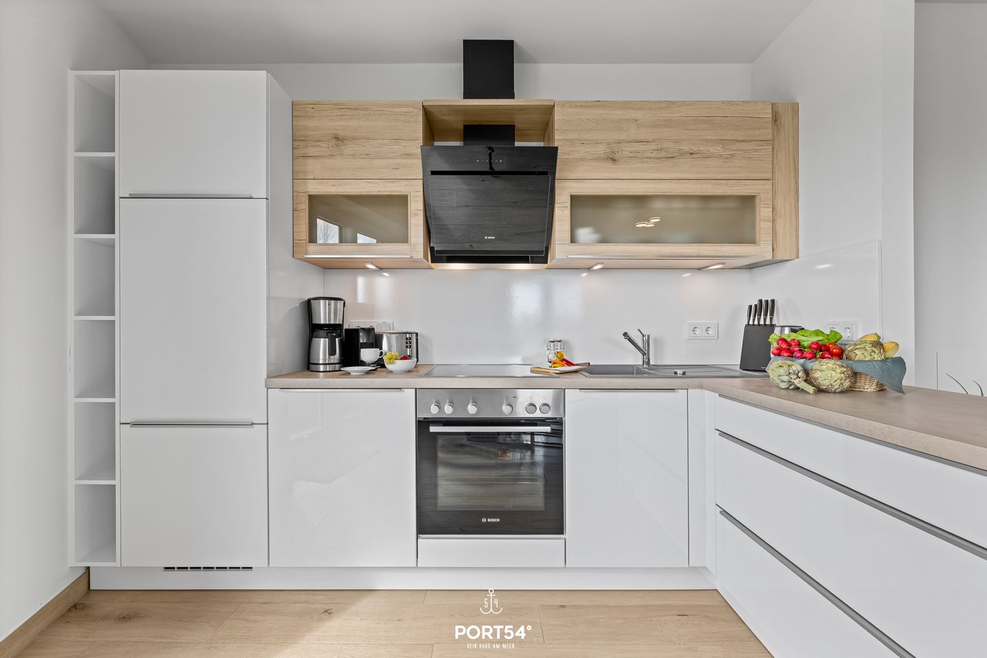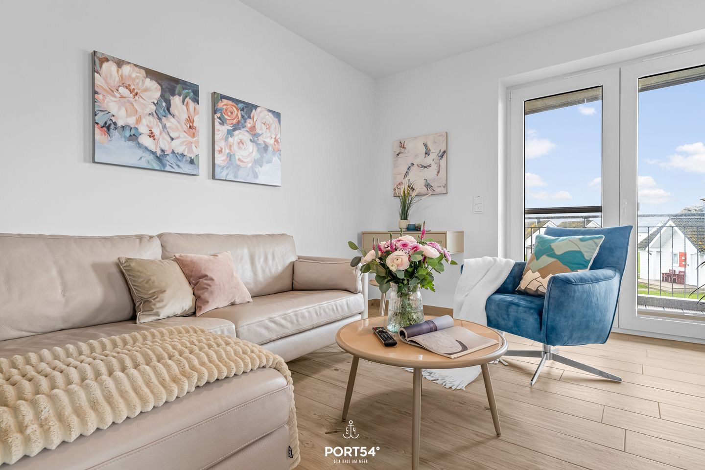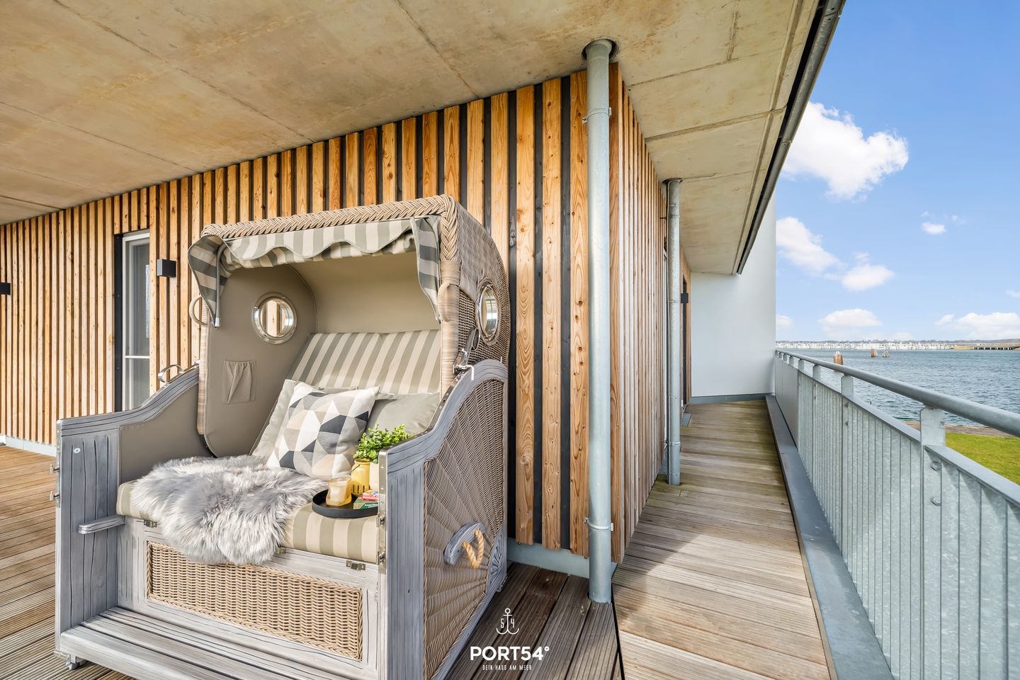 Auf dem überdachten Balkon genießt Du einen schönen Meerblick und kannst das maritime Treiben im Yachthafen beobachten. Gartenmöbel, Strandkorb und ein Elektrogrill laden Dich dazu ein, den Tag entspannt im Freien ausklingen zu lassen.