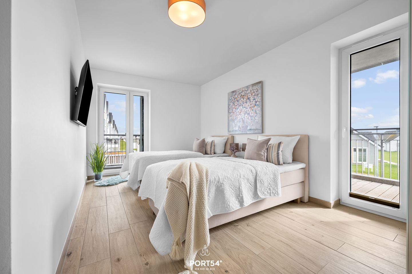 Die Unterkunft verfügt über zwei separate Schlafzimmer. Das erste Schlafzimmer ist mit einem Doppelbett (180 × 200 cm) ausgestattet, das zweite mit zwei Einzelbetten (je 80 × 200 cm). Beide Zimmer bieten Dir bequeme Boxspringbetten, Verdunkelungsmöglichkeiten, Sichtschutz sowie jeweils einen eigenen Fernseher.