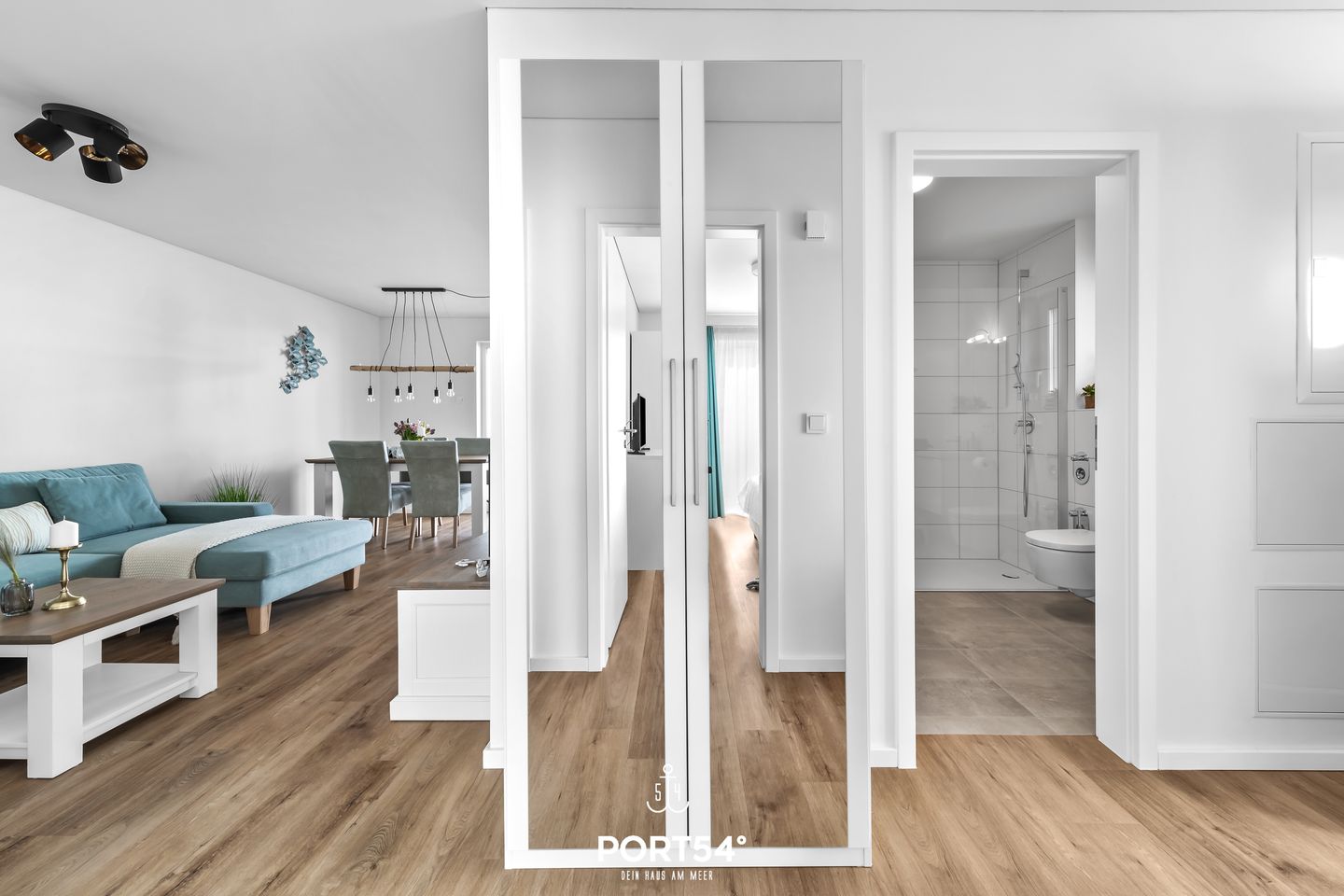 Das Badezimmer bietet Dir einen Handtuchtrockner, einen Föhn, eine ebenerdige Dusche und das Highlight: eine Infrarot-Sauna – Wellness pur.
