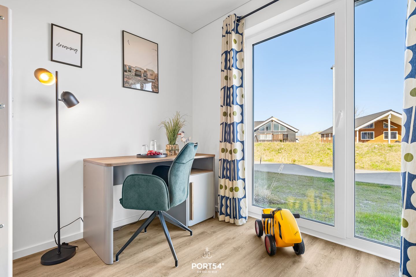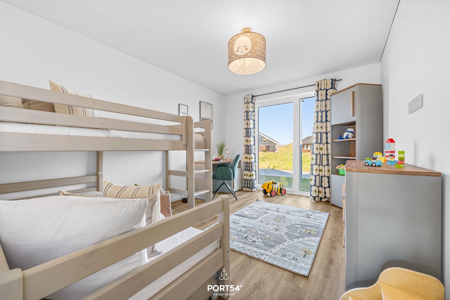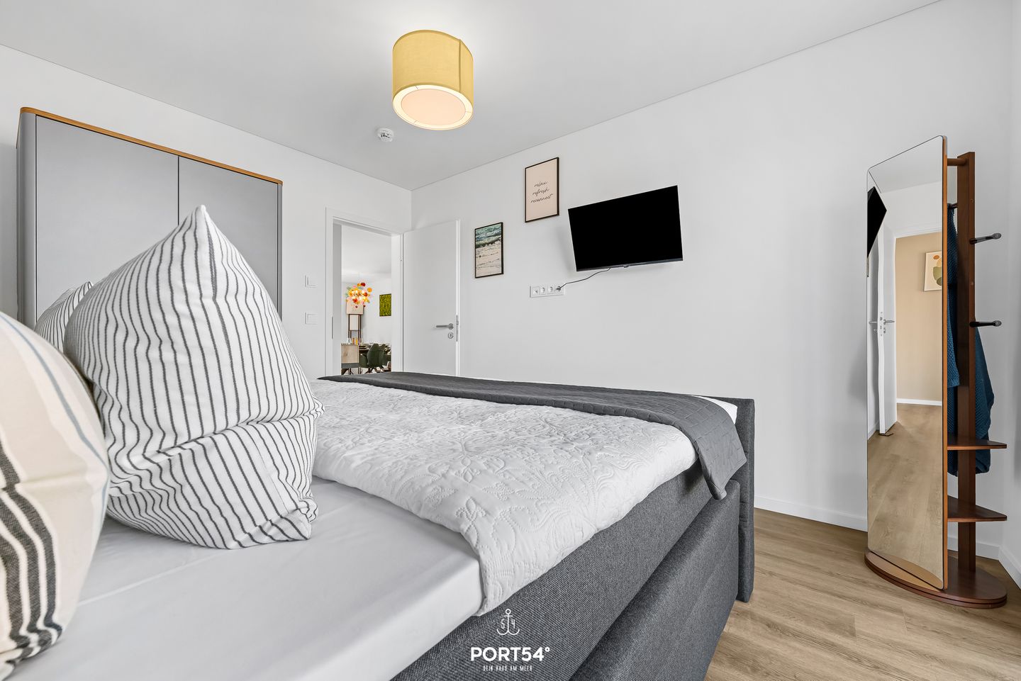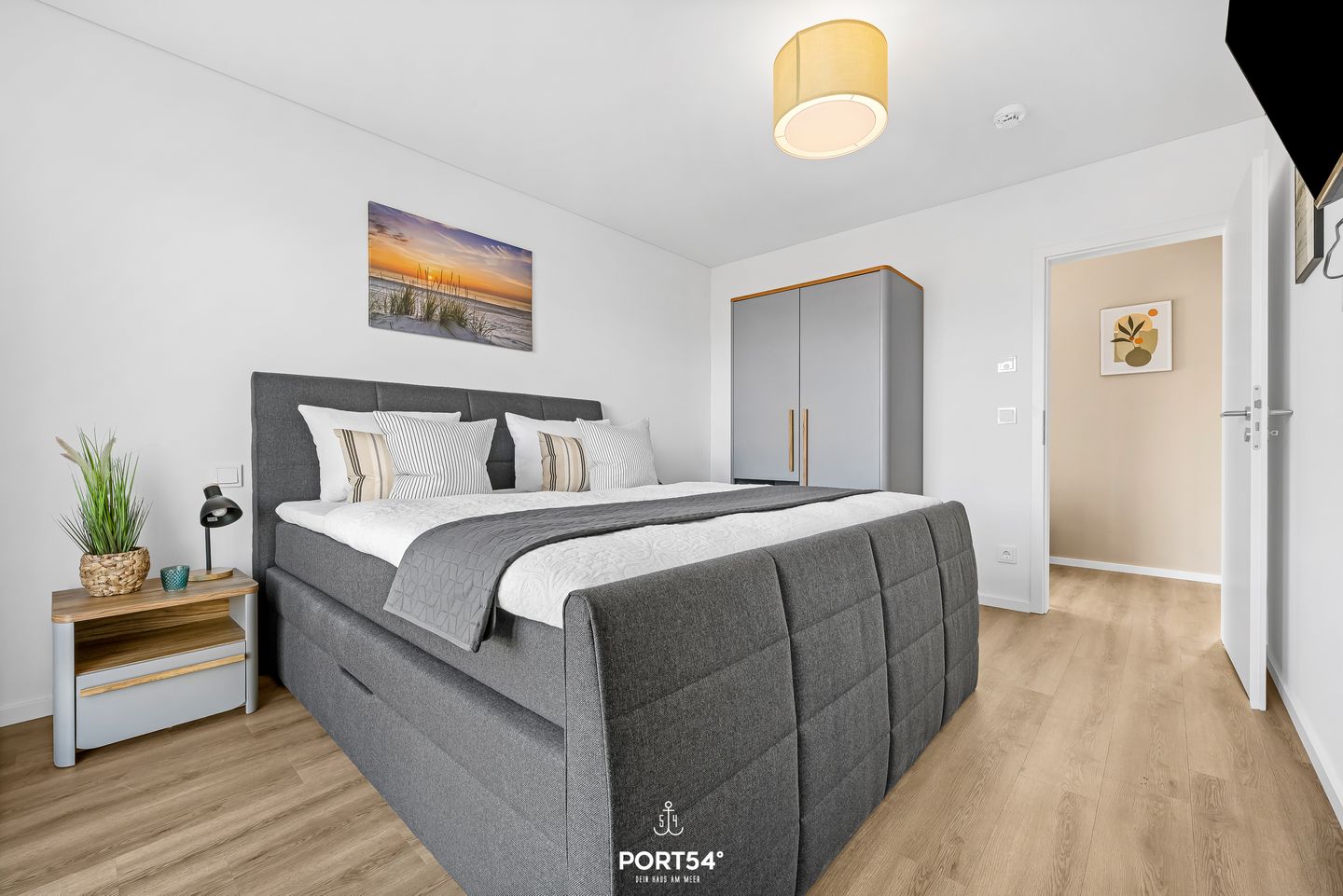 Die beiden Schlafzimmer sind durchdacht aufgeteilt und bieten flexible Schlafmöglichkeiten. Das erste Schlafzimmer ist mit einem komfortablen Boxspring-Doppelbett (180 x 200 cm) ausgestattet und bietet mit Kleiderschrank, Kommode, Smart-TV sowie Sichtschutz einen ruhigen Rückzugsort für erholsame Nächte. Das zweite Schlafzimmer eignet sich besonders gut für Familien oder Gruppen: Hier befinden sich ein Hochbett (0,90 x 200 cm). Das untere Bett verfügt über eine Schublade. Das obere Hochbett (0,90 x 200 cm) ist ausschließlich für Kinder vorgesehen und sorgt für ein kleines Abenteuer im Urlaub. Für die jüngsten Gäste steht selbstverständlich auch ein Hochstuhl und ein Babybett bereit.