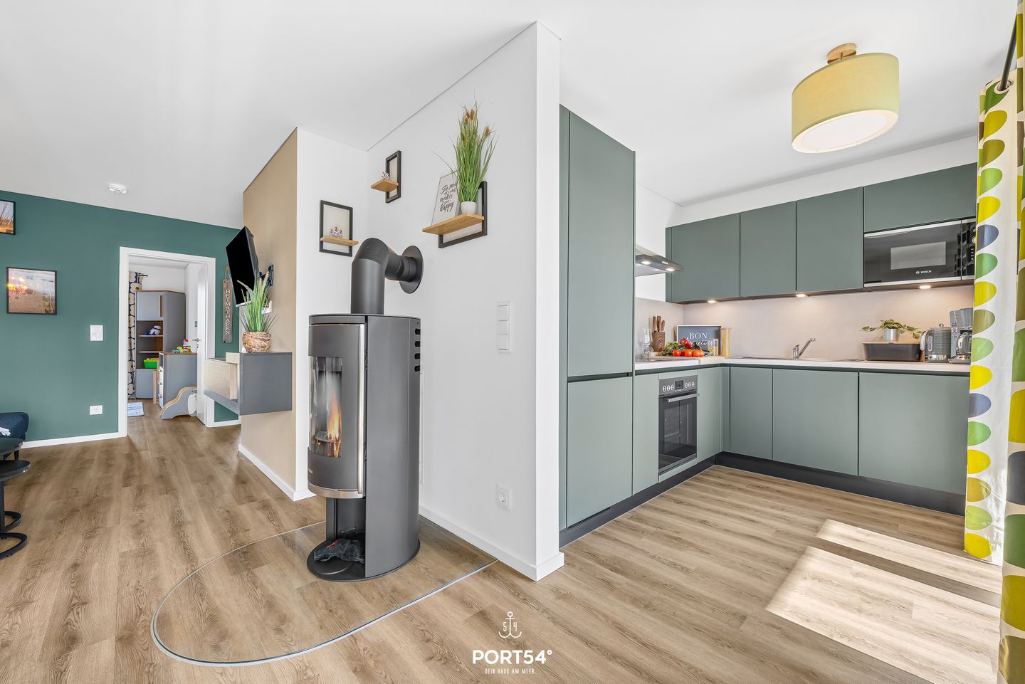 Die Ferienwohnung Tüddelbüddel bietet auf großzügigen 81 qm viel Platz für bis zu fünf Erwachsene und ein Kind und verbindet Komfort mit einer gemütlichen, wohnlichen Atmosphäre. Bereits beim Eintreten empfängt Sie der lichtdurchflutete, offen gestaltete Wohn- und Essbereich, der das Herzstück der Wohnung bildet. Hier können Sie gemeinsam kochen, essen, entspannen oder den Tag Revue passieren lassen. Der Kamin im Wohnzimmer sorgt besonders an kühleren Abenden für wohlige Wärme und eine behagliche Stimmung. Zusätzlich steht Ihnen hier ein moderner Smart-TV zur Verfügung, sodass auch gemütliche Filmabende auf der ausziehbaren Couch nicht zu kurz kommen.