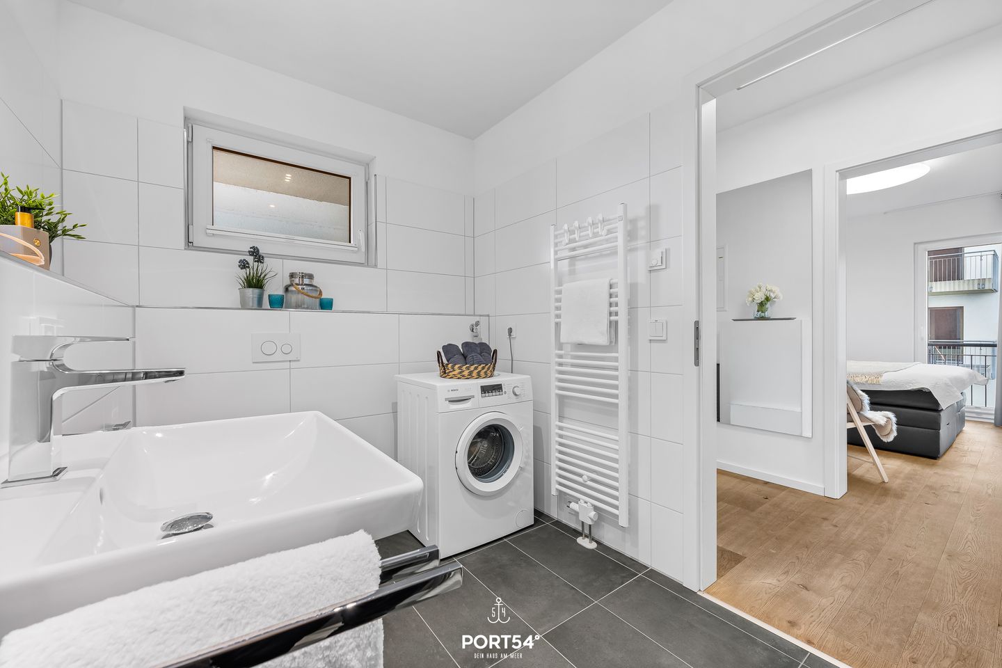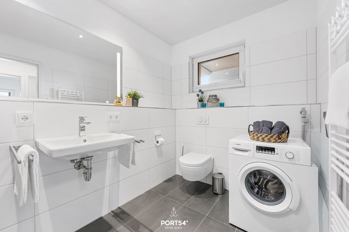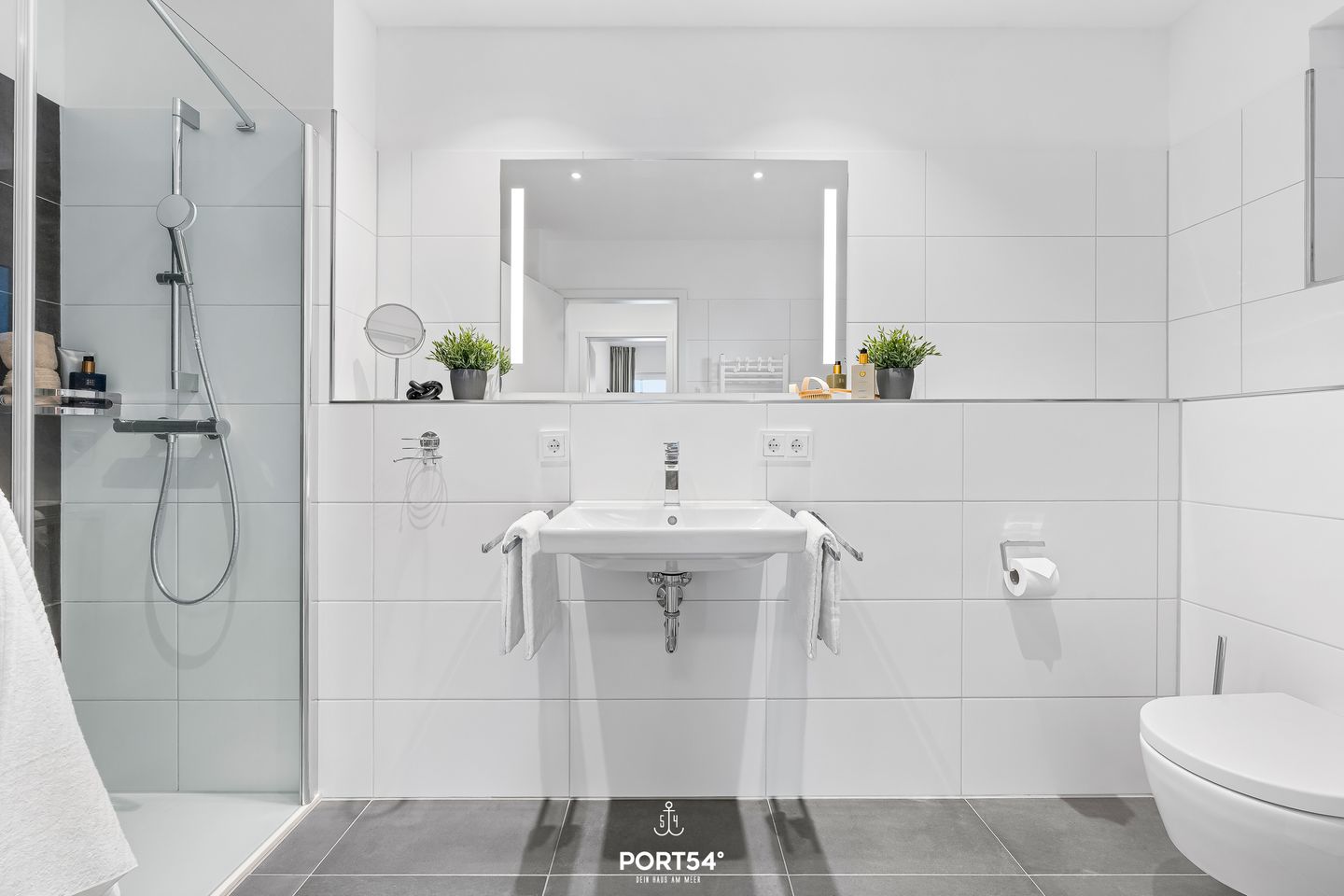 Das Badezimmer ist modern gestaltet und verfügt über eine bodengleiche Dusche, die Dir maximalen Komfort bietet.