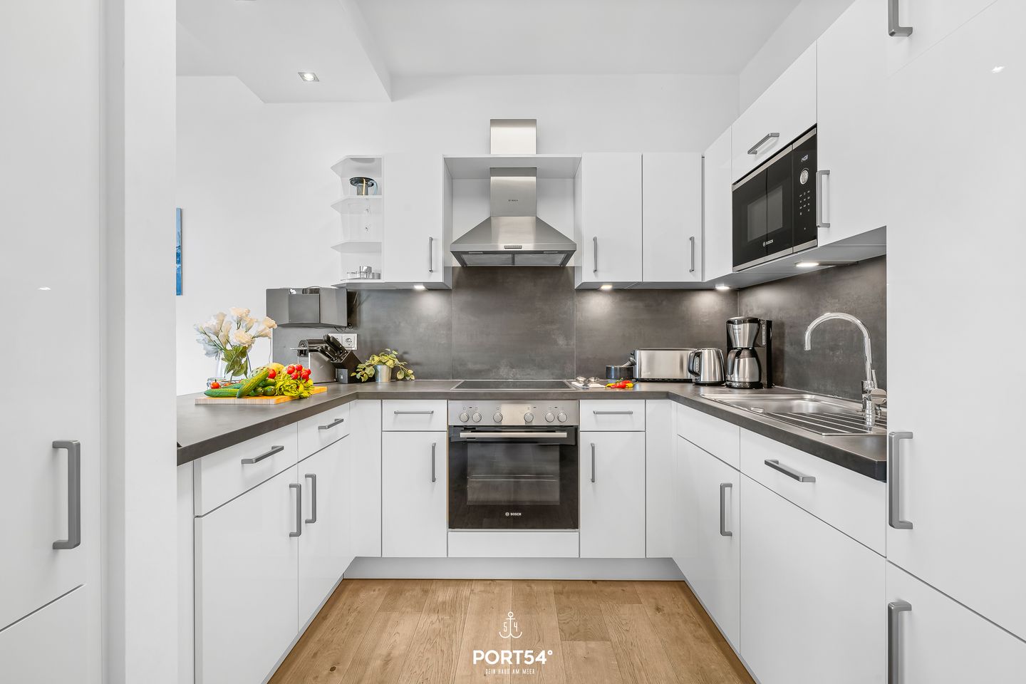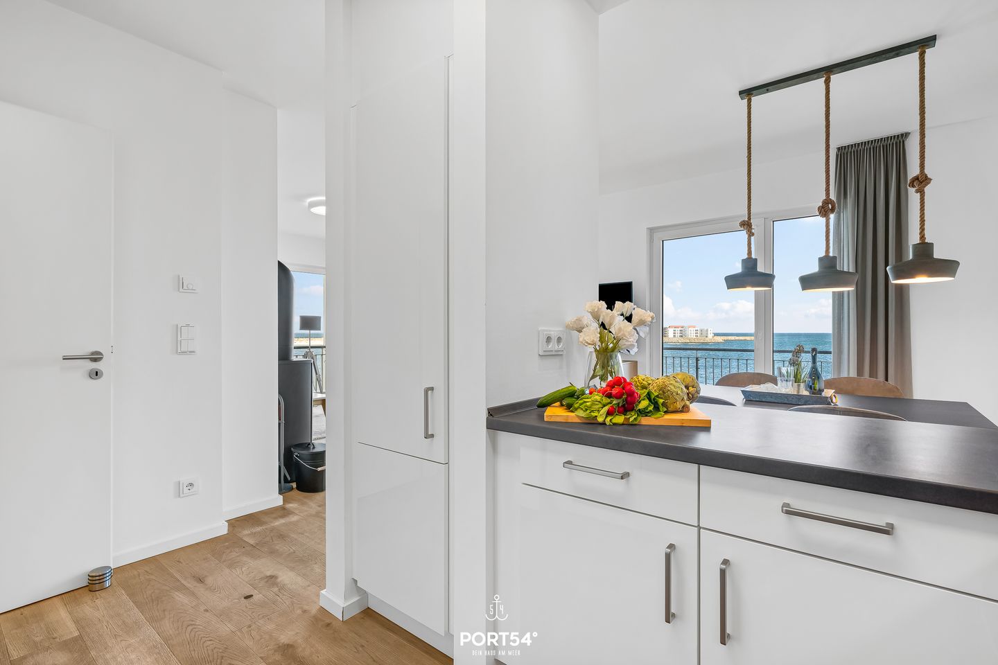Zur Ausstattung der Ferienwohnung gehört eine voll ausgestattete offene Küche, die mit einem Cerankochfeld, einem Elektrobackofen, einer Mikrowelle, einer Spülmaschine und zahlreichen Küchenutensilien keine Wünsche offenlässt.