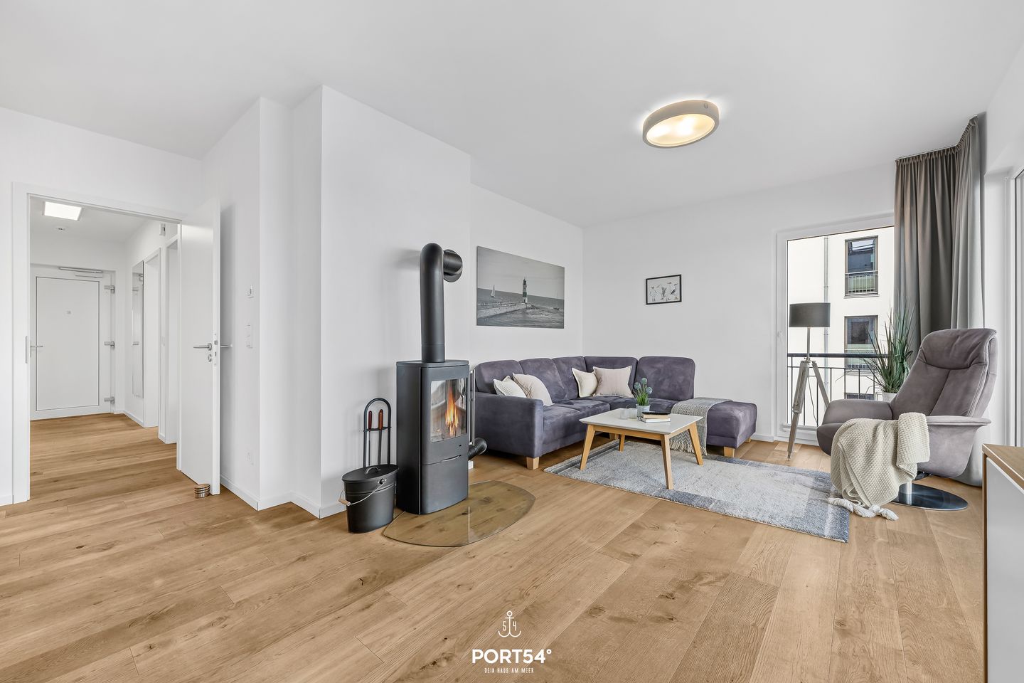 Die Wohnung ist zudem mit einem Kaminofen ausgestattet, der an kühleren Tagen für wohlige Wärme sorgt.