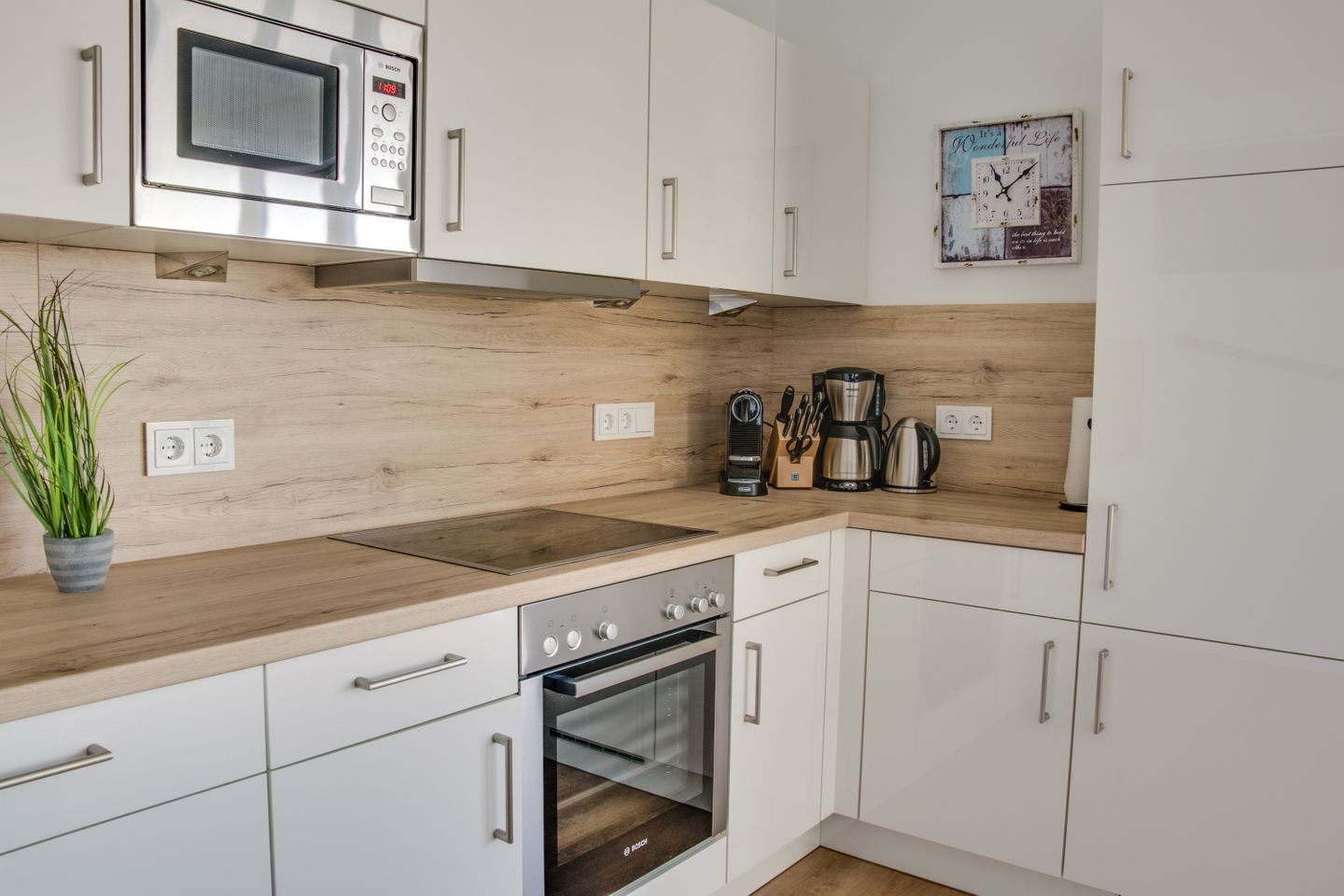 Die hochwertige offene Küche ist voll ausgestattet und lässt mit Mikrowelle, Spülmaschine, Espresso- und Kaffeemaschine, Wasserkocher und Toaster keine Wünsche offen. Auch auf Küchenutensilien und ausreichend Geschirr sowie Besteck wurde Wert gelegt.