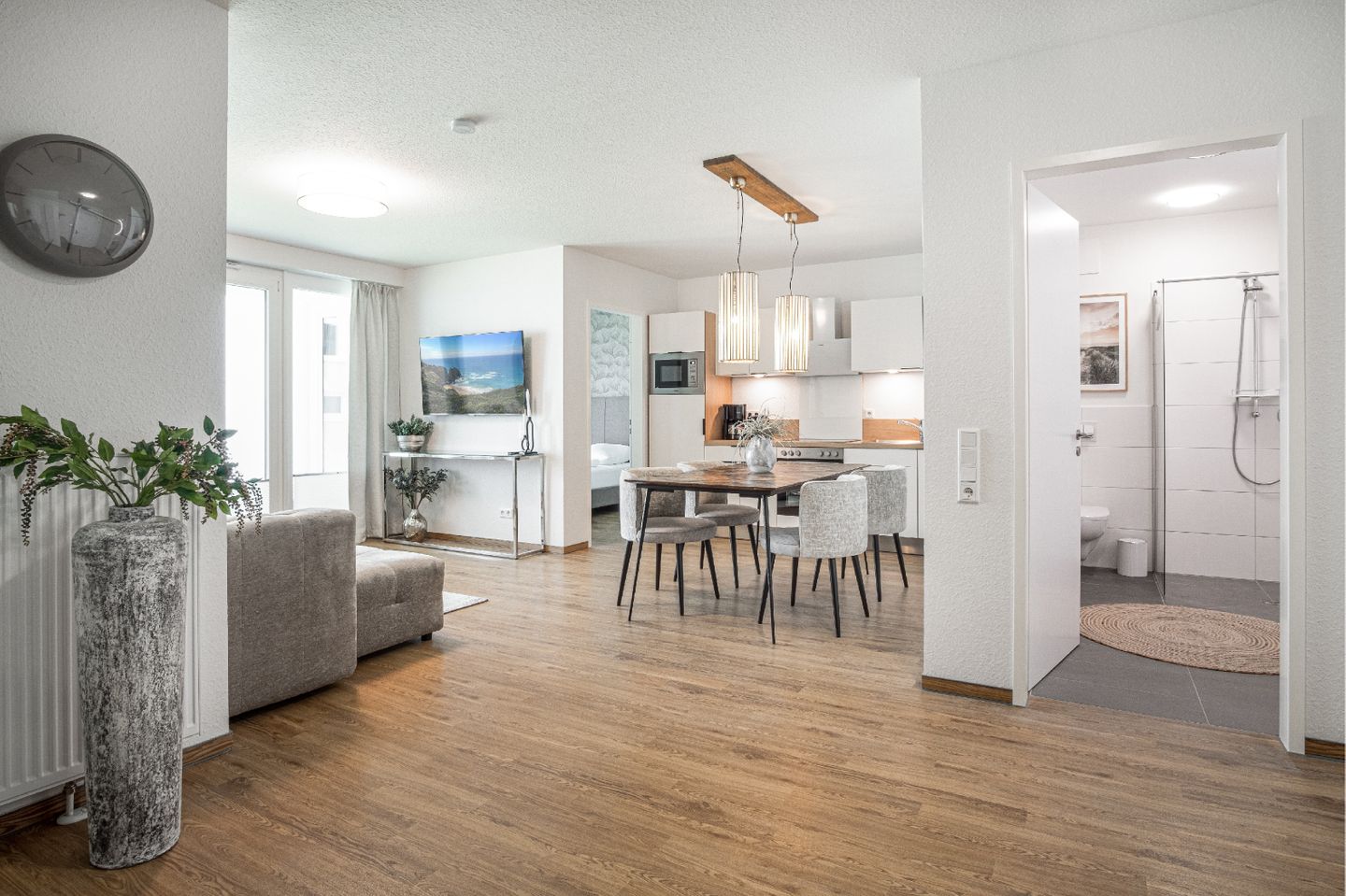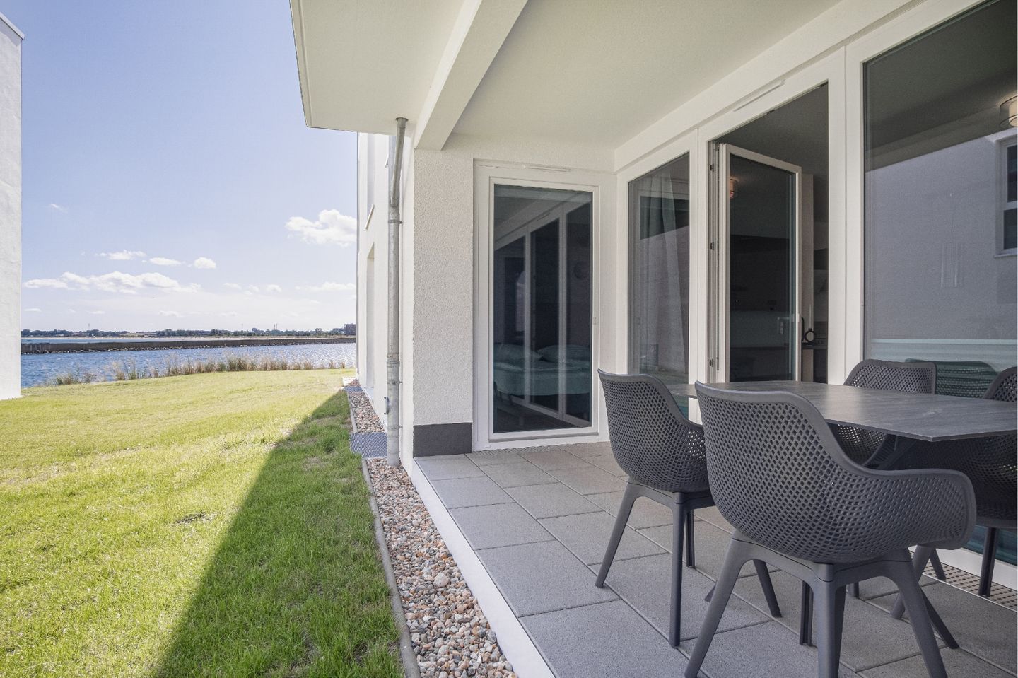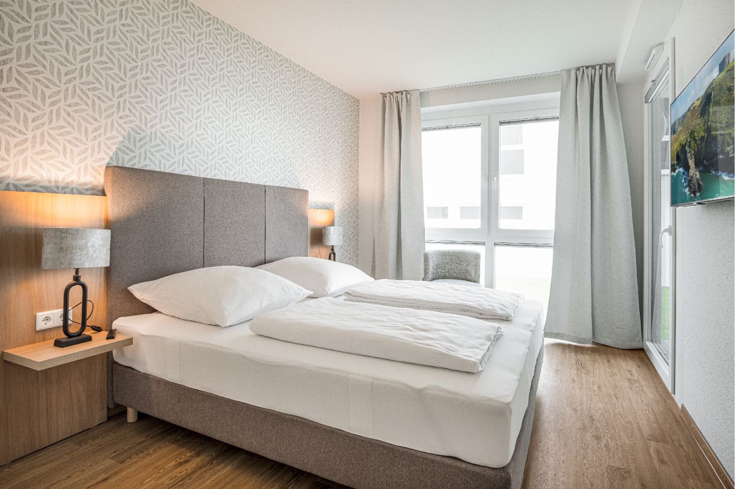 Die Ferienwohnung "Ostseebrise" in Olpenitz begrüßt Sie in direkter Nähe zur Ostsee im exklusiven OstseeResort Olpenitz. Sie befindet sich im Erdgeschoss eines modernen Gebäudes und bietet auf 78 m² ein komfortables Ambiente für bis zu vier Gäste, ideal für Familien, Paare und Erholungssuchende. Die großzügig geschnittene Wohnung umfasst drei Räume, darunter zwei separate Schlafzimmer, die erholsamen Schlaf für bis zu vier Personen bieten. In beiden Schlafzimmern befindet sich je ein Doppelboxspringbett (190 x 200cm), ein Kleiderschrank sowie je ein Smart-TV. Verdunklungsmöglichkeiten runden das Angebot für erholsamen Schlaf ab. Das helle, offen gestaltete Wohn- und Esszimmer ist mit einem gemütlichen Sofa, einem Esstisch sowie einem Smart-TV ausgestattet. Die moderne, offene Küche gliedert sich nahtlos in den Wohnbereich ein und begeistert durch eine hochwertige Ausstattung: eine Mikrowelle, eine Spülmaschine und eine Kaffeemaschine stehen Ihnen zur Verfügung, ebenso sämtliche benötigten Küchenutensilien. Hier steht den gemeinsamen Kochabenden nichts mehr im Wege. Das geschmackvoll eingerichtete Badezimmer verfügt über eine bodengleiche Dusche, ein Waschbecken mit Spiegel und Haartrockner. Ein Ganzkörperspiegel, eine Garderobe sowie Sichtschutz an allen Fenstern runden den hohen Wohnkomfort ab. Für Ihr tägliches Wohlgefühl stehen Ihnen zusätzlich gemeinschaftlich nutzbare Waschmaschine und Trockner gegen Aufpreis zur Verfügung. Besonderes Augenmerk liegt auf dem Wellness- und Freizeitangebot: Die Ferienwohnung ist Teil einer Anlage mit beheiztem Indoor-Pool, Sauna zur Gemeinschaftsnutzung und weiteren Wellness-Einrichtungen mit einem einzigartigen Blick auf den Hafen und die Ostsee! So genießen Sie auch an kühleren Tagen erholsame Stunden. Die überdachte Terrasse mit hochwertigen Gartenmöbeln lädt zu entspannten Stunden im Freien ein. Ein Elektrogrill steht Ihnen für das Zubereiten von Mahlzeiten im Freien zur Verfügung, und der Zugang zu einer gepflegten Rasenfläche schafft zusätzlichen Erholungsraum. Für Ihren PKW steht ein kostenloser Privatparkplatz direkt vor dem Haus bereit. Fahrräder können im Fahrradraum im Keller mit Steckdosen abgestellt werden. Die Umgebung lädt zu entspannten Spaziergängen, ausgedehnten Fahrradtouren oder sportlichen Unternehmungen am und auf dem Wasser ein.