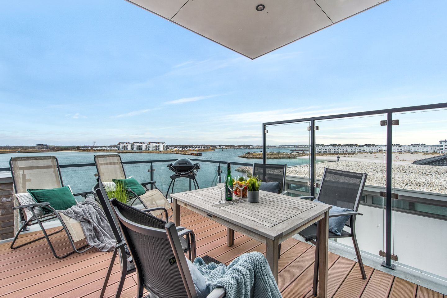 Urlaub mit einer traumhaften Aussicht - das verspricht Ihnen die Penthouse-Ferienwohnung "Dock 76 Bridge". Diese exklusive Penthouse-Ferienwohnung liegt einzigartig auf einem schmalen Landstreifen zwischen der Marina des OstseeResort Olpenitz und der Ostsee. Umgeben von Wasser ermöglicht die im 2.Obergeschoss gelegene Penthouse-Wohnung einen unvergesslichen Blick über den Hafen, den Privatstrand des Resorts und die weite Ostsee. Genießen Sie beim Frühstück auf der 26m² großen Dachterrasse den traumhaften Weitblick, entspannen Sie auf den bequemen Sonnenliegen oder verbringen Sie unvergessliche Grillabende! Durch einen Windschutz können Sie auch bei einer leichten Briese die Dachterrasse hervorragend nutzen. Der Wohn- und Essbereich ist dank der bodentiefen Fensterfront lichtdurchflutet und ermöglich auch vom Sofa aus diesen wunderschönen Ausblick. Verbringen Sie gemütliche Abende auf dem Sofa und schauen Sie auf dem Flachbild-Fernseher einen Film über den Blu-ray-Player. Die vollausgestattete Küche lässt keine Wünsche offen. Hier finden Sie alles, was Sie zum Kochen und Genießen benötigen, einschließlich einer Geschirrspülmaschine, einen Backofen, Ceranfeld, Mikrowelle, Toaster, Kaffee- und Nespressomaschine, eines Kühlschranks mit Gefrierfach und allen notwendigen Küchenutensilien. Das Tageslicht-Duschbad ist mit einer ebenerdigen Dusche, Kosmetikspiegel, Fön und einer großen finnischen Sauna ausgestattet. Verbringen Sie hier an kühleren Tagen entspannende Wellnessmomente und lassen Sie den Alltagsstress hinter sich. Das eine Schlafzimmer bietet Ihnen ein Boxspring-Doppelbett (160x200cm) - wachen Sie hier mit einem Blick auf den Strand auf. Das andere Schlafzimmer ist mit zwei Boxspring-Einzelbetten (je 80x200cm) ausgestattet. Beide Schlafzimmer verfügen über einen Kleiderschrank, einen Flachbild-Fernseher und Verdunkelungsmöglichkeiten für einen erholsamen Schlaf. Am Haus steht Ihnen einen PKW-Stellplatz mit einer Ladesäule für Ihr Elektroauto zur Verfügung. Der private Sandstrand des Resorts ist nur wenige Meter von der Ferienwohnung entfernt. Genießen Sie hier einen unvergesslichen Ostseeurlaub!