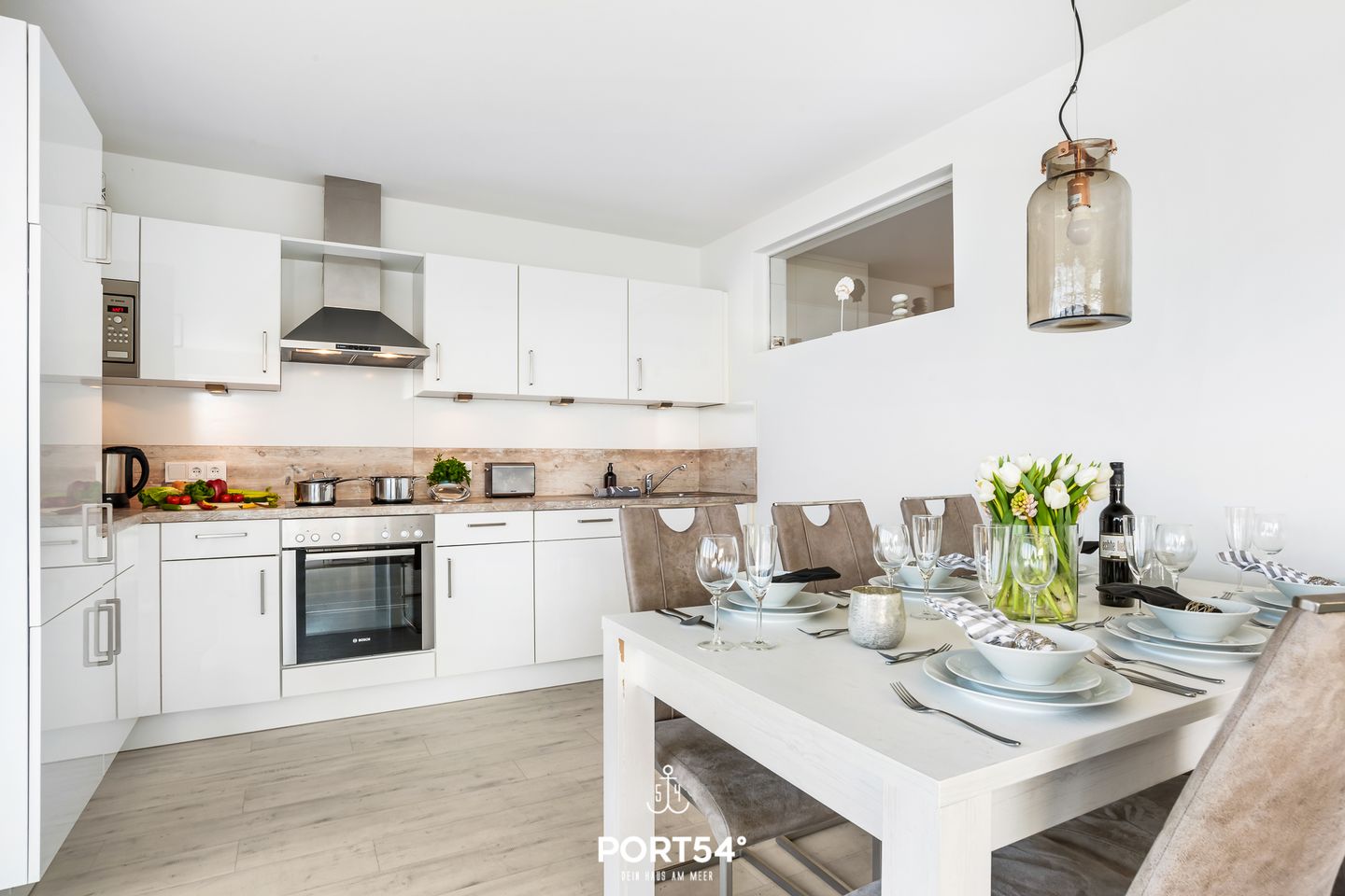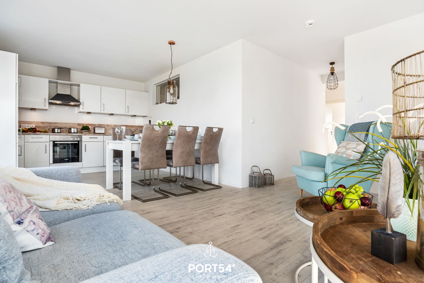 Das offene Wohnkonzept umfasst ein gemütliches Wohnzimmer mit Sofaecke, Fernseher, WLAN und Radio. Die voll ausgestattete Küche verfügt über einen Induktionsherd, Spülmaschine, Kühlschrank mit Gefrierfach, Kaffeemaschine sowie alle nötigen Küchenutensilien und Geschirr. Am angrenzenden Esstisch lässt sich gemeinsam essen und verweilen.