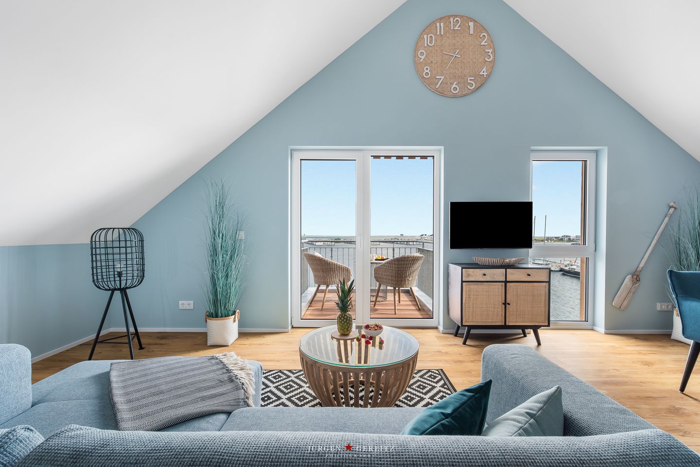 Genießen Sie, in der exklusiven Ferienwohnung "Aloha Lounge" einen unvergesslichen 180-Grad Panorama-Blick über das gesamte Hafenbecken von Olpenitz, den Yachthafen von Maasholm, die ein- und ausfahrenden Schiffe auf der Schlei und die Lotseninsel bis nach Dänemark! Die Aloha Lounge befindet sich im obersten Stock des Klabautermann II direkt an der Hafenpromenade von Olpenitz. Bereits beim Betreten der Wohnung können Sie durch die breite, bodentiefe Fensterfront das Wasser sehen. Der lichtdurchflutete, loftartige Wohn-, Küchen- und Essbereich mit ausgeprägt hohen Decken bietet Ihnen dabei die unterschiedlichsten Perspektiven. So ergeben sich nach den jeweiligen Lichtverhältnissen verschiedene Sitzmöglichkeiten, was die 80m² noch einmal größer erscheinen lässt. Der Balkon schwebt scheinbar über der Hafenpromenade. Whale Watching inklusive! Mit etwas Glück können Sie Schweinswale im Hafenbecken beobachten. Das Wohnzimmer bietet Ihnen ein gemütliches Sofa in Wasserfarben, das gleichzeitig als weitere Schlafgelegenheit (140×200cm) dient. Hier werden Sie mit einem Blick aufs Wasser wach. Ein Flatscreen-TV ist in den Ausblick integriert und lässt sich flexibel in Richtung Sofa oder Essbereich ausrichten. Am großen Esstisch mit bequemen Armlehnstühlen haben 4 Personen Platz. Auch die offene Küche lässt keine Wünsche offen. Neben einem Herd mit Ceranfeld und Dunstabzug, Backofen, Mikrowelle sowie einem Kühlschrank mit Gefrierfach, stehen Ihnen hier auch eine Kaffee- und Nespressomaschine, Wasserkocher und Toaster sowie eine umfangreiche Auswahl an Koch- und Essgeschirr zur Verfügung. Im Schlafzimmer finden Sie ein komfortables Tom Tailor Boxspringbett (180×200cm), großzügigen Stauraum für Ihre Garderobe sowie einen weiteren Flatscreen-TV. Durch das elektrisch zu öffnende Dachflächenfenster können Sie bei Bedarf die kühle Nachtluft hereinströmen lassen. An den Fenstern sind Verdunkelungsplissees angebracht. Die Verdunkelung des Dachflächenfensters ist ebenfalls möglich. Das geräumige Bad ist mit einer ebenerdigen Dusche, Waschbecken, WC und einer Waschmaschine mit integriertem Trockner ausgestattet. Sollten Sie Ihr Home-Office nach Olpenitz verlegen wollen, steht Ihnen im Wohnflur ein Schreibtisch zur Verfügung. Unsere Ferienwohnung ist vollflächig mit Fußbodenheizung ausgestattet. Insgesamt 3 elektrische Dachflächenfenster sorgen für eine gute Belüftung und Temperierung aller Räume. Die "Aloha Lounge" ist daher zu allen Jahreszeiten das perfekte Urlaubsdomizil. "Aloha" ist nicht nur ein Wort, sondern ein Lebensgefühl. Die Hawaiianer verwenden es in vielfältigster Weise als Gruß, als Zeichen der Harmonie und der (Gast-) Freundschaft. In diesem Sinne – Aloha und herzlich willkommen! Das Highlight der Wohnung ist der schöne Balkon, auf dem Sie gemeinsam die farbenreichen Sonnenaufgänge und Sonnenuntergänge hier im Norden genießen können. Vor dem Haus steht Ihnen ein eigener, kostenfreier Parkplatz zur Verfügung. Die Wohnung ist bequem mit dem Fahrstuhl zu erreichen. In dem Gemeinschaftsschuppen können Sie Ihre Fahrräder unterstellen.