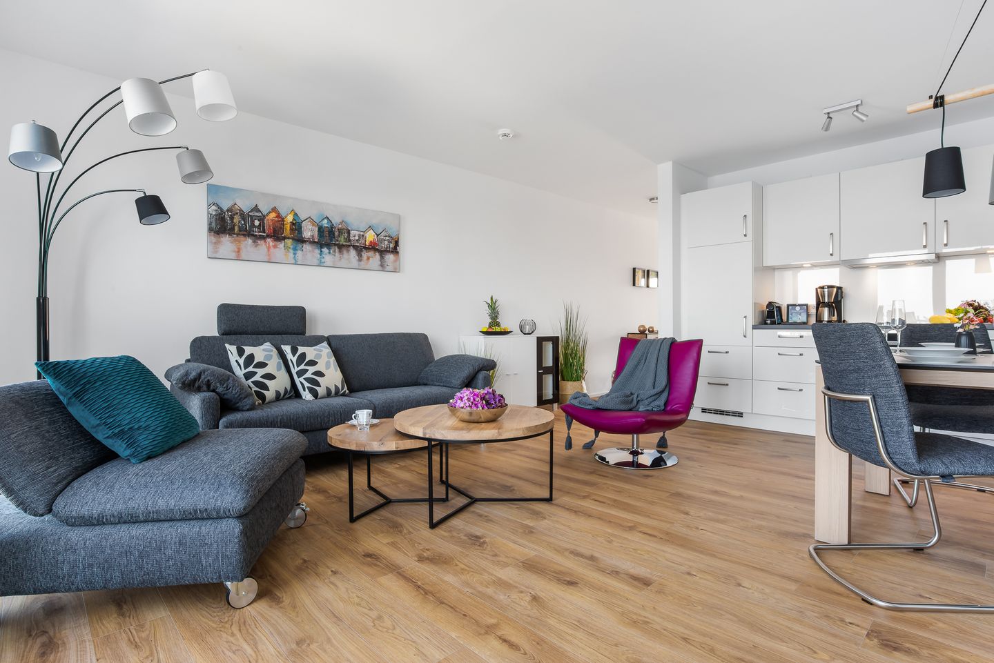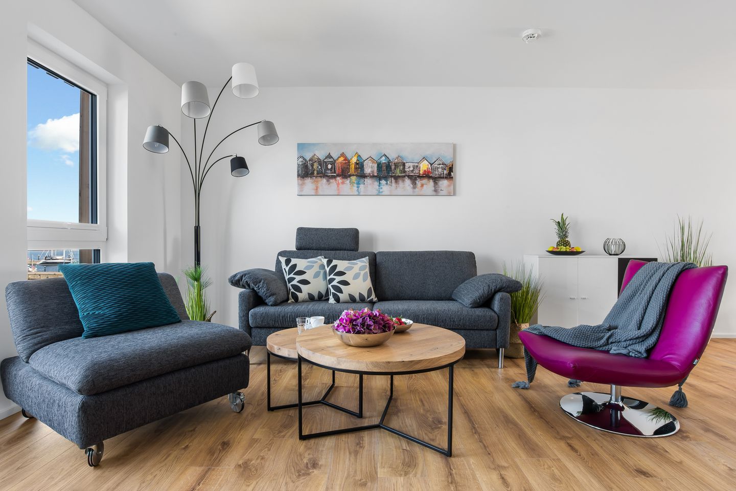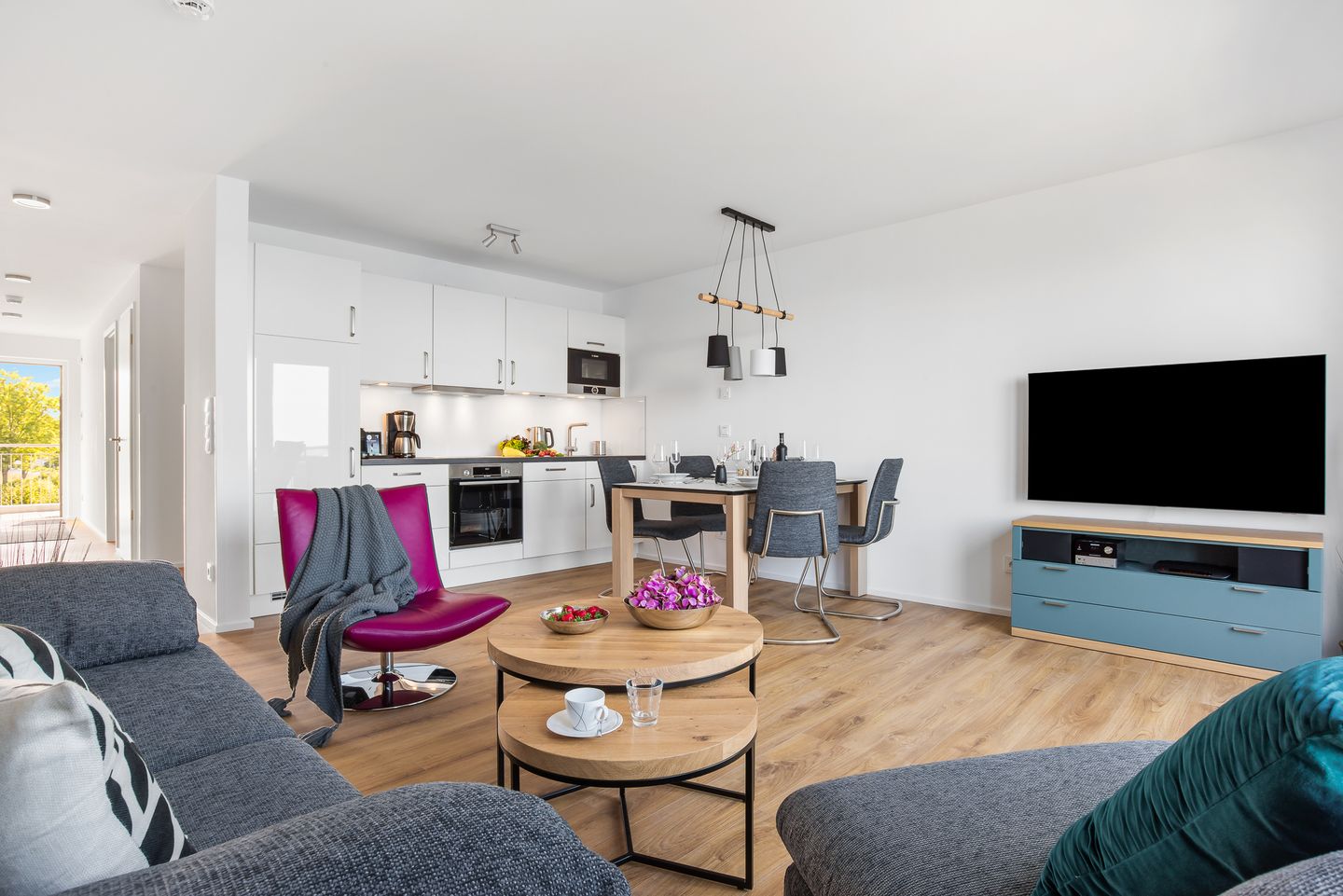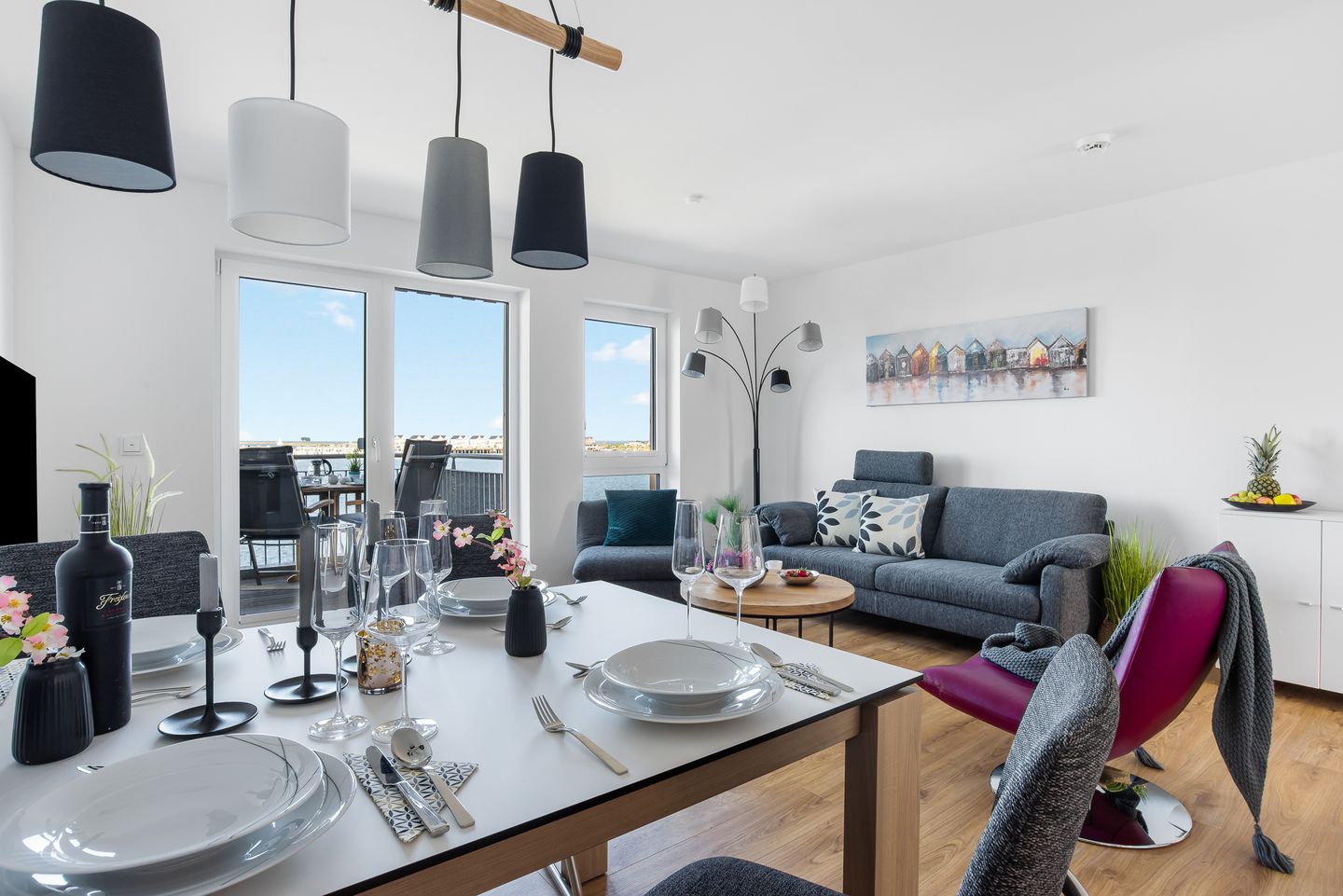 Die Ferienwohnung "Undine" in Olpenitz im 2. Stock eines Hauses mit Aufzug und bietet auf 72 m² Wohnfläche ideale Voraussetzungen für einen erholsamen Aufenthalt für bis zu vier Personen und einen Hund. Die Ferienwohnung ist hochwertig und stilvoll gestaltet. Das offene Wohn- und Esszimmer bildet das Herzstück der Unterkunft: Hier erwarten Sie ein komfortables Sofa, ein Sessel sowie ein moderner Essbereich mit Esstisch. Für Unterhaltung sorgt hier ein Smart-TV und kostenfreies WLAN. Die offene Küche ist voll ausgestattet und lädt zu kulinarischen Erlebnissen ein – moderne Geräte wie Induktionsherd, Mikrowelle, Spülmaschine, Kaffee- und Espressomaschine, Toaster sowie Pürierstab bieten höchsten Komfort. Zwei separate Schlafzimmer ermöglichen Rückzug und erholsamen Schlaf, die Fenster sind mit Verdunkelungsmöglichkeiten ausgestattet. In einem Schlafzimmer befinden sich ein Boxspring-Doppelbett (180x200cm), in dem anderen finden Sie zwei gemütliche Einzel-Boxspringbetten, die einfach zu einem Doppelbett zusammengeschoben werden können. Beide Schlafzimmer haben je einen Kleiderschrank und einen Smart-TV. Dank des Schreibtisches im Schlafzimmer ist in der Wohnung auch mobiles Arbeiten möglich - und das sogar mit Blick auf den Hafen. Für Familien mit Kleinkindern stehen ein Kinderhochstuhl sowie ein Babybett bereit. Im hochwertig ausgestatteten Badezimmer genießen Sie die bodengleiche Dusche, einen Kosmetikspiegel und einen Haartrockner. Die Unterkunft verfügt über eine eigene Waschmaschine, Bügeleisen, Bügelbrett, Wäscheständer und Staubsauger. Moderne Annehmlichkeiten wie eine Fußbodenheizung sorgen auch in der kühleren Jahreszeit für ein angenehmes Raumklima. Der Balkon bietet sich hervorragend zum Entspannen und Genießen des Wasserblicks an. Für entspannte Grillabende steht ein Elektrogrill zur Verfügung. Ein kostenloser Privatparkplatz direkt am Haus ist für Sie reserviert. Lebensmittelgeschäfte und Restaurants finden Sie in unmittelbarer Umgebung. Die Ferienanlage und ihre Umgebung bieten zahlreiche Freizeit- und Sportmöglichkeiten: Das Angebot reicht von Wassersport wie Segeln, Angeln oder Windsurfen bis hin zu Strandaktivitäten wie Schwimmen, Beachvolleyball, Nordic Walking und Joggen. Ob für ein entspanntes Wochenende zu zweit oder einen erholsamen Familienurlaub – die Ferienwohnung „Undine“ bietet Ihnen den idealen Rückzugsort an der Ostsee.