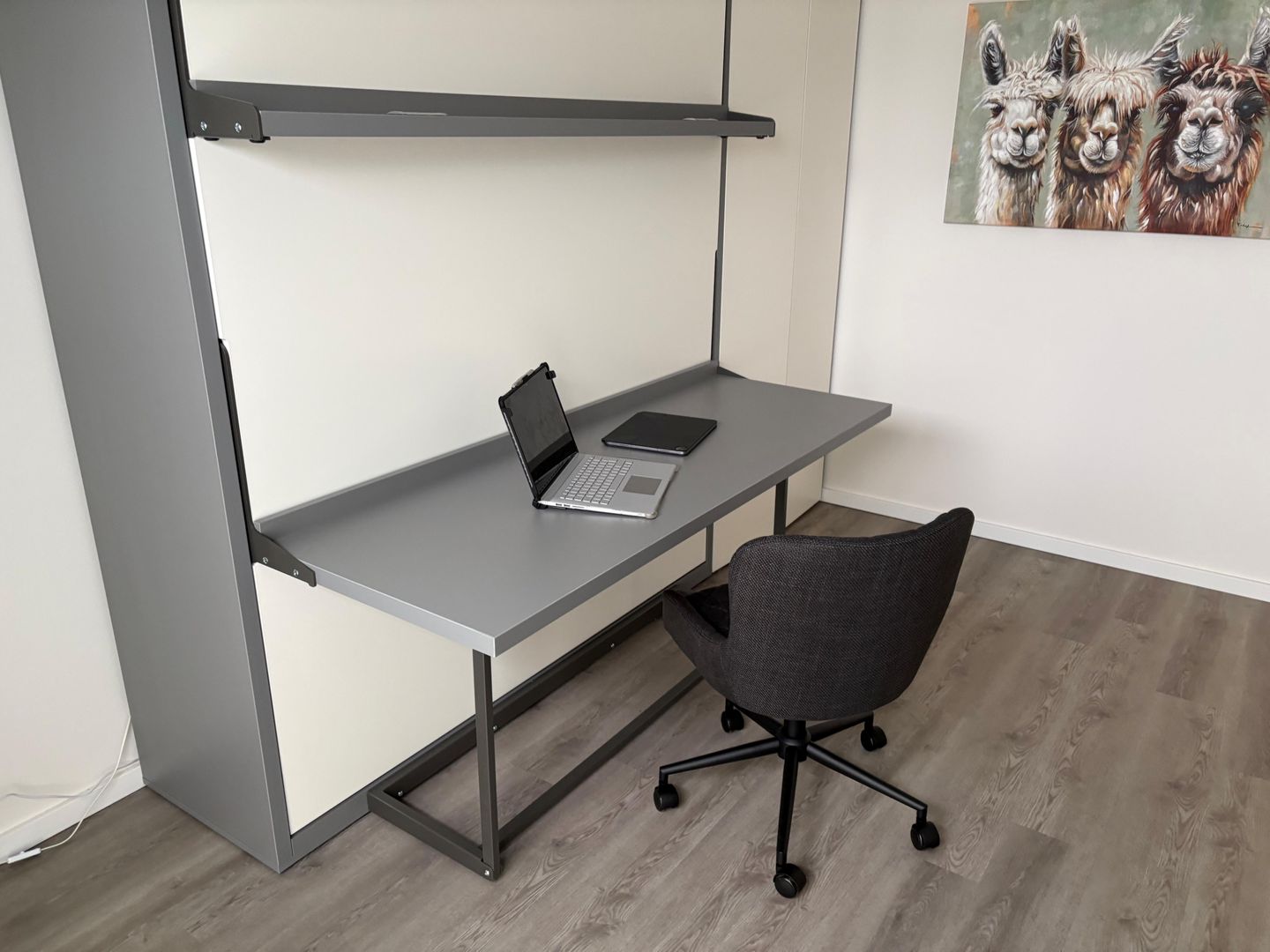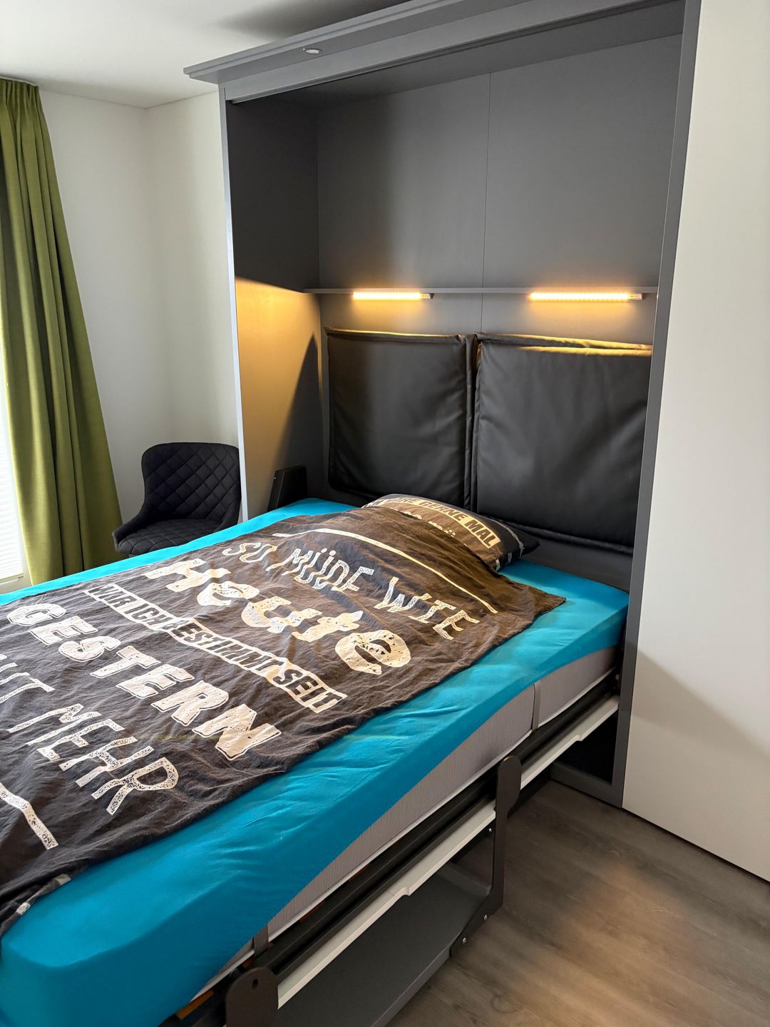 Schlafzimmer 2: Flexibel nutzbar: Ein Schrankbett (160 × 200 cm), das tagsüber in einen hochwertigen Schreibtisch umgebaut werden kann – ideal zum Arbeiten oder als Spielzone für Kinder.