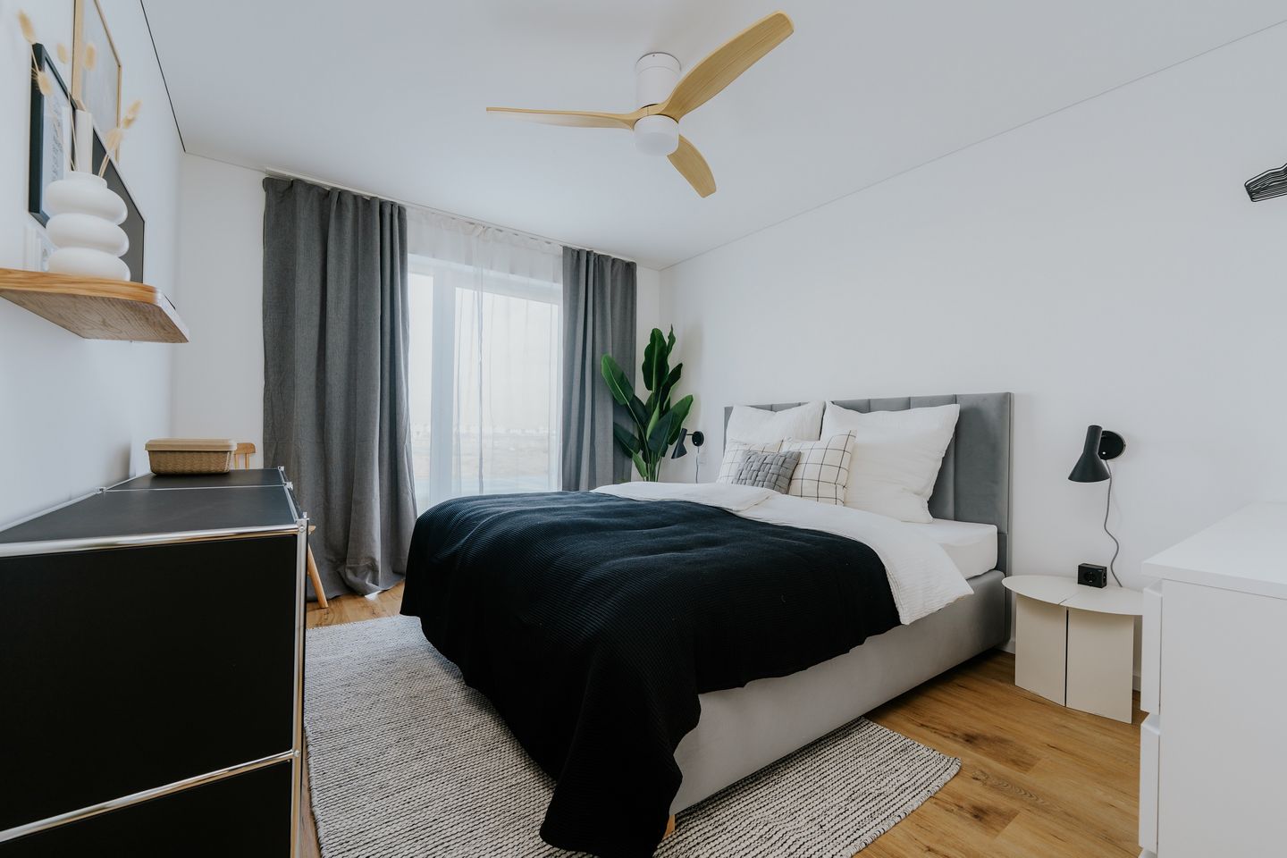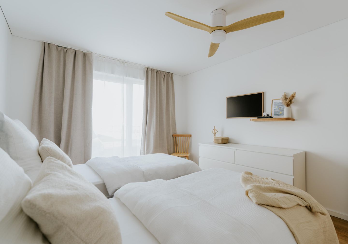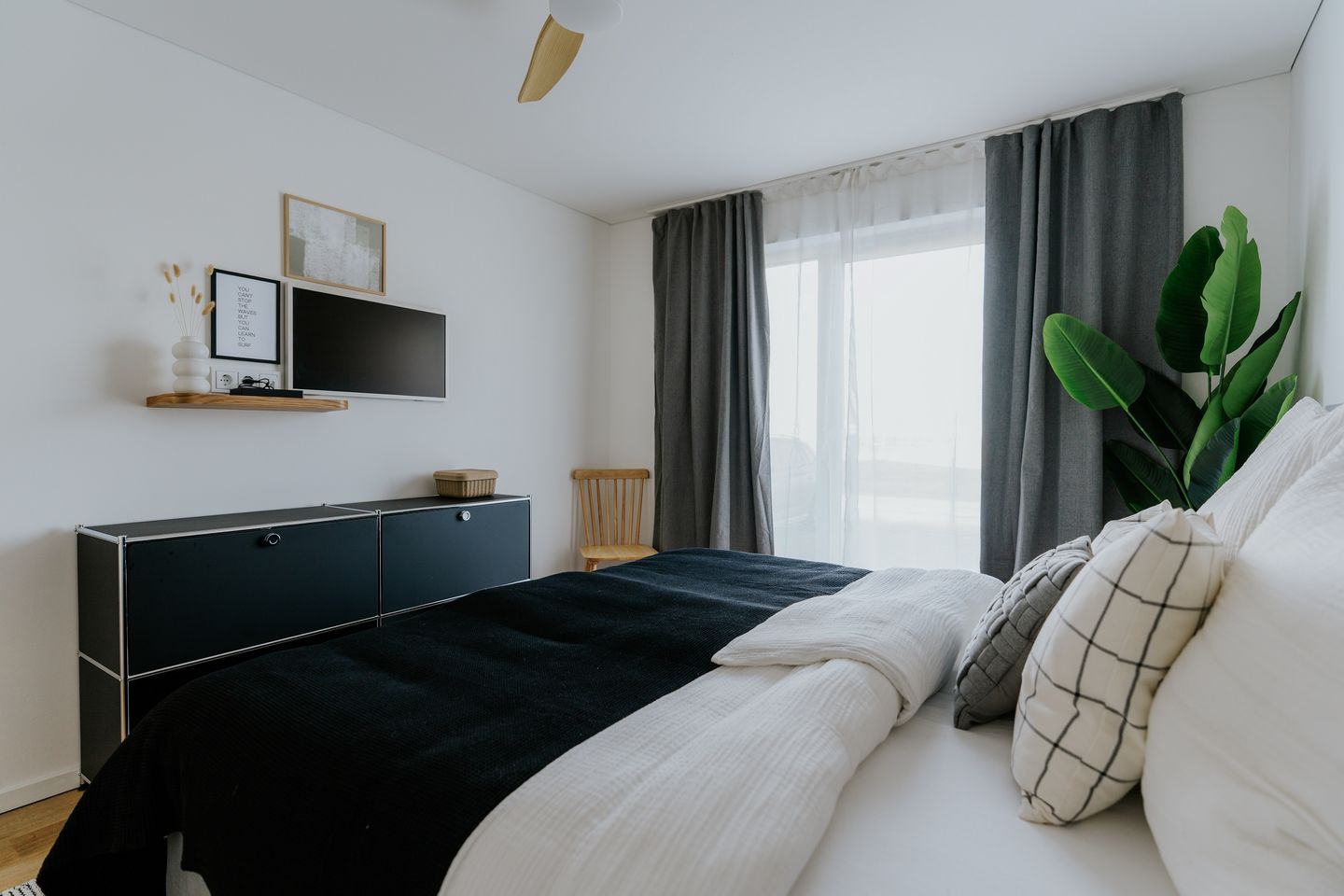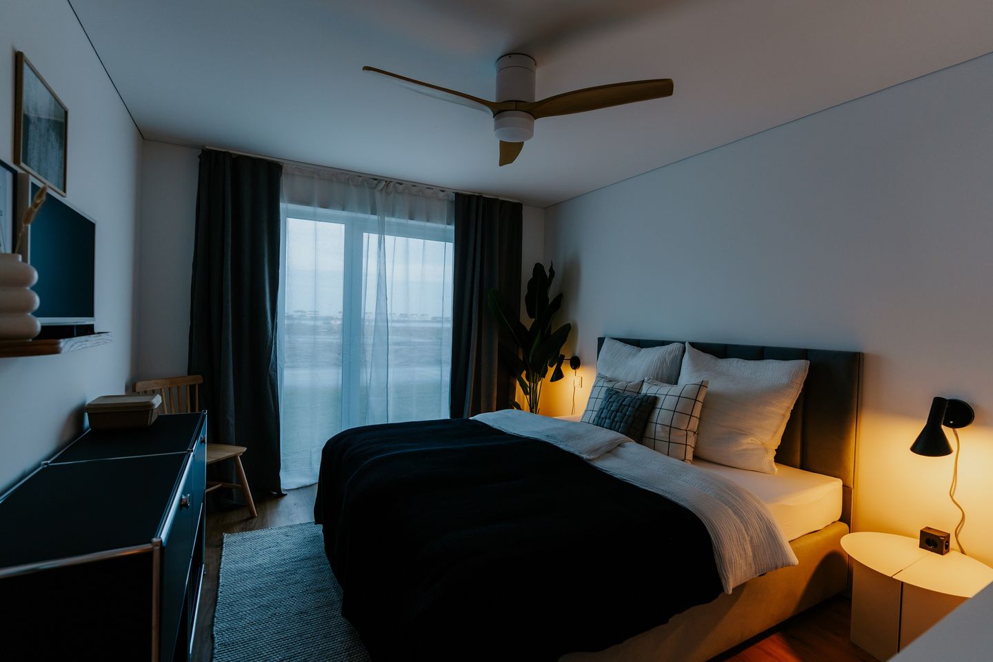 Beide Schlafzimmer sind mit komfortablen Boxspringbetten ausgestattet, die sich individuell als Doppel- oder Einzelbetten arrangieren lassen. Jedes Zimmer verfügt über einen Smart-TV und teils über einen herrlichen Blick auf das Hafenbecken. Lichtdurchlässige Vorhänge und Verdunkelungsgardinen sorgen für Privatsphäre und erholsamen Schlaf.