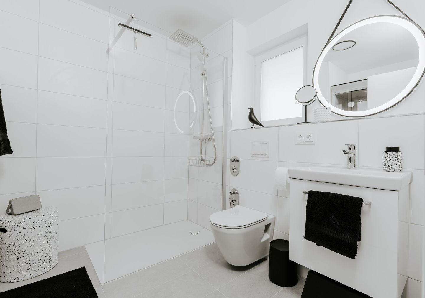 Im stilvollen Badezimmer erwartet dich eine bodengleiche Regendusche, ein Haartrockner, Kosmetikspiegel und Tageslicht. Das Highlight: deine private Infrarotsauna – dein ganz persönlicher Wellnessmoment. Für längere Aufenthalte stehen Waschmaschine, Wäscheständer, Bügeleisen & Bügelbrett sowie Akku-Staubsauger bereit.