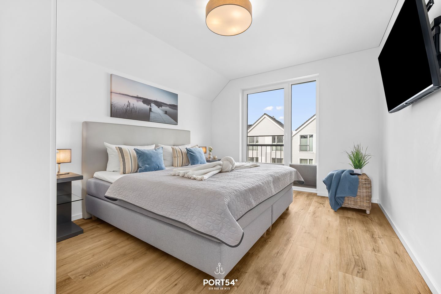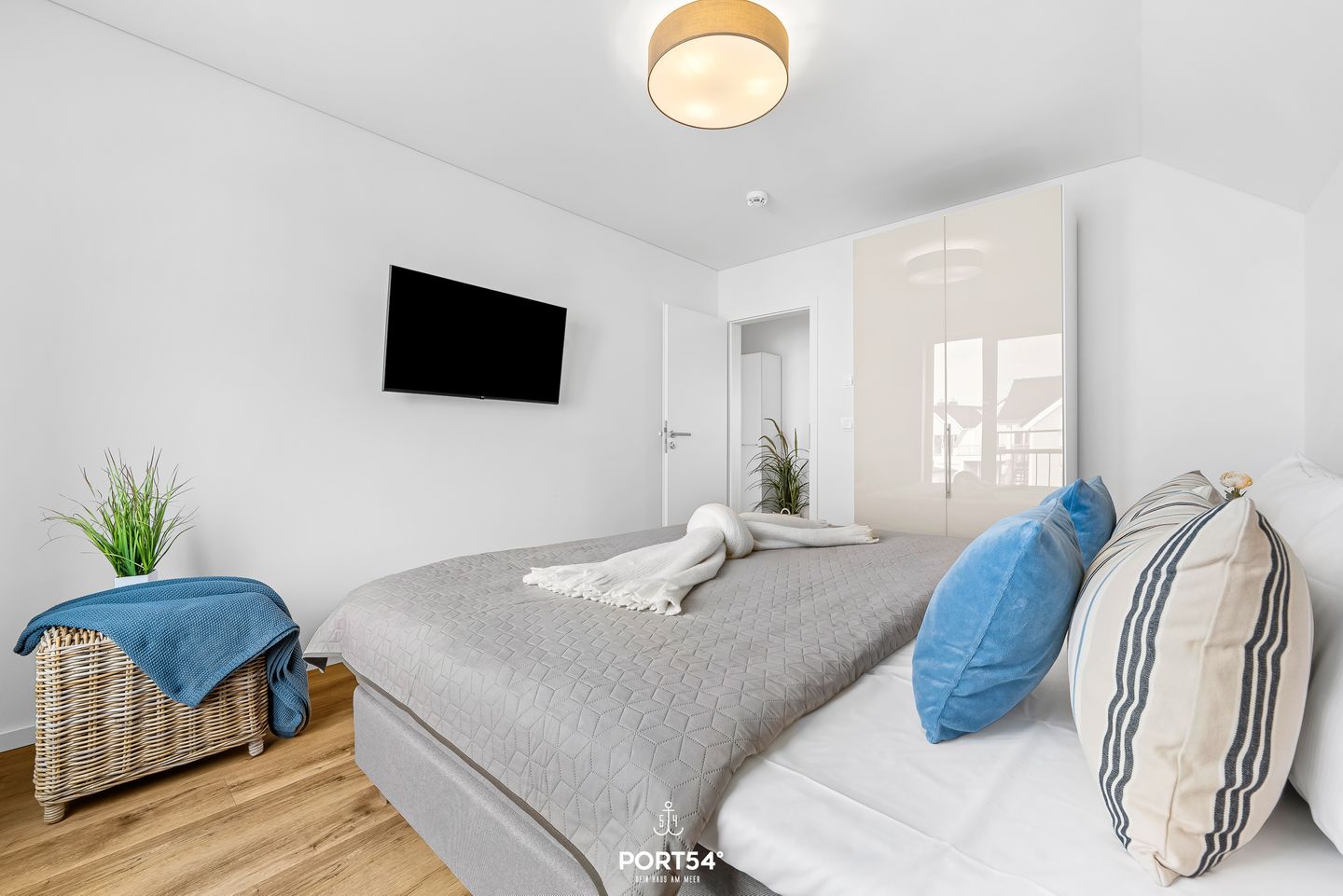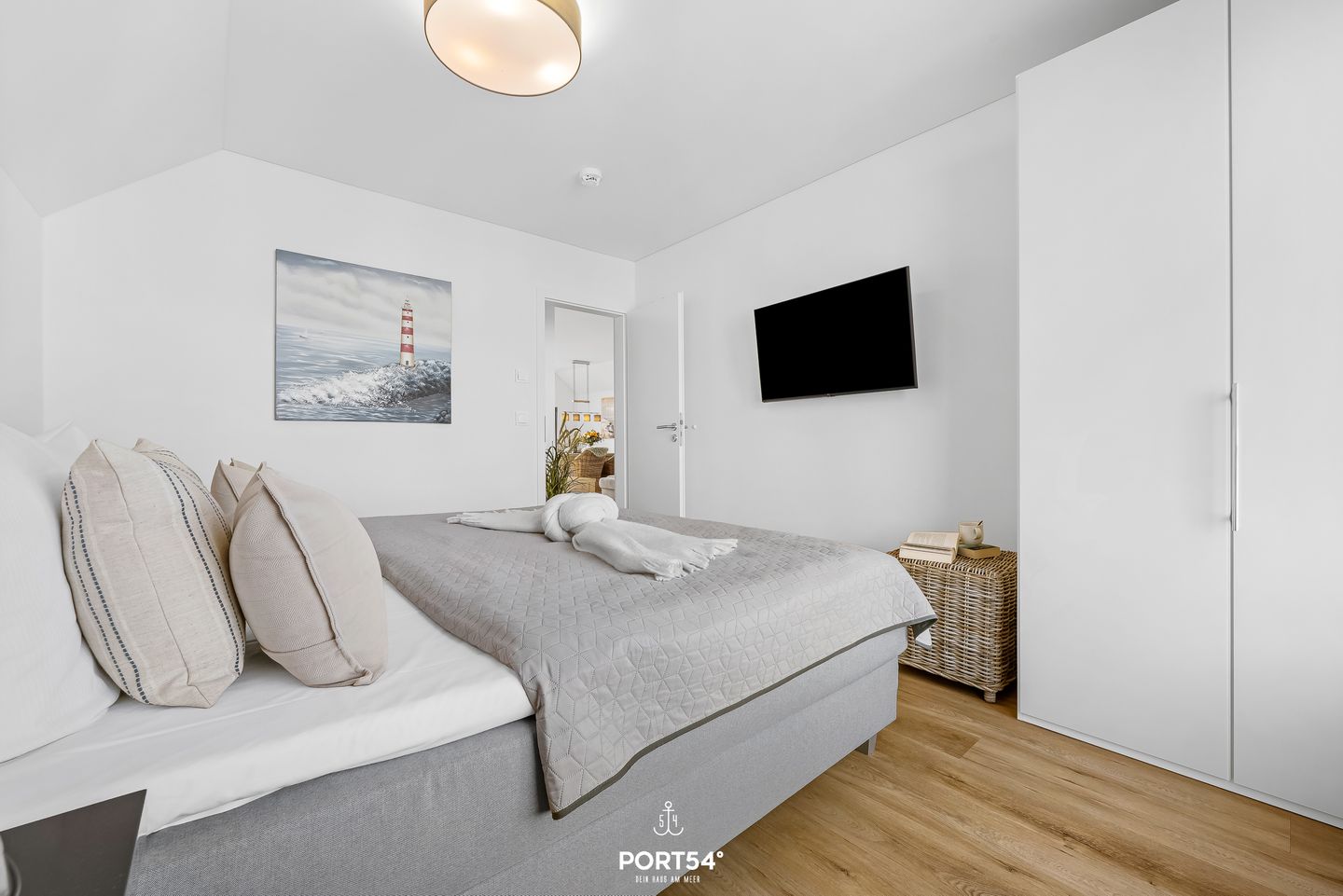 Die Ferienwohnung verfügt über zwei Schlafzimmer: eines mit einem komfortablen Doppelbett (180 × 200 cm), das zweite mit zwei Einzelbetten (je 80 × 200 cm). Beide Schlafzimmer sind mit Flachbild-TV, Kleiderschrank und Plissees ausgestattet und bieten ideale Rückzugsorte für erholsame Nächte. Das moderne Badezimmer mit bodengleicher Dusche sorgt nach einem Strandtag für angenehme Erfrischung. In allen Räumen sorgt die Fußbodenheizung für wohlige Wärme.