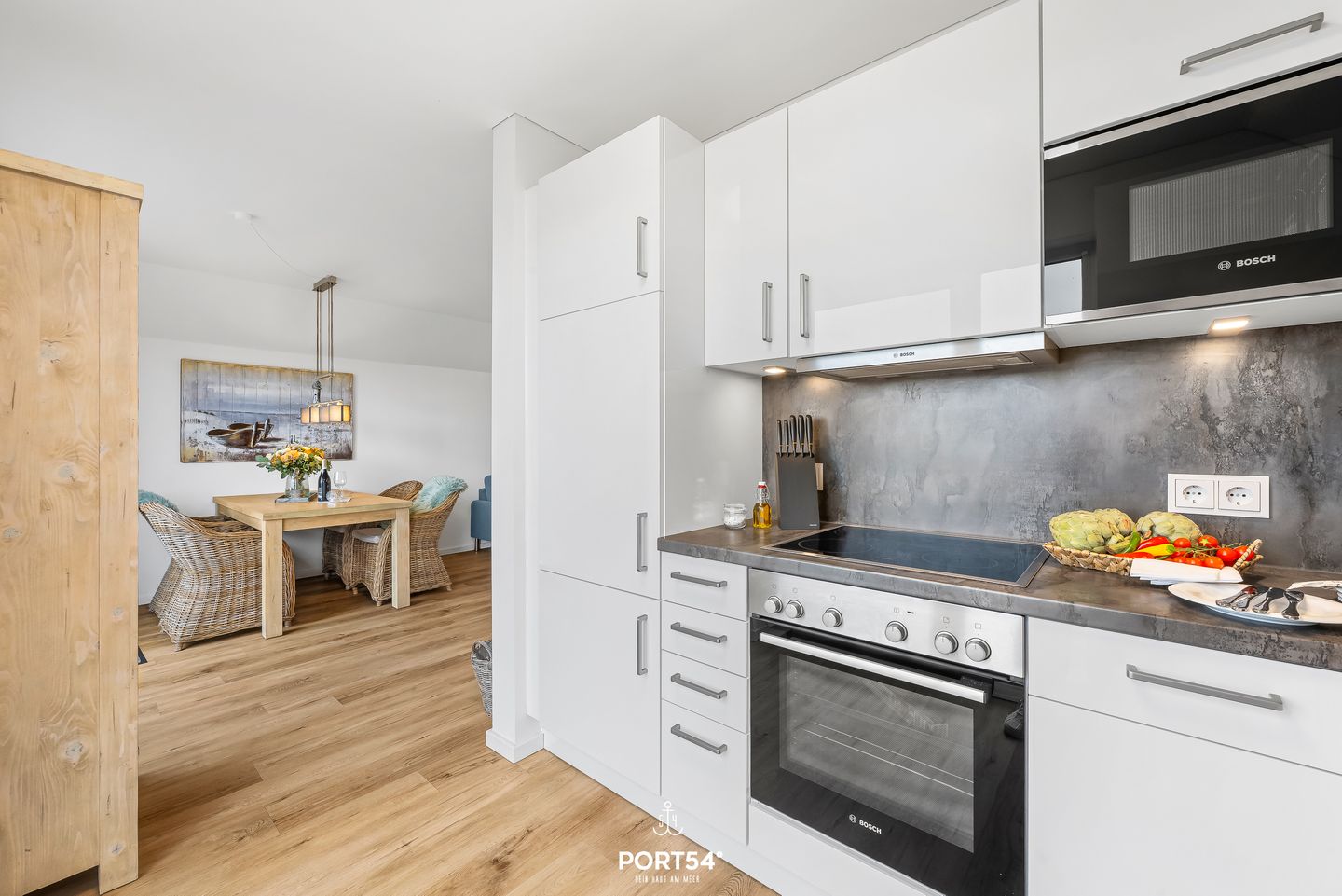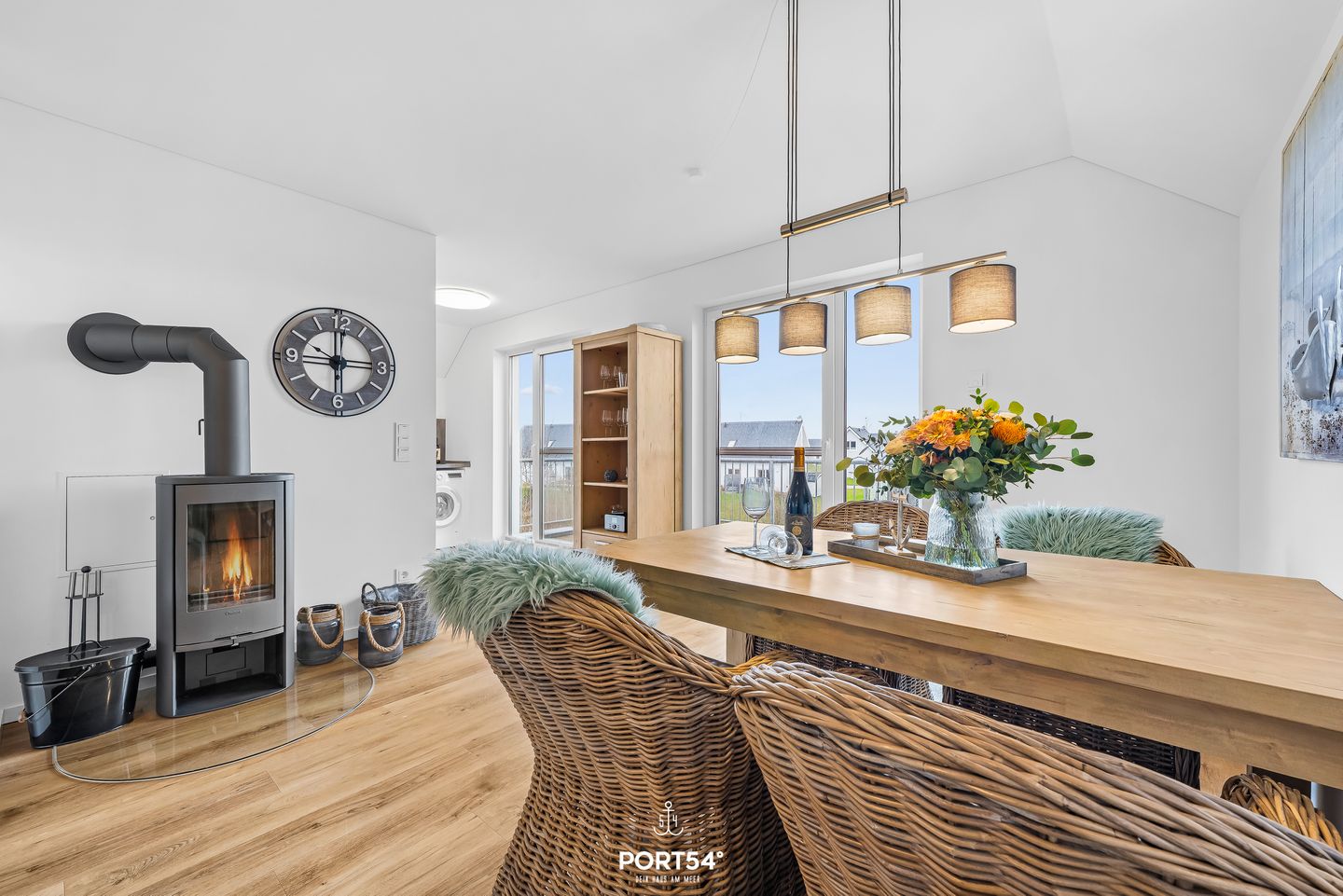 Der offen gestaltete Wohn- und Essbereich lädt zum Verweilen ein. Die moderne Küche ist bestens ausgestattet mit Cerankochfeld, Backofen, Spülmaschine, Mikrowelle, Kaffeemaschine und Kühlschrank und bietet alles, was Sie für entspannte Kochabende benötigen. Der angrenzende Essbereich eignet sich perfekt für gemeinsame Mahlzeiten. Im Wohnzimmer sorgt der Kaminofen an kühleren Tagen für eine behagliche Atmosphäre.