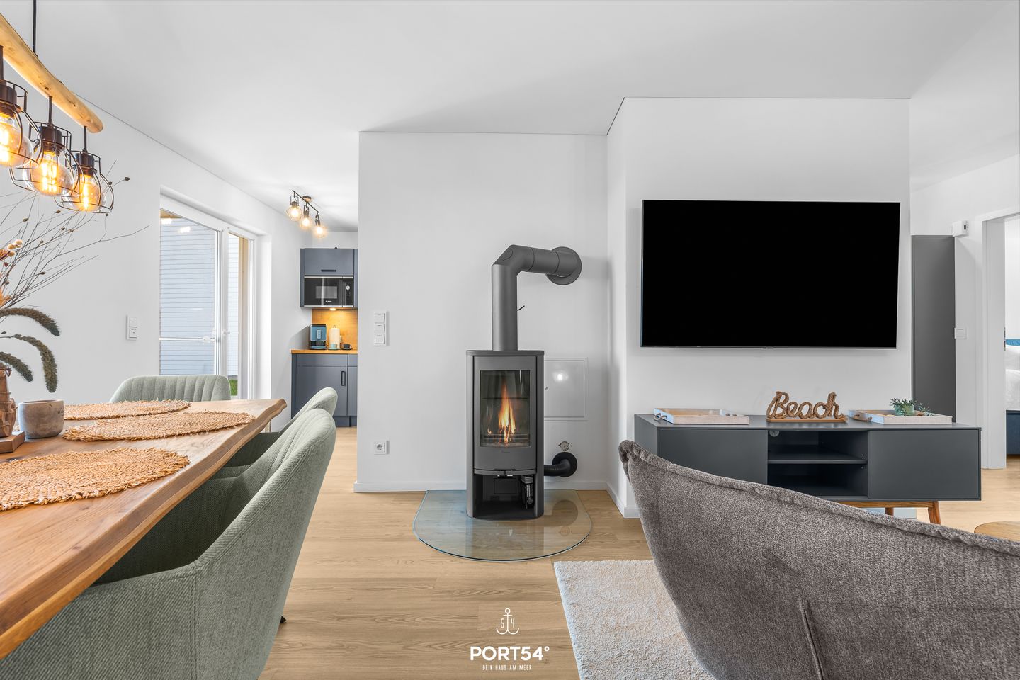 Im lichtdurchfluteten Wohnzimmer mit angrenzender, offener Küche, zwei Schlafzimmern und einem Badezimmer bietet das "Strandgeflüster“ alles, was man für einen Ostseeurlaub braucht. Im Wohnzimmer lädt eine Wohnlandschaft mit Schlaffunktion, sowie ein Flachbild-TV zu geselligen Abenden ein. Genießen Sie bei kälteren Temperaturen, oder durchgefroren von langen Strandspaziergängen die wohlige Wärme des Kamins. Die voll ausgestattete Küche lässt gemütliche, gemeinsame Kochabende im Urlaub zu einem Erlebnis werden. Morgens mit einem Kaffee aus dem Kaffeevollautomat mit Milchschaum in den Tag starten - was gibt es Schöneres? In einem der beiden Schlafzimmern finden Sie ein Doppelbett (180×200cm) und im anderen zwei Einzelbetten (90×200cm) vor. Beide Schlafzimmer bieten für eine gute Nachtruhe Verdunklungsmöglichkeiten. Das Badezimmer verfügt über eine ebenerdige Dusche und für den kleinen Wellnessurlaub über eine Infrarot-Sauna. Ein Föhn und ein Waschtrockner stehen ebenfalls für Sie bereit. Genießen Sie einen geselligen Grillabend auf der Terrasse mit der ganzen Familie. Gemütliche Gartenmöbel und ein Holzkohlegrill runden laue Sommerabende ab. Ein PKW-Stellplatz steht direkt vor dem Haus kostenfrei zur Verfügung.