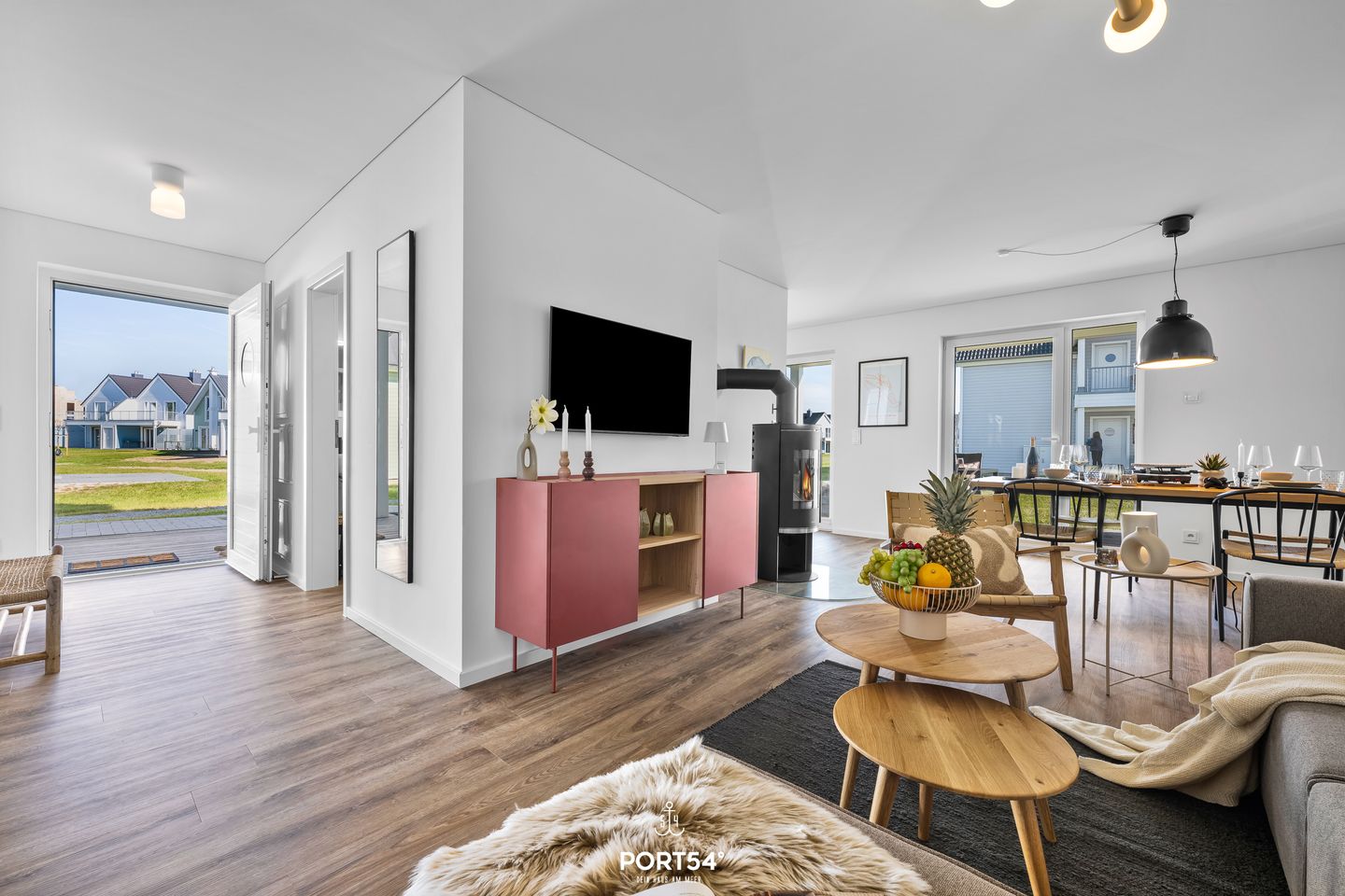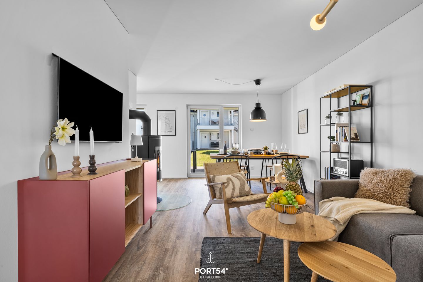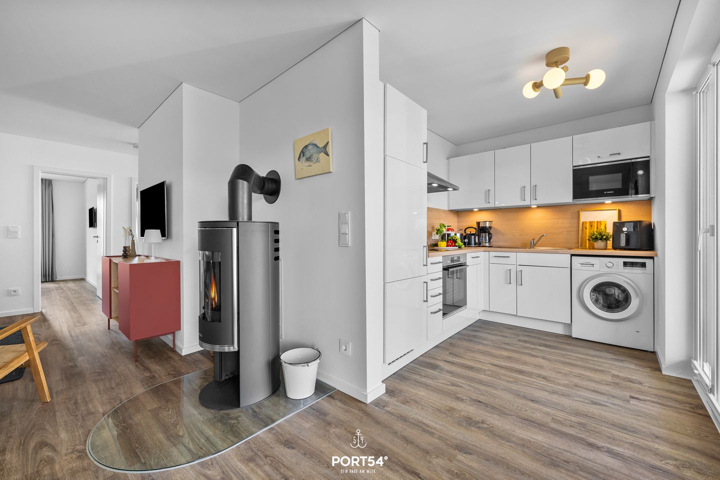 Die im Jahr 2025 fertiggestellte Unterkunft befindet sich im Erdgeschoss einer Ferienanlage und verfügt drei Zimmer, die sich ideal für bis zu vier Personen eignen. Dank der geschickten Raumaufteilung finden Familien, Paare oder kleine Reisegruppen beste Voraussetzungen für einen erholsamen Aufenthalt vor. Der offen gestaltete Wohn- und Essbereich bildet das Herzstück der Wohnung. Die hochwertige, moderne Einbauküche ist offen zum Wohnzimmer angelegt und lässt hinsichtlich Ausstattung keine Wünsche offen: Hier stehen Ihnen ein Induktionsherd, Backofen, Kühlschrank mit integriertem Gefrierfach, Spülmaschine, Heißluftfritteuse , Mikrowelle, Kaffeemaschine, Wasserkocher, Toaster, Mixer sowie sämtliche Küchenutensilien und Geschirr zur Verfügung. Für gemeinsames Kochen und genussvolles Essen sorgt der Esstisch im Essbereich. Die Fußbodenheizung gewährleistet auch in der kühleren Jahreszeit angenehme Temperaturen. Im Wohnbereich erwartet Sie ein gemütliches Sofa, ein Kaminofen für behagliche Stunden sowie zwei digitale Fernseher mit WLAN-Internetzugang – ideale Voraussetzungen für entspannte Abende. Zwei separate Schlafzimmer laden zum Ausruhen und Entspannen ein. Beide Räume sind so konzipiert, dass bis zu vier Schlafmöglichkeiten zur Verfügung stehen. Familienfreundlichkeit wird großgeschrieben: Ein Babybett mit Matratze und ein Kinderhochstuhl stehen bereit. Das großzügige Badezimmer ist mit einer bodengleichen Dusche, Waschbecken, Spiegel, WC und Fenster ausgestattet. Für Ihr Wohlbefinden verfügt die Wohnung über eine Infrarotkabine. Ein Haartrockner, Waschmaschine sowie Wäscheständer, Staubsauger und weitere hilfreiche Ausstattungen runden das Angebot ab. Die Erholung im Außenbereich ermöglicht Ihnen eine private Terrasse mit Gartenmöbeln und Sonnenliegen. Ein Elektrogrill steht bereit, ebenso wie ein gepflegter Garten mit Liegewiese. Nach einem erlebnisreichen Tag an der Ostsee können Sie hier entspannen und die frische Meeresluft genießen. Für Ihren PKW steht ein Privatparkplatz und ein abschließbarer Fahrradschuppen direkt an der Unterkunft zur Verfügung. Auch Hunde sind herzlich willkommen.