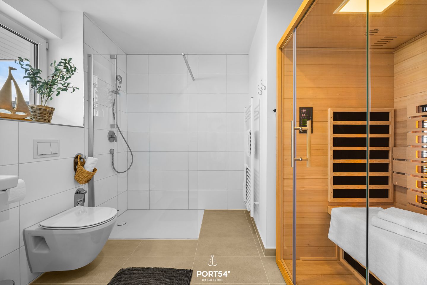 Das moderne Badezimmer verfügt über eine bodengleiche Dusche, Waschbecken, WC, Ganzkörperspiegel, Kosmetikspiegel und Haartrockner. Als weiteres Highlight gibt es zusätzlich eine private Infrarotkabine – perfekte Voraussetzungen für entspannte Wellnessmomente nach einem Tag am Strand. In sämtlichen Wohnräumen sorgt Fußbodenheizung für angenehme Temperaturen. Ergänzt wird die Ausstattung durch eine eigene Waschmaschine, Bügeleisen, Bügelbrett, Staubsauger und Wäscheständer, sodass Ihnen auch bei längeren Aufenthalten ein Maximum an Komfort geboten wird.