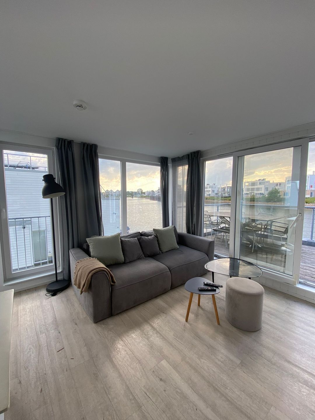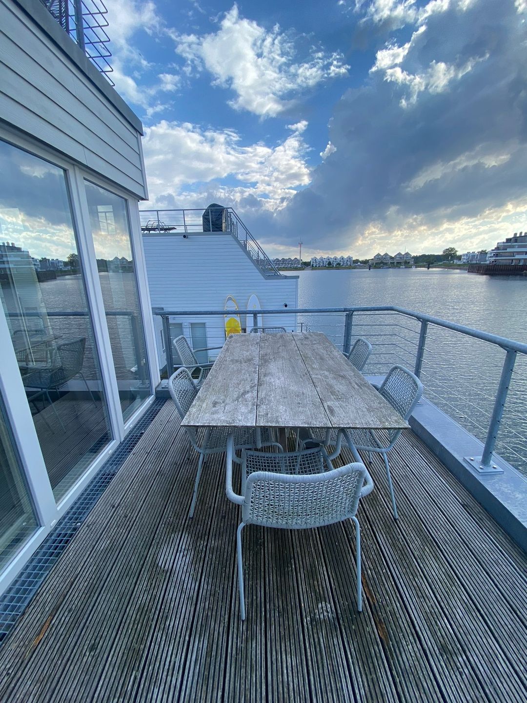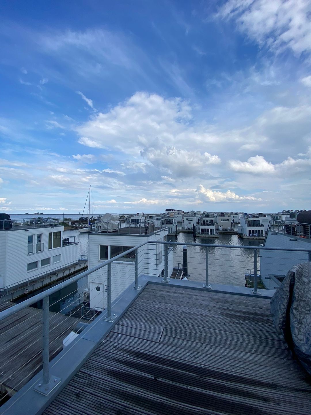 Auf der Terrasse oder dem Balkon genießt Du einen fantastischen Meerblick, der fast an das Sonnendeck eines Bootes erinnert. Die Dachterrasse mit ihrer runden Sonneninsel lädt zum Sonnenbaden, Lesen oder einfach zum Entspannen mit Blick auf das Wasser ein.