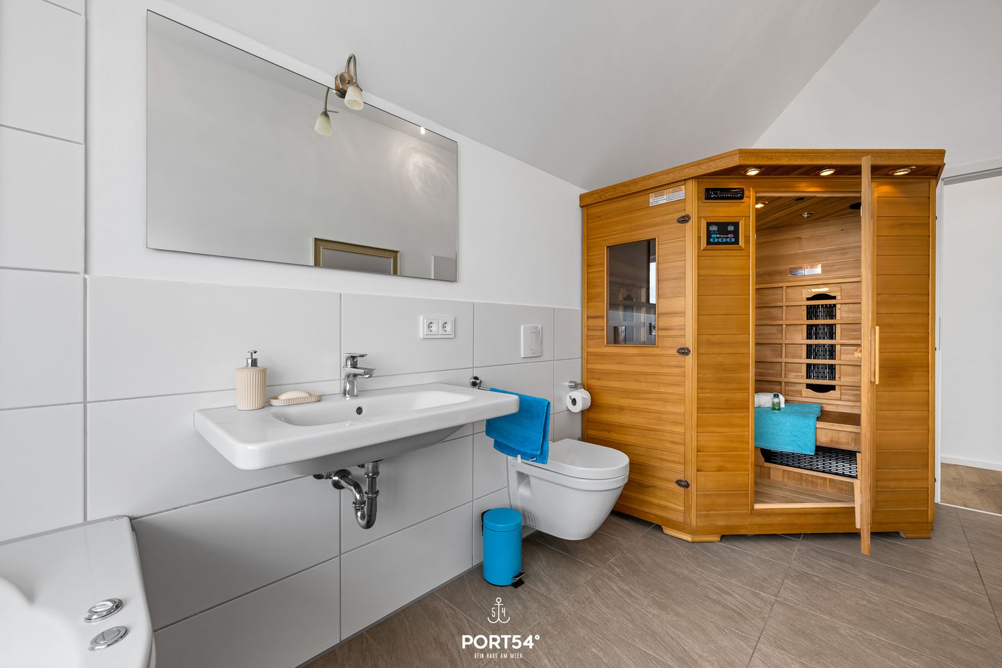 Zur Wohnung gehören zwei Badezimmer. Eines davon ist mit einer Whirlwanne und einer privaten Sauna ausgestattet und lädt Dich zu entspannten Wellnessmomenten ein. Das zweite Badezimmer verfügt über eine ebenerdige Dusche und eignet sich ideal zur Erfrischung nach einem erlebnisreichen Tag am Meer oder in der Umgebung.