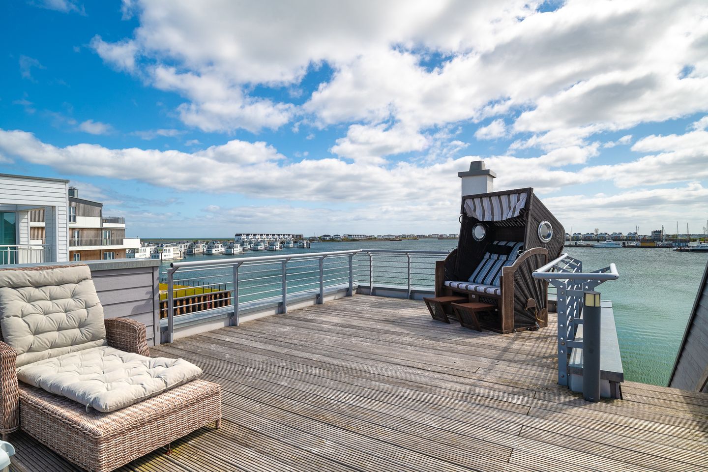 Das offene Wohnzimmer besticht durch eine gemütliche Sofaecke, einen Kaminofen für behagliche Abende in der kühleren Jahreszeit sowie einen Essbereich mit Esstisch, an dem gemeinsame Mahlzeiten eingenommen werden können. Die großen Fenster bieten einen außergewöhnlich guten Blick auf das Hafenbecken und die umliegende Natur. Das elegante Ambiente wird durch eine moderne Fußbodenheizung und stilvolle Einrichtung abgerundet.