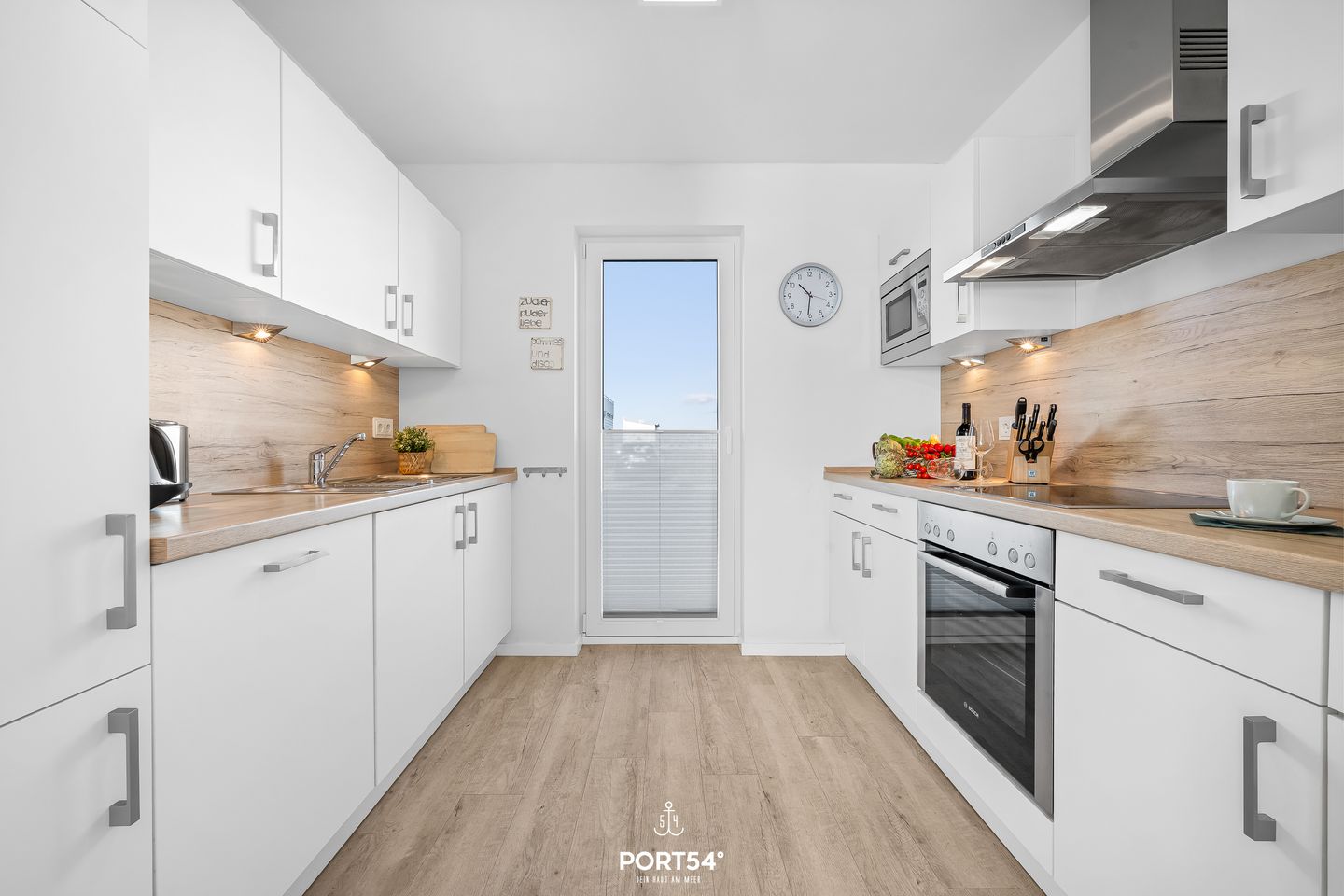Die hochwertig ausgestattete Küche ist ideal für gesellige Kochabende geeignet. Im Erdgeschoss befindet sich zusätzlich ein Gäste-WC.