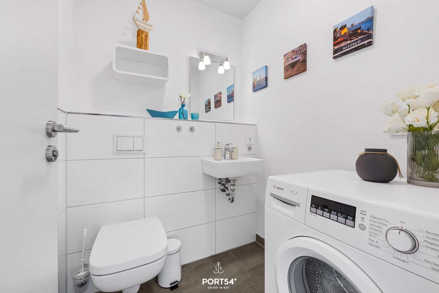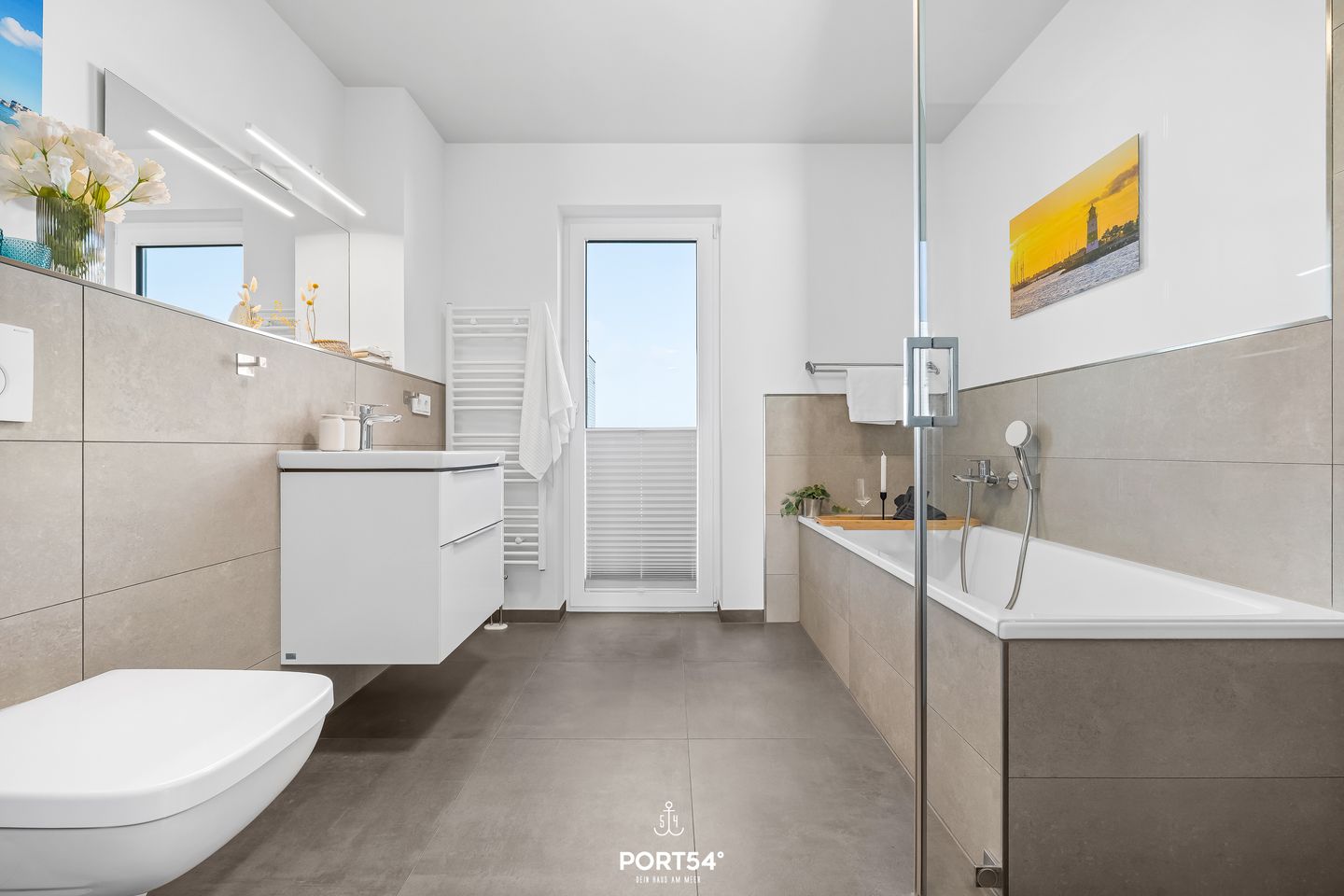 Im ersten Obergeschoss bieten Dir zwei Schlafzimmer Platz für 4 Personen. Das Hauptschlafzimmer ist mit einem großen Doppelbett ausgestattet und zur Hafenseite ausgerichtet. Im zweiten Schlafzimmer befinden sich zwei Einzelbetten, die Du problemlos zusammenschieben kannst, um gemeinsam den Blick auf die Schlei zu genießen. Das Badezimmer auf dieser Etage ist mit einer Dusche sowie einer Badewanne ausgestattet und verspricht Dir Entspannung pur.
