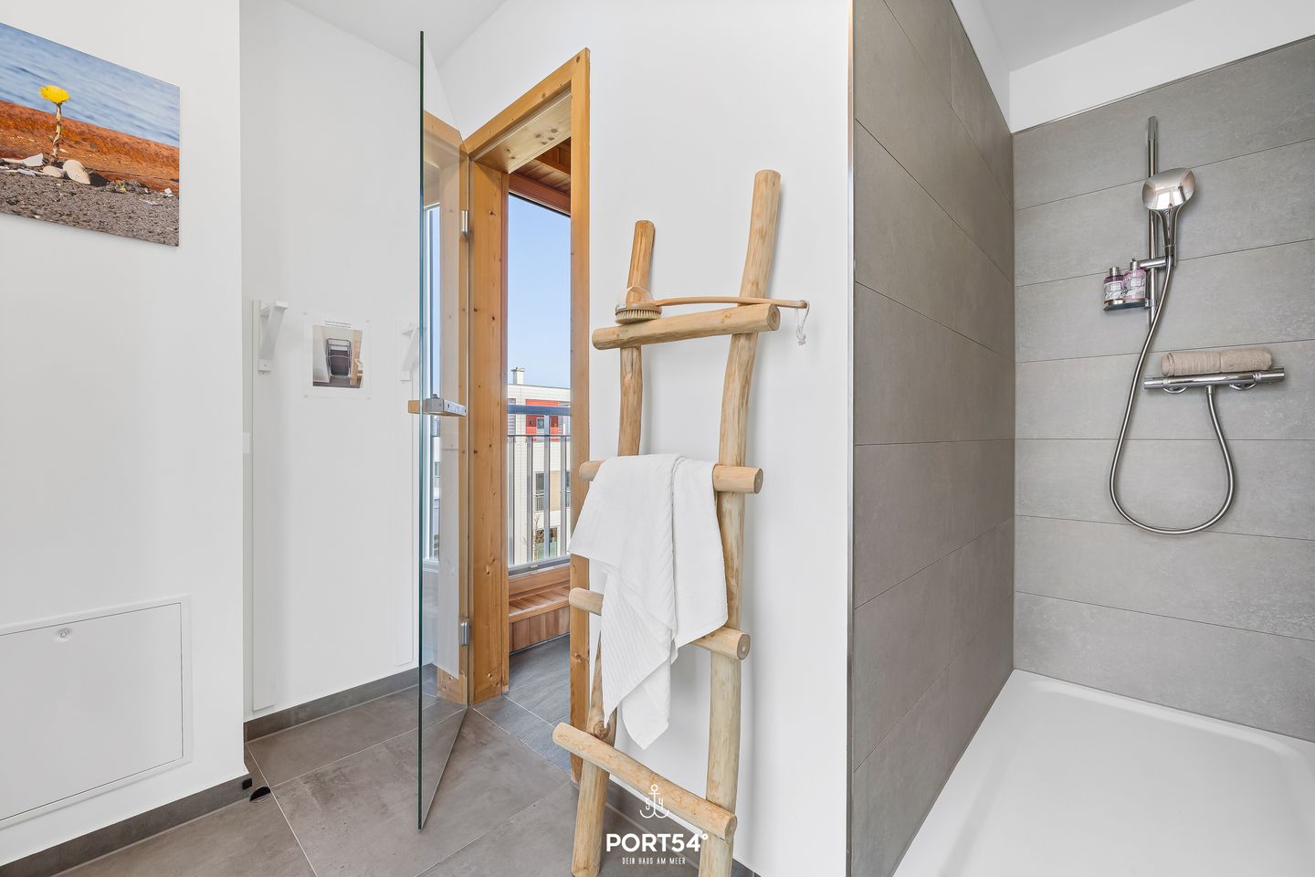 Ein besonderes Highlight des Hauses ist das Studio im zweiten Obergeschoss. Auch hier genießt Du einen fantastischen Blick über die Schlei und den gesamten Hafen des Resorts. Dieser zusätzliche Wohnbereich ist mit einer komfortablen Schlafcouch für zwei Personen ausgestattet. Vom Studio aus erreichst Du die großzügige Dachterrasse, von der aus Du den Sonnenuntergang bestaunen kannst. Zusätzlich befinden sich im Dachgeschoss die Sauna sowie eine weitere große Dusche – perfekt, um den Tag mit etwas Wellness ausklingen zu lassen.
