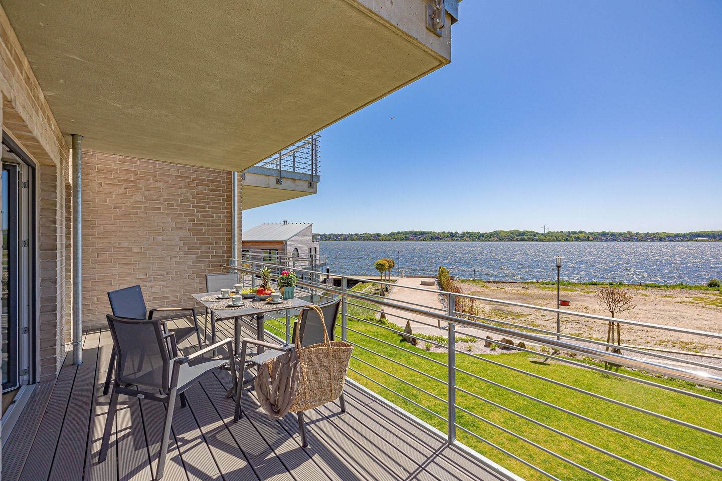 Mit direktem Wasserblick und in einzigartiger Lage direkt an der Schlei bietet die „Schlei-Koje 5“ am Pionierhafen Schleswig den perfekten Ort für Ihren Urlaub. Die Ferienwohnung bietet auf 74m² im 1. OG. Einen offenen Wohn- und Essbereich mit Küche, zwei Schlafzimmer, ein Badezimmer und einen Balkon. Die vollausgestattete Küche lässt keine Wünsche offen und im Wohnzimmer können Sie Ihre Urlaubstage auf dem Sofa vor dem Smart-TV ausklingen lassen. Das eine Schlafzimmer bietet ein gemütliches Doppelbett (180x200cm) sowie Verdunklungsmöglichkeiten für erholsame Nächte. Das andere Schlafzimmer verfügt über zwei Einzelbetten (je 90x200cm) und Verdunklungsmöglichkeiten. In dem Badezimmer finden Sie einen Föhn und eine Dusche vor sowie WC und Waschbecken. Auf dem Balkon können Sie sich entspannen und an lauen Abenden Ihre Urlaubstage ausklingen lassen. Ein eigener Parkplatz steht Ihnen direkt vor dem Haus zur Verfügung. Ihre Fahrräder können Sie im offenen gemeinschaftlich genutzten Fahrradraum unterstellen. Im Erdgeschoss steht eine Waschmaschine zur gemeinschaftlichen Nutzung kostenfrei für Sie zur Verfügung. Am Pionierhafen wird Wert auf Nachhaltigkeit gelegt, daher wird 77 % der Energie durch Erdwärme bezogen. Durch die einzigartige Lage am Ostseefjord Schlei kann auch ein Boot mitgebracht und auf einem Liegeplatz gegen Gebühr direkt am Pionierhafen angelegt werden. Bitte sprechen Sie uns hierfür an.