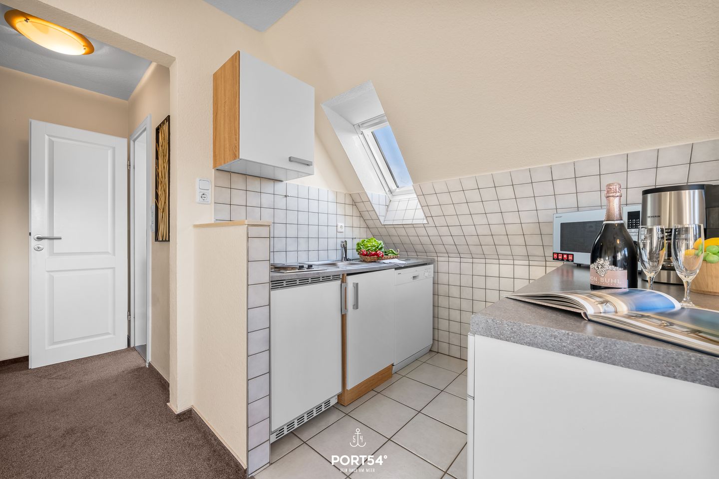 Die offene Küche ist umfangreich ausgestattet und lässt keine Wünsche offen: Zu den zahlreichen Annehmlichkeiten zählen ein Ceranherd, Backofen mit Elektroanschluss, Mikrowelle, Kühlschrank mit integriertem Gefrierfach, Kaffeemaschine, Wasserkocher, Toaster und sogar ein Sandwich-Toaster. Geschirr, Besteck und sämtliche Küchenutensilien sind ebenso vorhanden wie ein Staubsauger. Somit steht einer rundum gelungenen Selbstversorgung nichts im Wege.