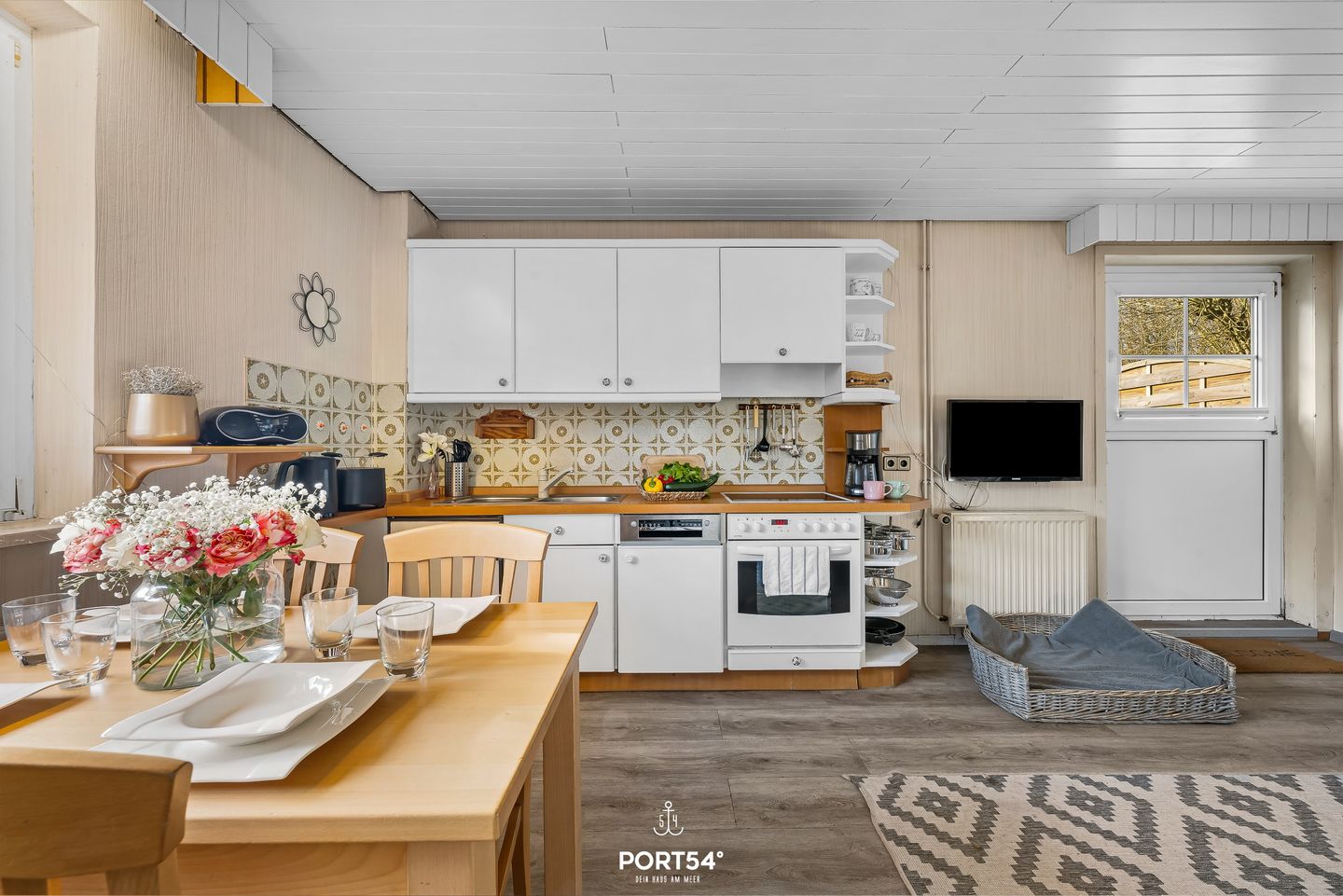 Das Ferienhaus ist modern und zugleich gemütlich eingerichtet. Im Erdgeschoss findest du den einladenden Wohnbereich mit bequemer Sofaecke, Flachbild-TV und einem Essplatz, an dem du die zubereiteten Mahlzeiten gemeinsam genießen kannst. Große Fenster mit Sichtschutz lassen viel Tageslicht herein und bieten – zusammen mit dem parterre gelegenen Zugang – einen schönen Blick in den Garten. Die offene Küche grenzt direkt an das Wohnzimmer und lässt keine Wünsche für Selbstversorger offen: Sie ist ausgestattet mit Ceranherd, Backofen, Kühlschrank mit Gefrierfach, Wasserkocher, Toaster, Kaffeemaschine sowie ausreichend Geschirr und Besteck.