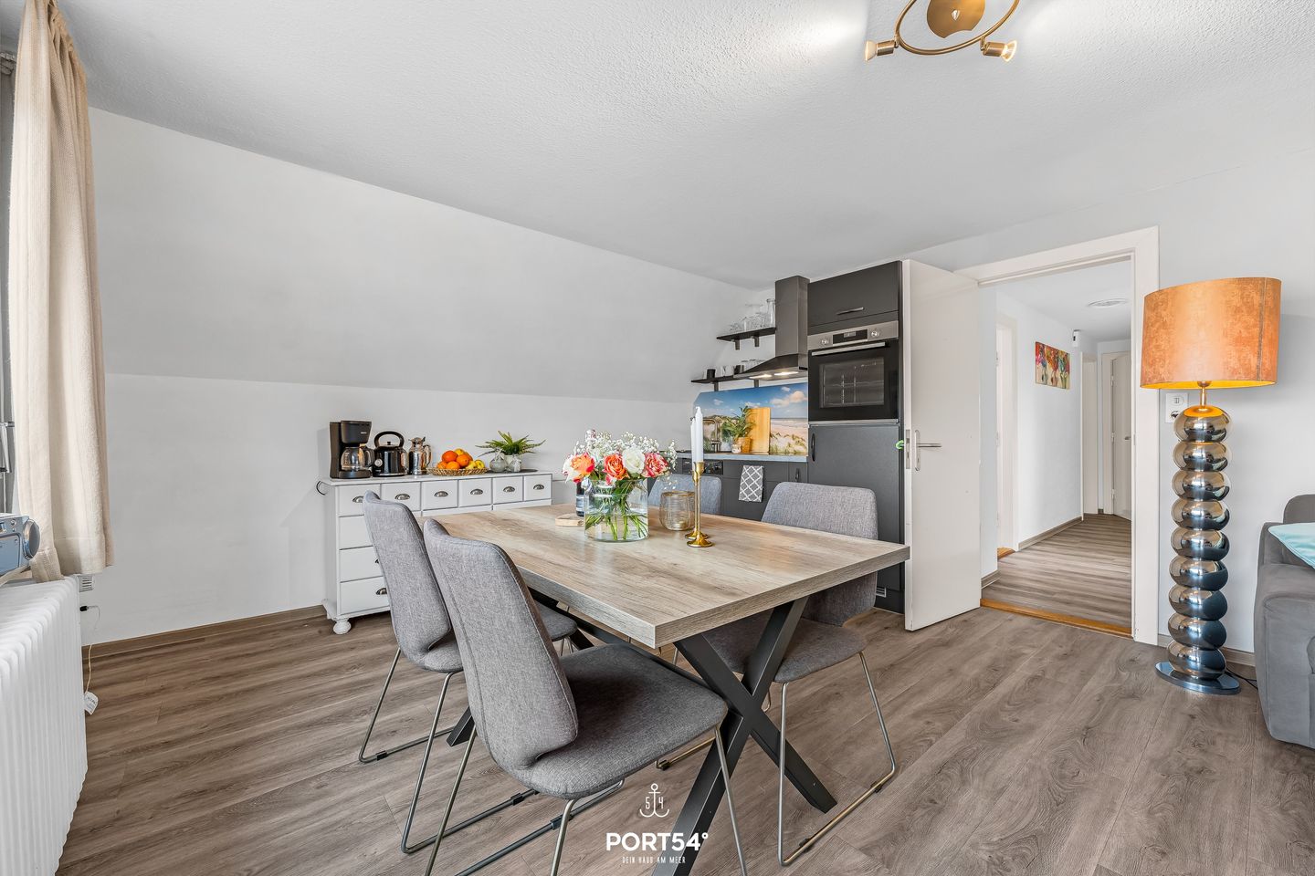 Die 60 m² große Ferienwohnung liegt im ersten Obergeschoss und erstreckt sich über eine Ebene. Sie verfügt über zwei separate Schlafzimmer mit insgesamt bis zu drei Schlafmöglichkeiten und bietet damit ausreichend Platz für Paare, kleine Familien oder einen entspannten Urlaub mit Enkelkind. Ein Hochstuhl ist vorhanden, sodass auch Reisen mit Kleinkind unkompliziert möglich sind. Die Wohnung ist überschaubar, gut geschnitten und ideal für Gäste, die Komfort ohne unnötigen Trubel schätzen.