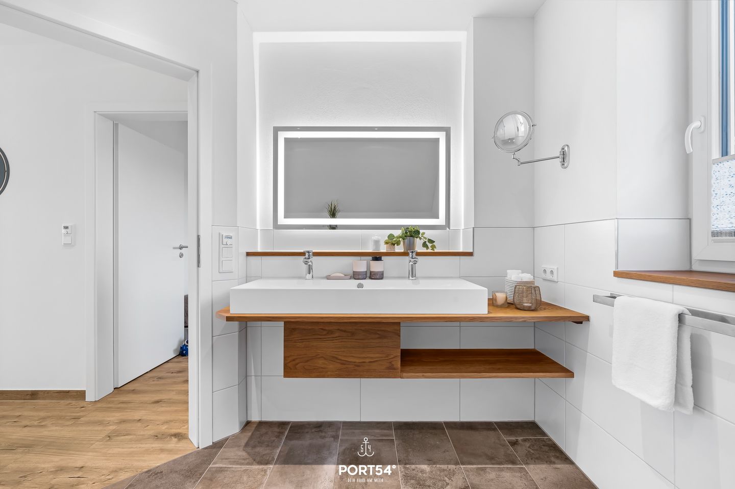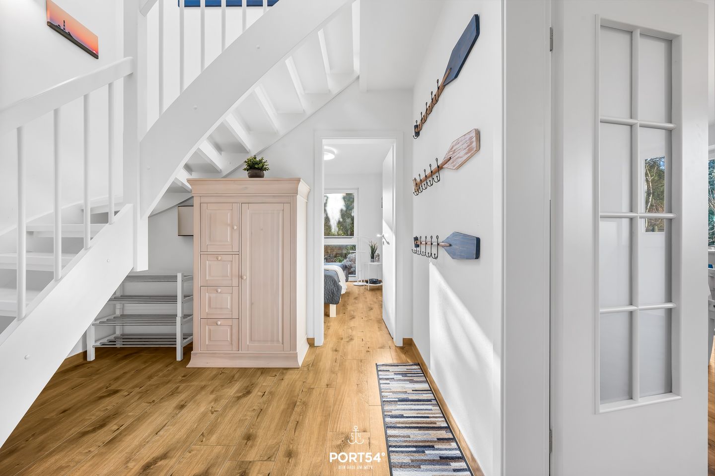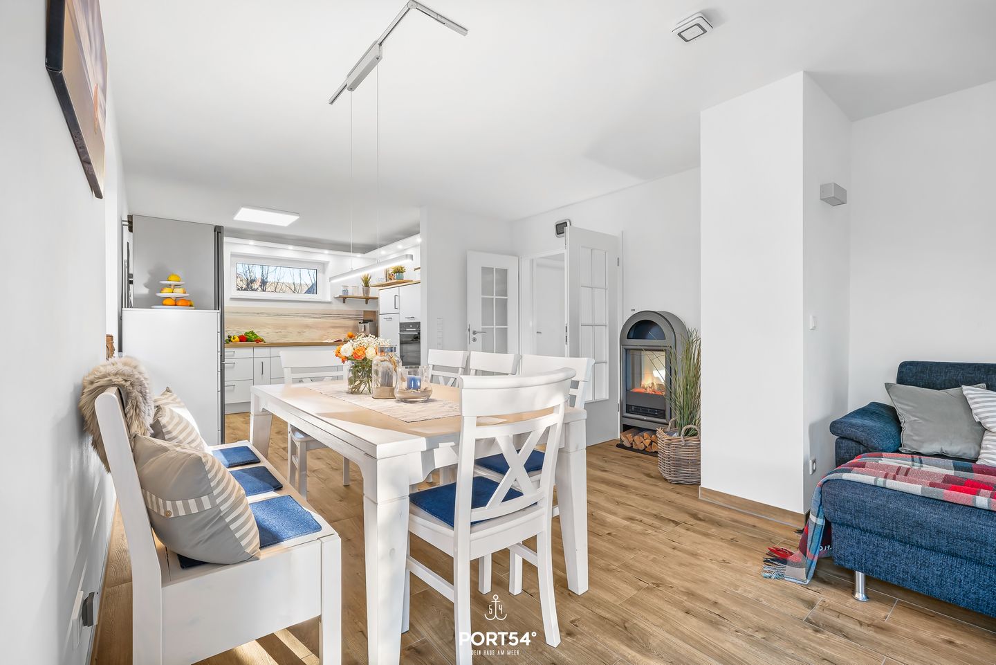 Im offenen Wohn- und Essbereich finden Sie eine komfortable Sofaecke, einen separaten Essplatz und zahlreiche Fenster, die viel Tageslicht hereinlassen und den Blick ins Grüne ermöglichen. Der elektrische Kamin verleiht dem Raum noch mehr Gemütlichkeit. Vier digitale Fernseher stehen Ihnen ebenso zur Verfügung wie eine schnelle Internetverbindung, sodass auch das Arbeiten aus dem Ferienhaus problemlos möglich ist. Zur Entspannung im Freien laden die sonnige Terrasse mit Gartenblick, Sonnenliegen, zwei Strandkörbe sowie eine Liegewiese ein – ideale Voraussetzungen, um die maritime Atmosphäre in aller Ruhe zu genießen. Grillfreunde können den eigenen Gasgrill und das Gartenhaus nutzen, während Gartenmöbel zu geselligen Mahlzeiten im Freien einladen.