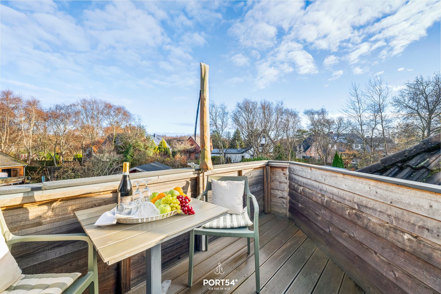 Das Wohnzimmer ist mit einem gemütlichen Sofa sowie einem Esstisch ausgestattet und bietet Zugang zu einem Balkon mit Gartenblick. Hier stehen Gartenmöbel und ein Sonnenschirm zur Verfügung, sodass Sie den Ausblick auf die grüne Umgebung genießen können.