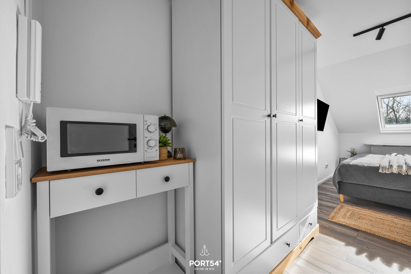 Die vollausgestattete Küchenzeile im Eingangsbereich ist durch eine Tür zum Wohn-/Schlafbereich zu trennen und praktisch für deine Selbstversorgung. Dir stehen ein Induktionsherd, eine Mikrowelle, ein Kühlschrank mit Gefrierfach, eine Kaffeemaschine, ein Wasserkocher und ein Toaster zur Verfügung. Geschirr, Besteck und weitere Küchenutensilien sind selbstverständlich ebenfalls vorhanden.
