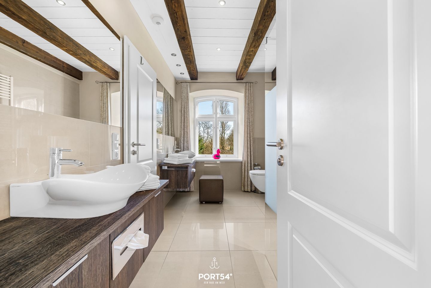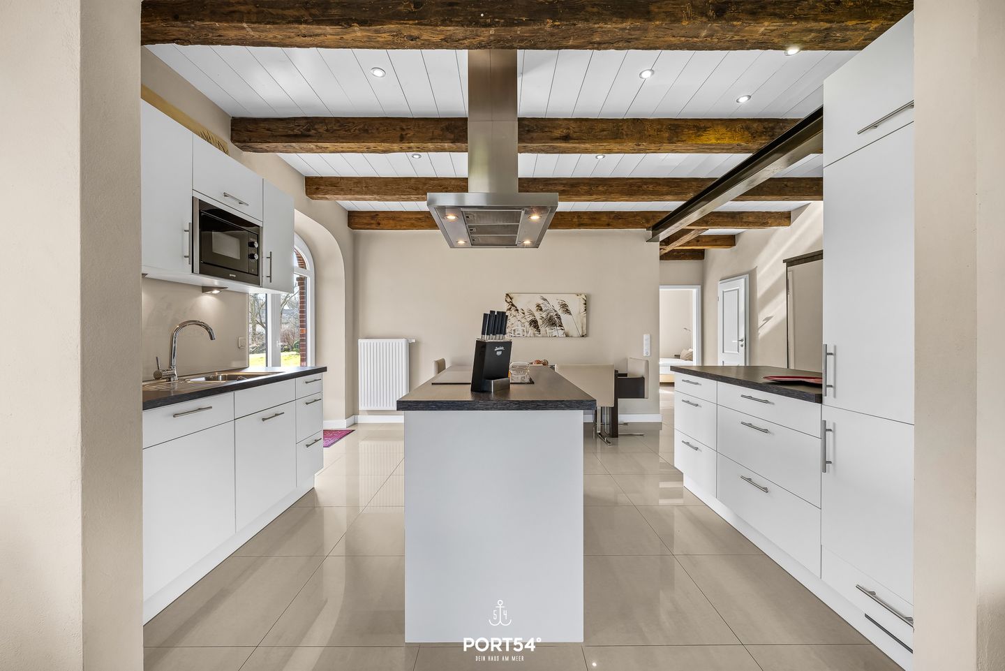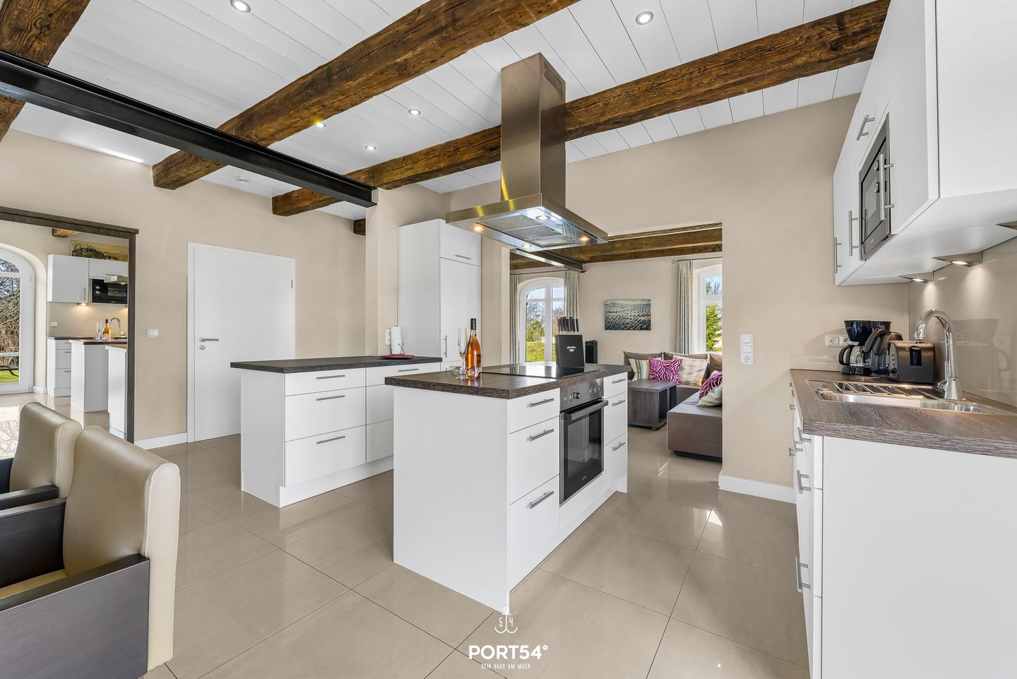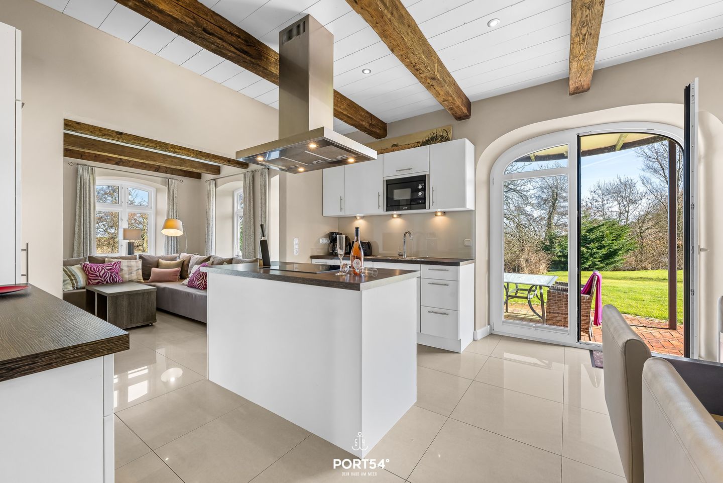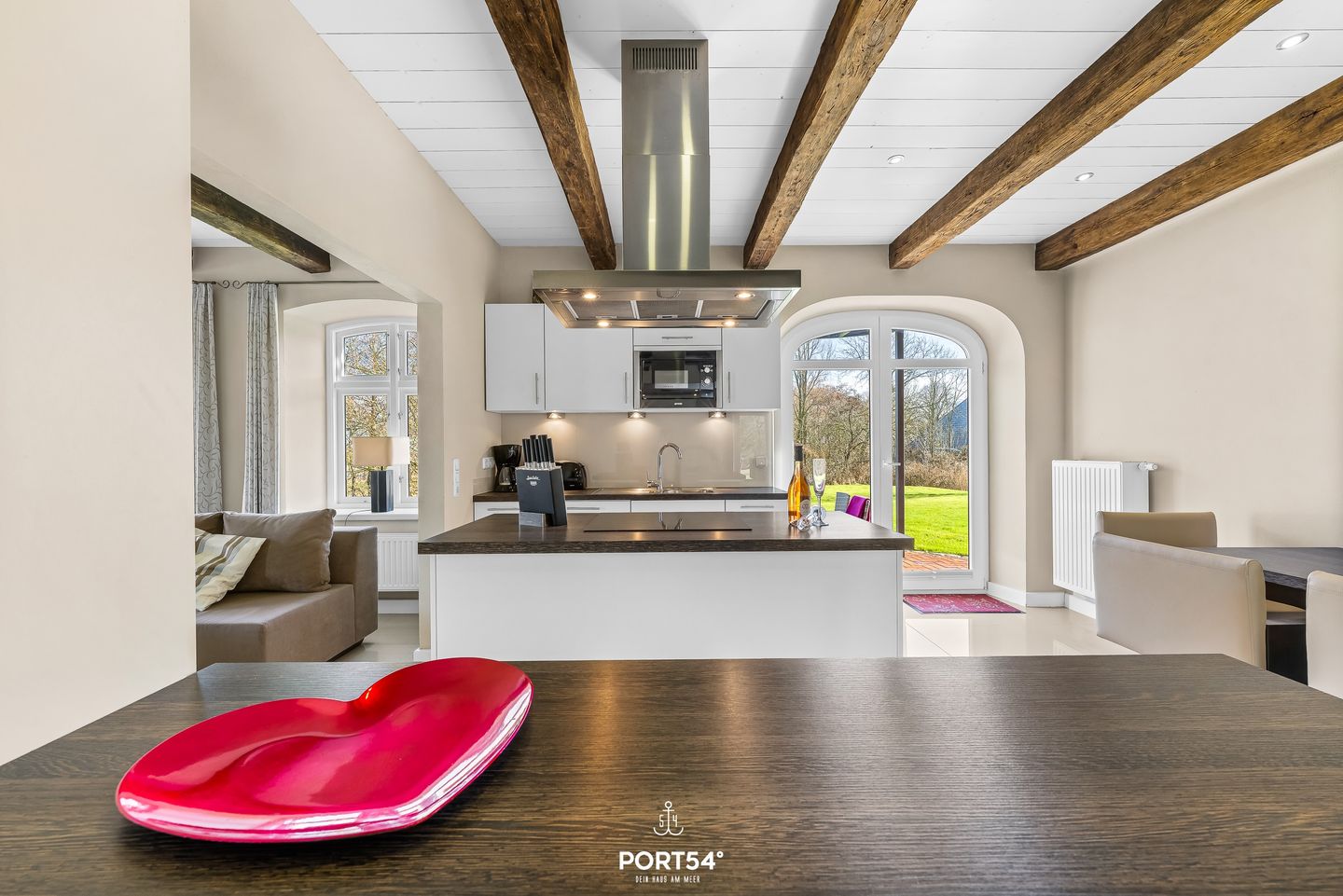 Die offene Küche ist vollständig ausgestattet und auf einen praktischen Urlaubsalltag ausgerichtet: Ceranherd, Backofen, Mikrowelle, Kühlschrank, ein separater Gefrierschrank, Spülmaschine sowie Wasserkocher, Toaster und Kaffeemaschine sind vorhanden, ebenso Küchenutensilien, Geschirr und Besteck. Im Badezimmer erwarten Sie neben dem WC und Waschbecken ein Spiegel, Kosmetikspiegel, Fenster sowie ein Haartrockner; warmes Wasser ist selbstverständlich verfügbar.