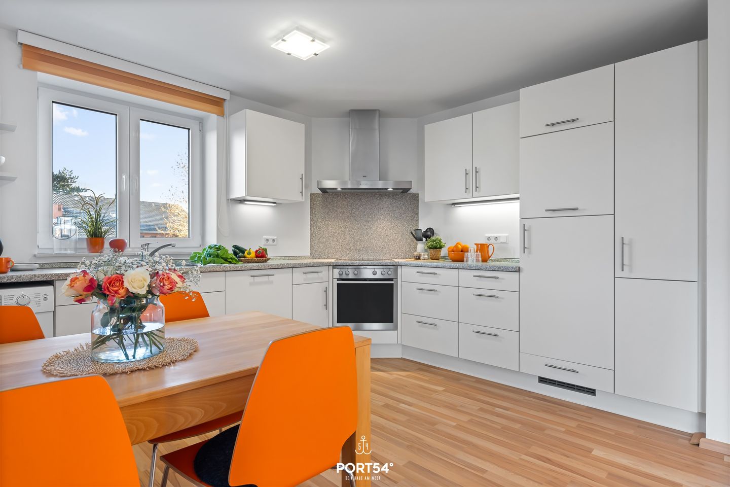 Das Herzstück der Wohnung ist das großzügige Wohnzimmer mit Sofaecke, Sessel, Satelliten-TV, DVD-Player und einer Auswahl an Büchern sowie Gesellschaftsspielen. Ein Esstisch im offen gestalteten Wohn- und Essbereich lädt zu gemeinsamen Mahlzeiten ein. Die offene Küche ist mit Ceran-Herd, Backofen, Spülmaschine, Kühlschrank mit Gefrierfach, Mikrowelle, Kaffeemaschine, Wasserkocher, Toaster, Sandwichmaker, Mixer und umfassenden Küchenutensilien ausgestattet – perfekt, um alles von schnellen Snacks bis zu aufwendigen Mahlzeiten zuzubereiten.