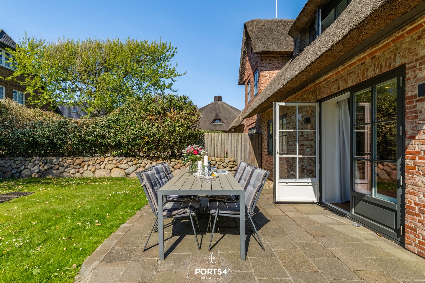 Auch der Außenbereich lädt zum Verweilen ein. Garten, Terrasse und Liegewiese bieten viel Platz, um die frische Nordseeluft zu genießen oder einen sonnigen Nachmittag im Grünen zu verbringen. Von hier aus genießen Sie einen Blick ins Grüne sowie einen eingeschränkten Meerblick.
