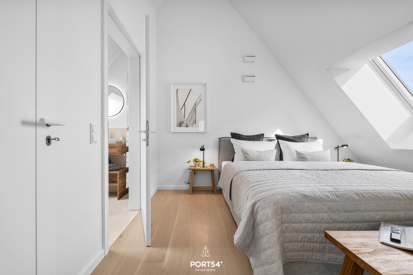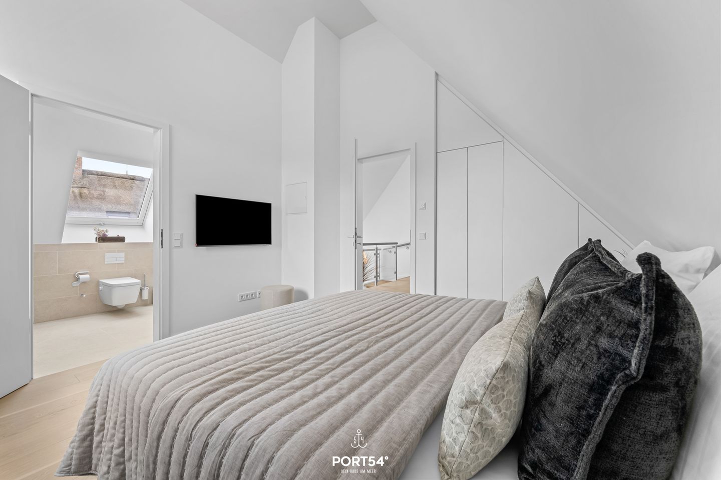 Besondere Wohlfühlmomente bietet die private Finnische Sauna mit angrenzender Dusche, während die Fußbodenheizung im gesamten Haus für ein angenehmes Raumklima sorgt. Die Badezimmer sind hochwertig ausgestattet und verfügen über zwei bodengleiche Duschen. Ergänzt wird dies durch moderne Waschbecken, WCs, Spiegel, Kosmetikspiegel und Haartrockner. Bettwäsche, Handtücher sowie eine Erstausstattung sind bereits inklusive.