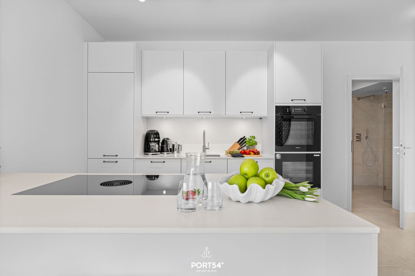 Die moderne, offen integrierte Küche bietet alles für einen perfekten Kochabend. Sie verfügt unter anderem über ein Induktionskochfeld, Backofen, Mikrowelle, Weinkühlschrank, Geschirrspüler sowie einen Kühlschrank mit Gefrierfach. Ergänzt wird die Ausstattung durch Wasserkocher, Toaster, Kaffeemaschine und eine Nespresso-Espressomaschine. Der angrenzende Essbereich mit Esstisch schafft den perfekten Rahmen für gemeinsame Mahlzeiten.