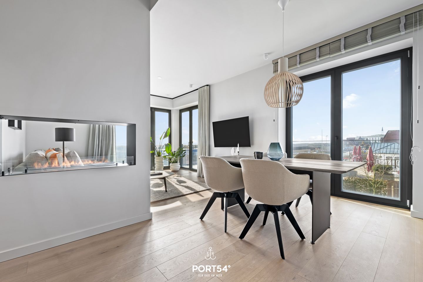 Die Wohnung verfügt über zwei stilvolle Schlafzimmer, die zum Entspannen und Erholen einladen. In einem der beiden ist ein Doppelboxspringbett der Marke Schramm (180x200cm), während in dem anderen Schlafzimmer ein Schlafsofa (160x200cm) für Sie zur Verfügung steht. Ein modernes Badezimmer mit einer bodengleichen Dusche bietet zusätzlichen Komfort und Luxus während Ihres Aufenthalts. Das Herzstück der Oceanview Suite ist der großzügige Wohnbereich, der offen zur voll ausgestatteten SieMatic Küche gestaltet ist. Hier finden Sie alles, was Sie für die Zubereitung Ihrer Mahlzeiten benötigen, einschließlich eines Induktionsherds, Backofens, Geschirrspülers und Weinkühlschranks. Außerdem finden Sie in der Küche einen Quooker, damit lässt sich problemlos heißes Wasser, sowie Sprudelwasser erzeugen. Der Essbereich bietet Platz für ein gemeinsames Essen und blickt auf den gemütlichen Wohnraum mit einem offenen Ethanol-Kamin, der für eine behagliche Atmosphäre sorgt.