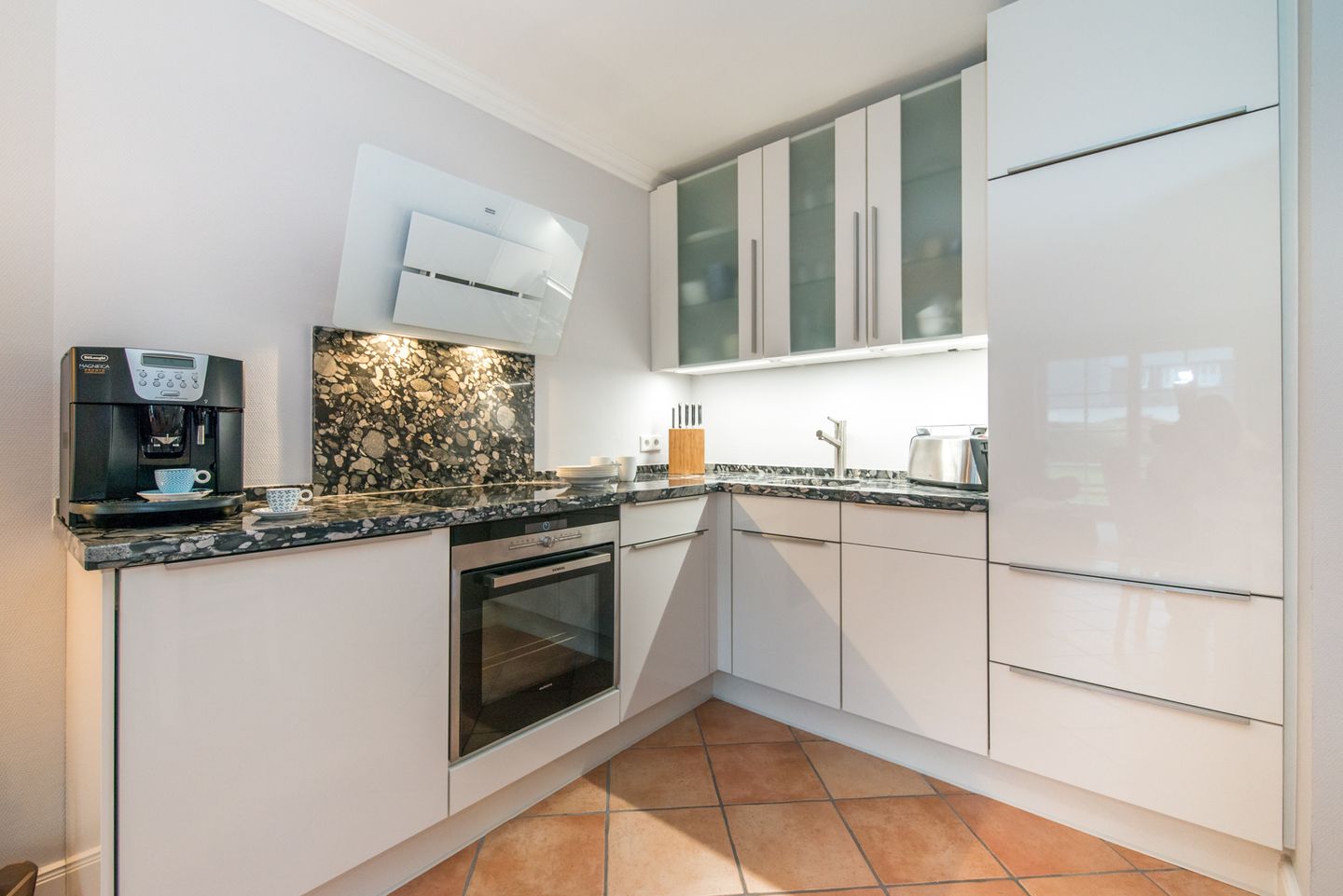 Die ebenerdige Wohnung verfügt über einen ansprechend gestalteten Wohnbereich mit Sofa und Essbereich. Die offene Küche grenzt unmittelbar an das Wohnzimmer an und ist mit modernen Geräten wie Herd, Backofen, Kühlschrank (mit Gefrierfach), Spülmaschine, Toaster sowie einem Kaffeevollautomaten ausgestattet. Geschirr, Besteck und Kochutensilien sind selbstverständlich vorhanden, sodass Sie sich mühelos selbst versorgen können. Die Essgruppe lädt zum entspannten Frühstück oder zu einem gemütlichen Abendessen ein.