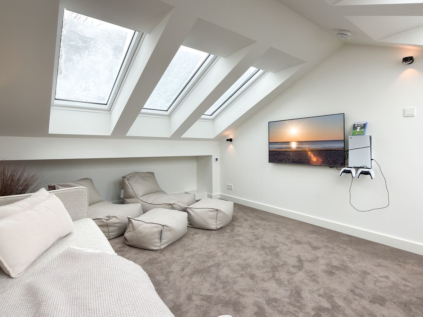 Mit einer großzügigen Grundfläche von 54 m² bietet die Ferienwohnung ausreichend Platz für bis zu 4 Personen (2 Erwachsene + 2 Kinder). Die lichtdurchfluteten Räume sind über zwei Etagen geschmackvoll eingerichtet, und die offene Küche, die zum Wohnzimmer hin gestaltet ist, lädt dazu ein, kulinarische Köstlichkeiten zuzubereiten. Hier findest du alle notwendigen Geräte wie einen Elektro-Herd mit Induktionskochfeld, einen Backofen, eine Spülmaschine, einen Kühlschrank mit Gefrierfach und vieles mehr. Das Schlafzimmer ist mit einem gemütlichen Doppelbett, einem Kleiderschrank vom Tischler, Verdunkelungsmöglichkeiten und einem Smart TV 43'' ausgestattet. In der zweiten Etage findest du für zwei Kinder oder einen Erwachsenen eine gemütliche Schlafcouch (140x200 cm), einen Smart TV mit 50'' und eine Sony Playstation mit 2 Controllern sowie FIFA für deine Unterhaltung.